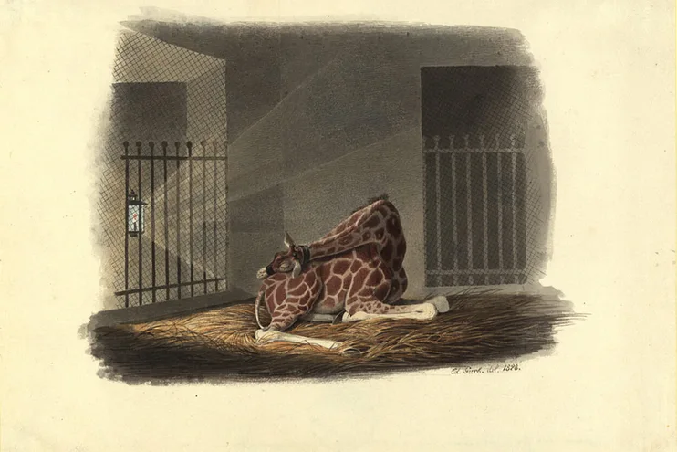 Im Tiergarten selbst, bei der „Schieraffe“ war im Hochsommer 1828 der Andrang gewaltig. Acht Grenadiere hatte man extra zum Behuf abkommandiert, den Ansturm aufs behufte Tier zu kanalisieren und diesem Ordnung zu geben. Dem Tier ging es nicht gut. Auf zeitgenössischen Abbildungen ist eine mehr als nur leichte Fehlstellung der Hinterbeine zu detektieren. Eine Folge der gänzlich ungewohnten Strapazen des Marsches? Nicht ganz von der Hand zu weisen. Die Giraffe fraß immer zögerlicher, immer weniger, kränkelte mehr und mehr. Es kam, wie es kommen musste. Am 20. Juni 1829 verendete sie. „Abmagerung in Folge eines Knochenfraßes am Gelenkkopf des Hinterschenkels“, lautete lakonisch der Obduktionsbefund.
