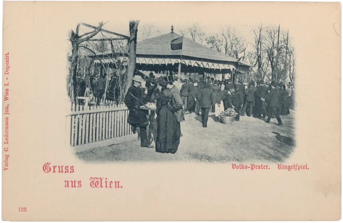 Bei der „Ringelspiel“-Ansichtskarte griff Ledermann, wie regelmäßig, auf diese Lösung zurück (Abb. B). Dass man diese Fotografie in anderer Weise veröffentlichen konnte, führte der Dresdner Verleger und Drucker Edgar Schmidt vor Augen, indem er das Bild nach drei Seiten hin bis zum Rand zog und unten durch Freistellen einzelner Figuren einen unregelmäßig, schräg nach oben laufenden Abschluss schuf (Abb. C). In der Zusammenschau mit einem fotografischen Abzug (Abb. A) erkennt man den Beschnitt des Motivs (besonders deutlich erkennbar am Schatten eines Menschen, der rechts unten ins Bild hineinragt). Darüber hinaus hat sich, wie so häufig, als eine Spur des Angerer’schen Archivs die Negativnummer („77“) in der Ansichtskarte erhalten (siehe vor allem Abb. B). Diese nicht wegzuretuschieren musste der gegenüber solchen Druckprodukten oft mangelhaft obwaltenden Sorgfalt geschuldet sein. Denn viele der Karten Ledermanns waren nachgefragt. Zu erkennen ist das, sobald man etwa zwei Ansichtskarten vom „Ringelspiel“ (Abb. B und D) miteinander vergleicht. Sie erscheinen bloß auf den ersten Blick ident, differieren jedoch sachte im Bildausschnitt wie im Text. Die minimalen Unterschiede verweisen auf unterschiedliche Drucke und damit Auflagen. Eine Lichtdruckplatte vernutzte sich nach 500 bis 1000 Stück, sodass für einen nochmaligen Druck eine neue Platte angefertigt werden musste – womit für Abweichungen gesorgt war.