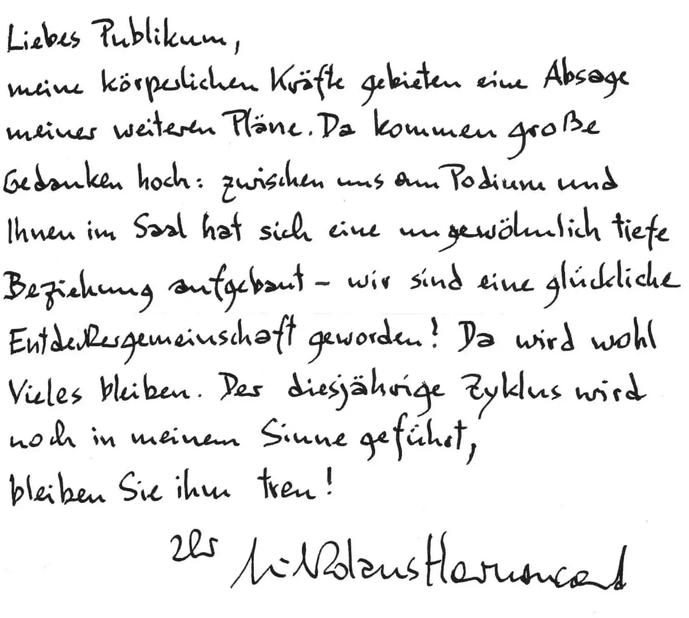 In seinem Abschiedsbrief an das Publikum im Musikverein am 5. Dezember 2015, dem Konzert, dass er aus gesundheitlichen nicht mehr selbst dirigieren konnte, formuliert er erstmals den Begriff der Entdeckergemeinschaft – der Austausch zwischen Podium und Saal als gemeinschaftliches Erlebnis.