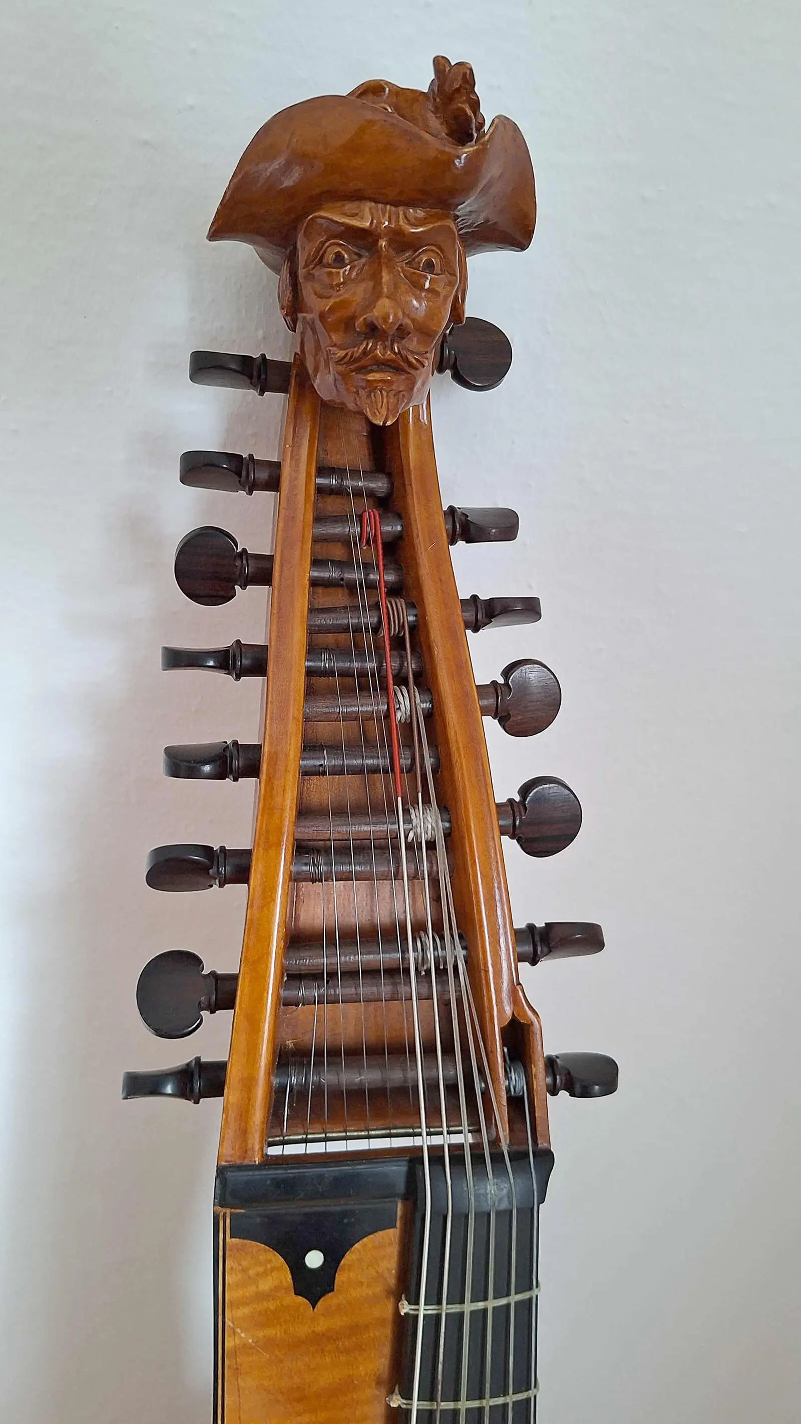 Die Josefstädter Ausstellung präsentiert auch erstmals ganz persönliche Einblicke in die Werkstatt Harnoncourts Dank der Leihgaben der Familie: Der Schnitzer und Zeichner Harnoncourt ist der Öffentlichkeit bisher weitgehend unbekannt. Besonders eindrucksvoll sind die von Nikolaus Harnoncourt gestalteten Album-Titelblätter, die in seiner charakteristischen Grafiksprache die wichtigsten Ereignisse jedes Jahres festhalten. Diese Alben wurden alljährlich als Familienchronik erstellt. Er schnitzte sowohl Handpuppen für ein Kasperltheater für die Kinder, als auch kunstvolle Sessellehnen im Renaissancestil, die natürlich keine Zierde sind, sondern den Charakter und die Eigenschaften des Sesselbesitzers widerspiegeln. Auch den Kopf seines Barytons schnitzte er selbst. Raten Sie doch mal, wen dieser Kopf darstellen könnte! Das Baryton ist eine Kopie eines Instruments aus der Musikinstrumentensammlung des KHMs. Eine offene, restaurierungsbedürftige Violine erinnert daran, in welchem Zustand die Instrumente oft zu ihnen kamen. Vieles musste restauriert und rekonstruiert werden. Auch dabei legte der begabte Holzarbeiter Nikolaus Harnoncourt oft selbst Hand an.