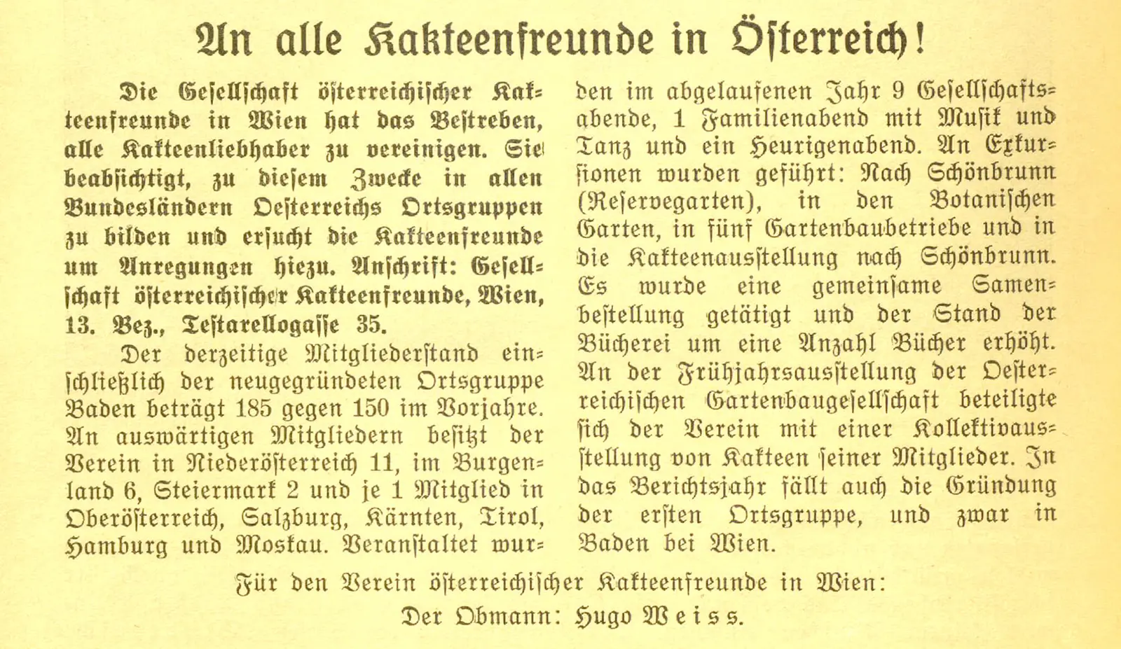 Während sich die Kakteenliebhaberei in der Biedermeierzeit auf eine recht schmale Gesellschaftsschicht beschränkte (auch wegen den damit verbundenen Beschaffungsschwierigkeiten), entwickelte sie sich nach dem Ersten Weltkrieg zu einem Massenphänomen: „Kaum je ist eine Pflanzenfamilie im Laufe weniger Jahre in solchem Maße volkstümlich geworden wie die der Kakteen.“ (Kupper, 1928) Kakteen und andere Sukkulenten fanden sich nun auf den Fensterbrettern bescheidener Mietwohnungen genauso wie in den Salons und Wintergärten eleganter Domizile. Gewiss waren sie für manche nicht mehr als ein modisches Dekorationsobjekt oder eine vorübergehende Spielerei. Doch viele gingen diesem Steckenpferd mit Leib und Seele nach, und befassten sich eingehend mit Zucht und Pflege. Davon zeugen nicht nur zahlreiche populärwissenschaftliche Publikationen – vom opulent bebilderten Prachtband bis zur preisgünstigen Broschüre war für alle etwas dabei –, sondern auch die Gründung von Fachorganisationen. 1925 wurde innerhalb der Österreichischen Gartenbaugesellschaft eine eigene Fachgruppe für Kakteenkunde gegründet, 1928 die Wiener Ortsgruppe der Deutschen Kakteengesellschaft, 1931 die Gesellschaft Österreichischer Kakteenfreunde. Sie umfassten hunderte Mitglieder und organisierten zahlreiche Ausstellungen, wie etwa im Gewächshaus des Wiener Esterhazyparks, im Schwarzenbergpark oder im Sonnenuhrhaus von Schönbrunn.