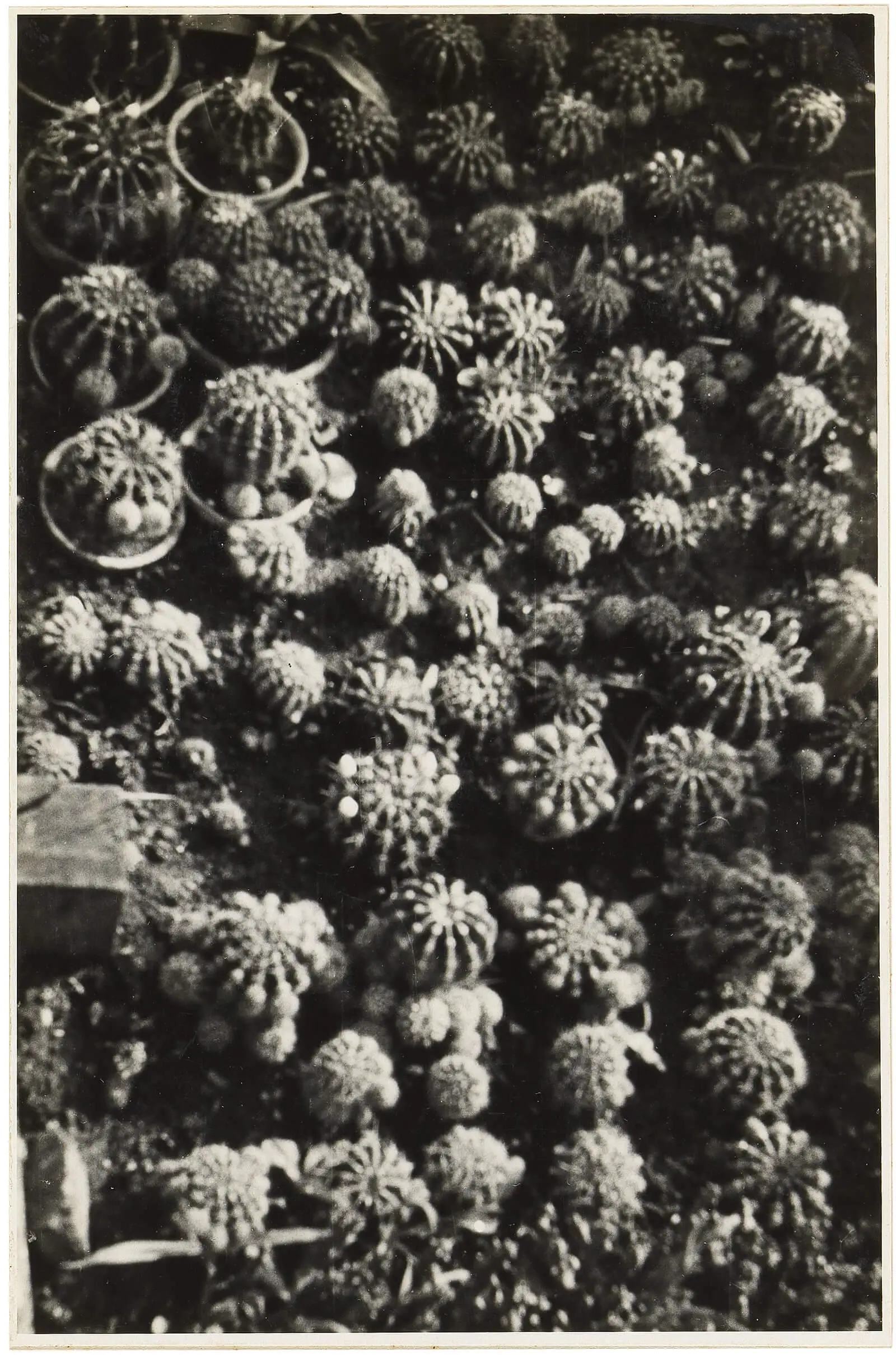 Ein anonymes Amateurfoto, aufgenommen im Jahr 1930 in einem Wohnraum: Verschiedene Kakteen vor einem improvisierten hellen Hintergrund, der die Silhouetten der Pflanzen gut zur Geltung bringt. Eine eher ungewöhnliche Inszenierung, wenn man bedenkt, dass damals die meisten „Knipser“ aus technischen Gründen hauptsächlich im Freien fotografierten und sich weitgehend auf die als erinnerungswürdig geltenden Momente und Sujets wie Familienleben, besondere Anlässe, Ausflüge und Reisen konzentrierten. Wieso also dieser thematische „Ausreißer“ im Familienalbum?