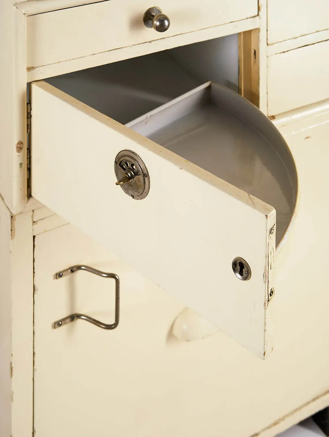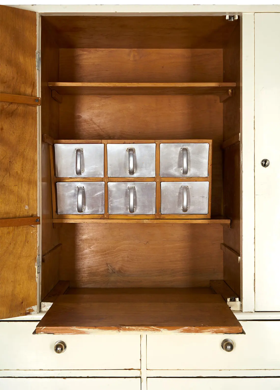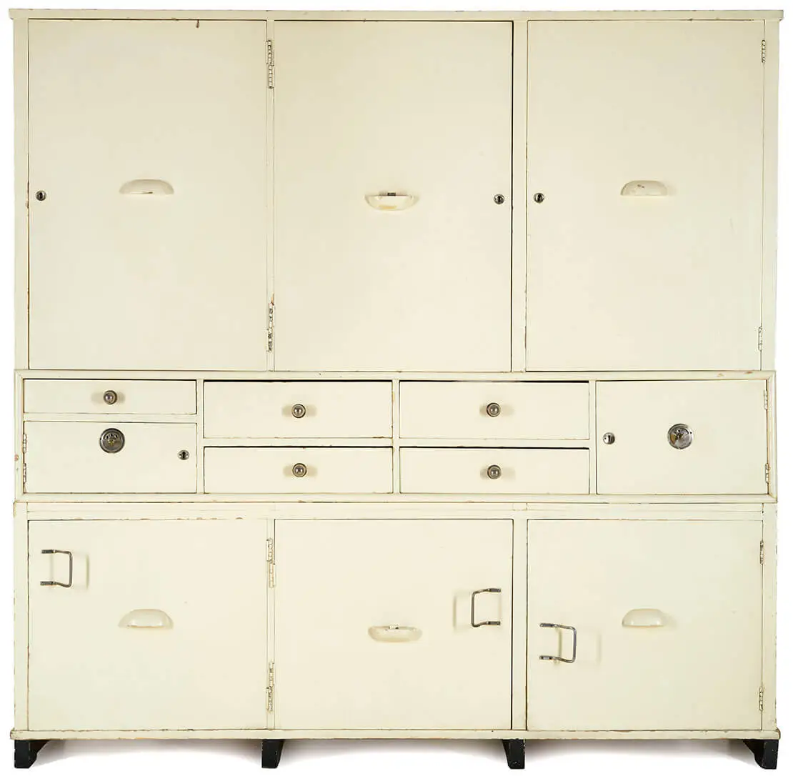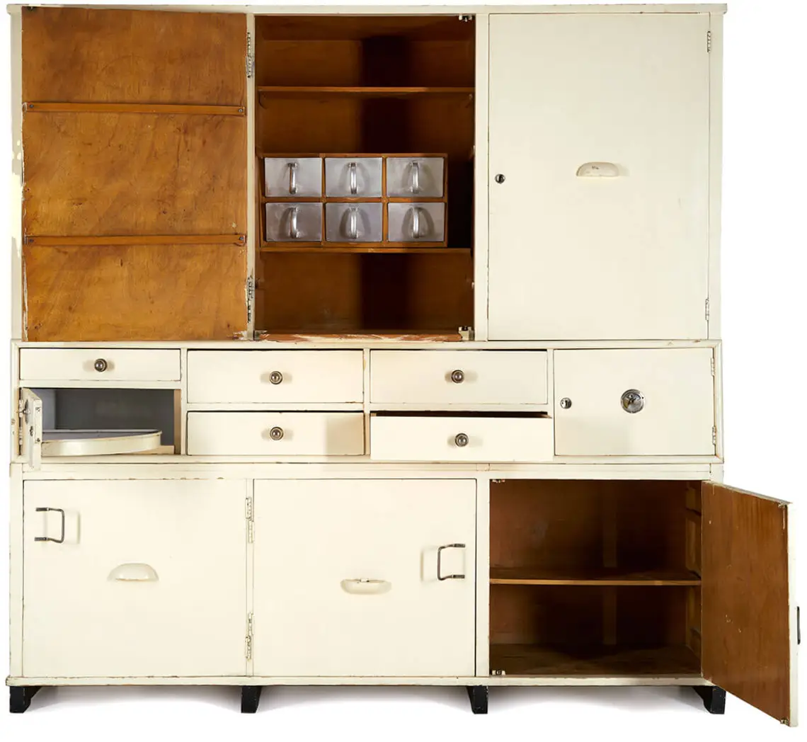 Neben Architektur und Technik galt auch die Küchenmöblierung als ein wesentlicher Faktor beim Bestreben, die Hausarbeit zu erleichtern. Empfohlen wurden Einbaumöbel ebenso wie nach rationellen Kriterien gestaltete Einzelmöbel. Zu letzteren zählten unter anderem die patentierten und standardisierten, in verschiedenen Breiten erhältlichen Küchenschränke der Wiener Firma Siegfried Erdö, die in dieser Hinsicht als vorbildlich galten und mit denen auch einige Häuser der Werkbundsiedlung ausgestattet waren. Es handelte sich dabei um kombinierte Geschirr- und Vorratsschränke, wie sie damals – oft nach amerikanischem Vorbild – stark propagiert wurden, insbesondere für kleinere Wohnungen, die über keine eigene Speisekammer verfügten. Die Erdö-Schränke enthielten unter anderem Schütten aus Aluminium für die Aufbewahrung von Lebensmitteln wie Mehl oder Linsen, und sie verfügten über ein ausgeklügeltes Türsystem, das auch auf kleinstem Raum gut handhabbar war. Zudem waren die Fronten glatt und ohne jeglichen Zierrat ausgeführt und daher leicht und schnell zu reinigen.