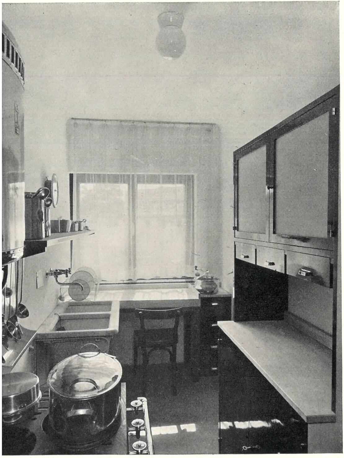 So wie die Siedlung insgesamt bot auch der hauswirtschaftliche Bereich ein eher heterogenes Bild, wenngleich einige Haupttendenzen auszumachen sind. Die Häuser waren teils für eine Haushaltsführung mit, teils ohne Dienstpersonal konzipiert, was sich jeweils sowohl in der Ausstattung als auch in der Raumorganisation niederschlug. Die Küchen waren durchgängig mit Steinholzestrich versehen und entweder als reine Arbeitsküchen, Wohn- oder Essküchen (Josef Frank hielt letztere für die zeitgemäßesten) ausgebildet, die Grundflächen in den meisten Fällen eher knapp bis sehr knapp bemessen und somit dem internationalen Trend zur Kleinküche folgend. Es scheint, als ob aus dem Ideen- und Erfahrungsschatz der vorangegangenen Jahre geschöpft wurde, die Präsentation aber keine innovativen Küchenkonzepte beinhaltete. Ernst Lichtblau etwa realisierte in seinem ohne Hausgehilfin gedachten Haus Nr. 41 eine Wohnküche, die aus einem kleinen, mit einem Vorhang abtrennbaren Arbeits- sowie einem Essbereich bestand. Mit dem Wohnraum war sie durch eine große Glasschiebetür verbunden, die den Blickkontakt mit diesem ermöglichte, die Ausbreitung von Kochdünsten aber verhinderte. Dies begünstigte – ebenso wie die gartenseitige Orientierung der Küche – die Beaufsichtigung von Kindern.