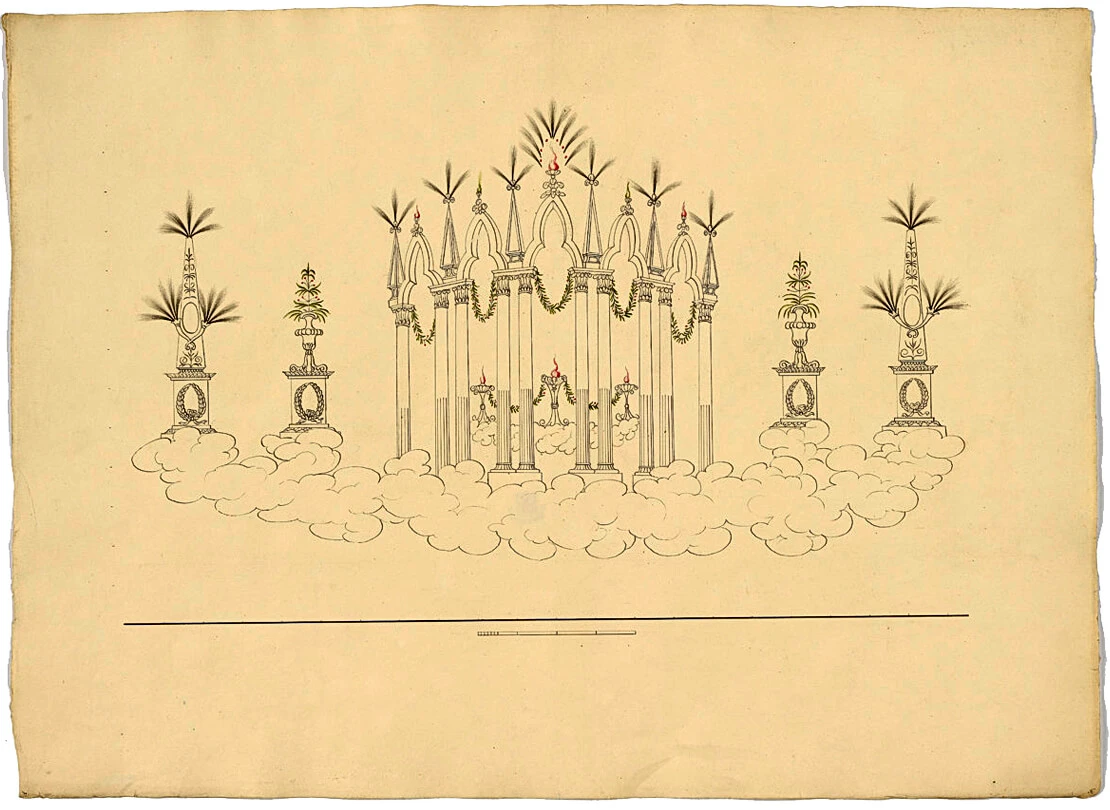 Szenisches Feuerwerk, kolorierter Kupferstich (Ausschnitt), um 1820, Wien Museum