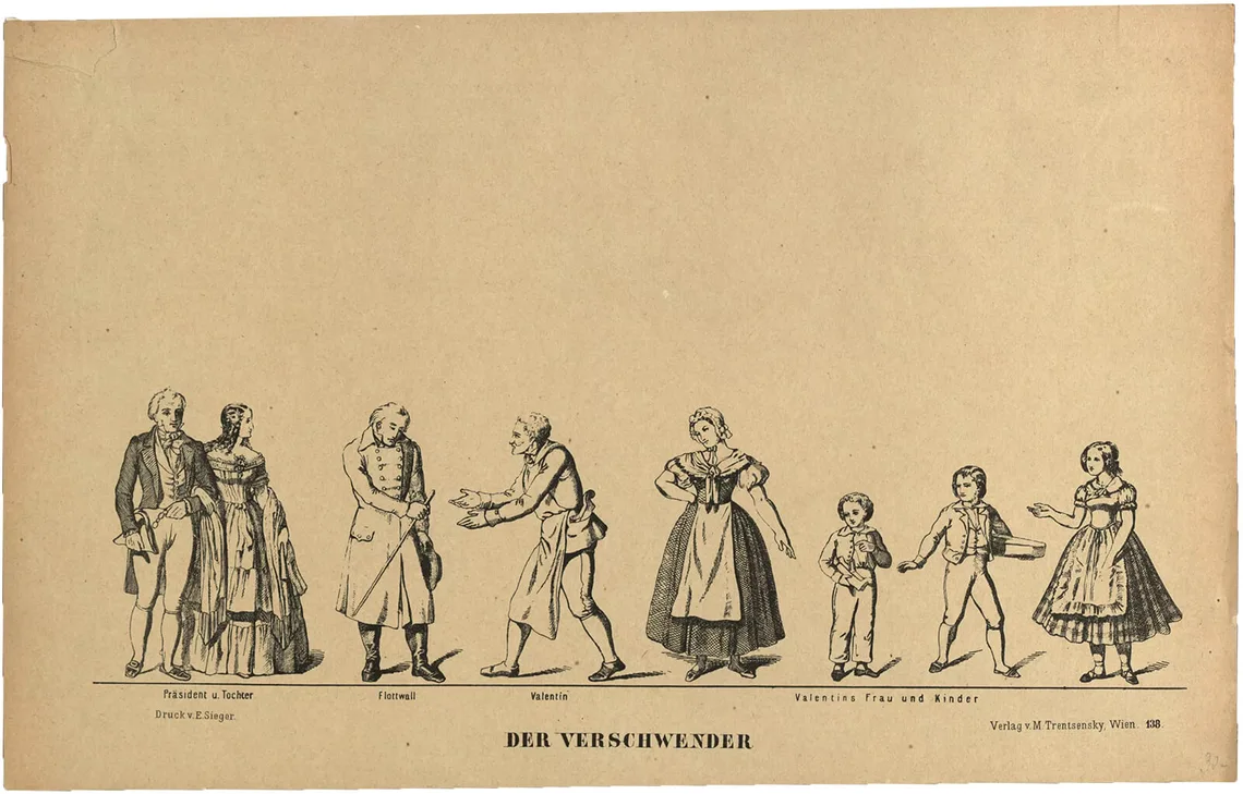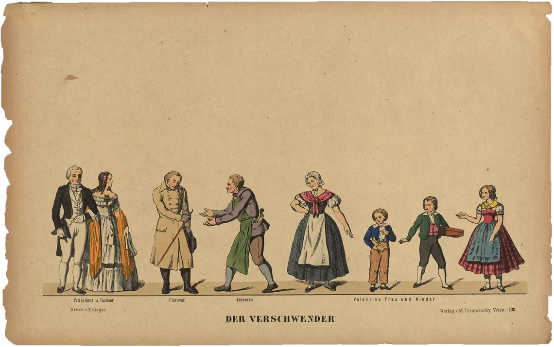 Das Papiertheater war in der Biedermeierzeit in nahezu allen bürgerlichen Haushalten vorzufinden. Auf kleinen Bühnen aus Holz und Papier wurden klassische oder damals beliebte Stücke nachgestellt, wodurch für ein unterhaltsames familiäres Zusammensein und zugleich für literarische Bildung gesorgt war. Erste Miniaturbühnen gab es bereits zu Beginn des 19. Jahrhunderts in England und Deutschland. Guckkästen, Mandlbögen und Krippen gelten als Vorläufer des Papiertheaters. 1825 erschien bei dem Verleger Heinrich Friedrich Müller in Wien am Kohlmarkt ein „Figuren-Theater für Kinder“, das aus dem Etui gezogen „augenblicklich aufgestellt“ und zur „Belustigung den Kindern vorgespielt“ werden konnte.