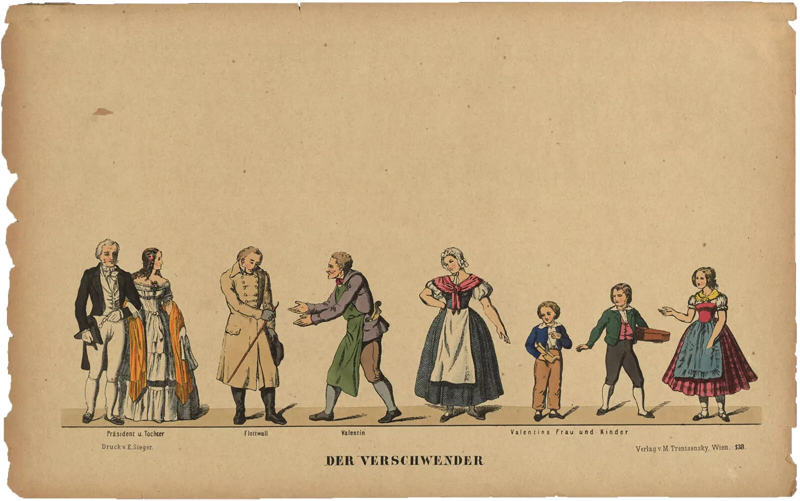 „Seit einer Reihe von Jahren bestrebt, bei der Herausgabe der mannigfachsten Werke für die Kinderwelt Angenehmes und Nützliches in zweckmäßiger Verbindung zu bieten, …“: Mit diesen Worten warb der Wiener Verleger Matthäus Trentsensky im Dezember 1849 in der „Wiener Zeitung“ für seine vor den Feiertagen erscheinenden Mandlbögen, die wohl auch in seiner Geschäftsauslage zu sehen waren. Trentsensky war bekannt für seine qualitätsvollen Bilderbogen, die die Kinder selbst bemalen und ausschneiden konnten. Dieses günstige Spielzeug aus Papier zählte zu seinen erfolgreichsten Produkten. Passend zur Vorweihnachtszeit sind nun mehr als 900 Mandlbögen – vorwiegend Figurinen für das Papiertheater – in der Online Sammlung des Wien Museums zu finden.