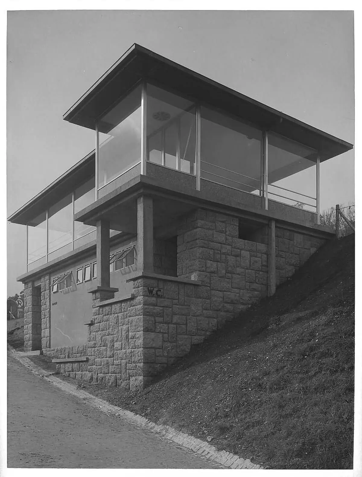 Ein Prestigeprojekt des „Schwarzen Wien“ war die Höhenstraße, die vom Atelier Gerlach vom Beginn der Planungen über die Bauarbeiten bis zur Fertigstellung begleitet wurde. Während die Fotografien der Straßenbauarbeiten im Wiener Stadt- und Landesarchiv verwahrt werden, finden sich im Wien Museum Aufnahmen vom Bau des Ausflugsrestaurants, das 1936 nach Entwürfen von Erich Boltenstern und Leopold Ponzen erbaut wurde. Während von diesem wichtigen Bau der Zwischenkriegszeit nach einer unsensiblen Sanierung kaum mehr etwas erkennbar ist, steht das ehemalige Buswartehäuschen bis heute vergessen, aber (noch) weitgehend intakt am Rand des ausgedehnten Parkplatzes. In einer Aufnahme, die den Bau vom abschüssigen Weg in Richtung Leopoldsberg zeigt, übersetzte Martin Gerlach die klare Geometrie der aus Naturstein, Stahlbeton, Glas und Eisen bestehenden Architektur in eine beinahe konstruktivistische Bildkomposition.