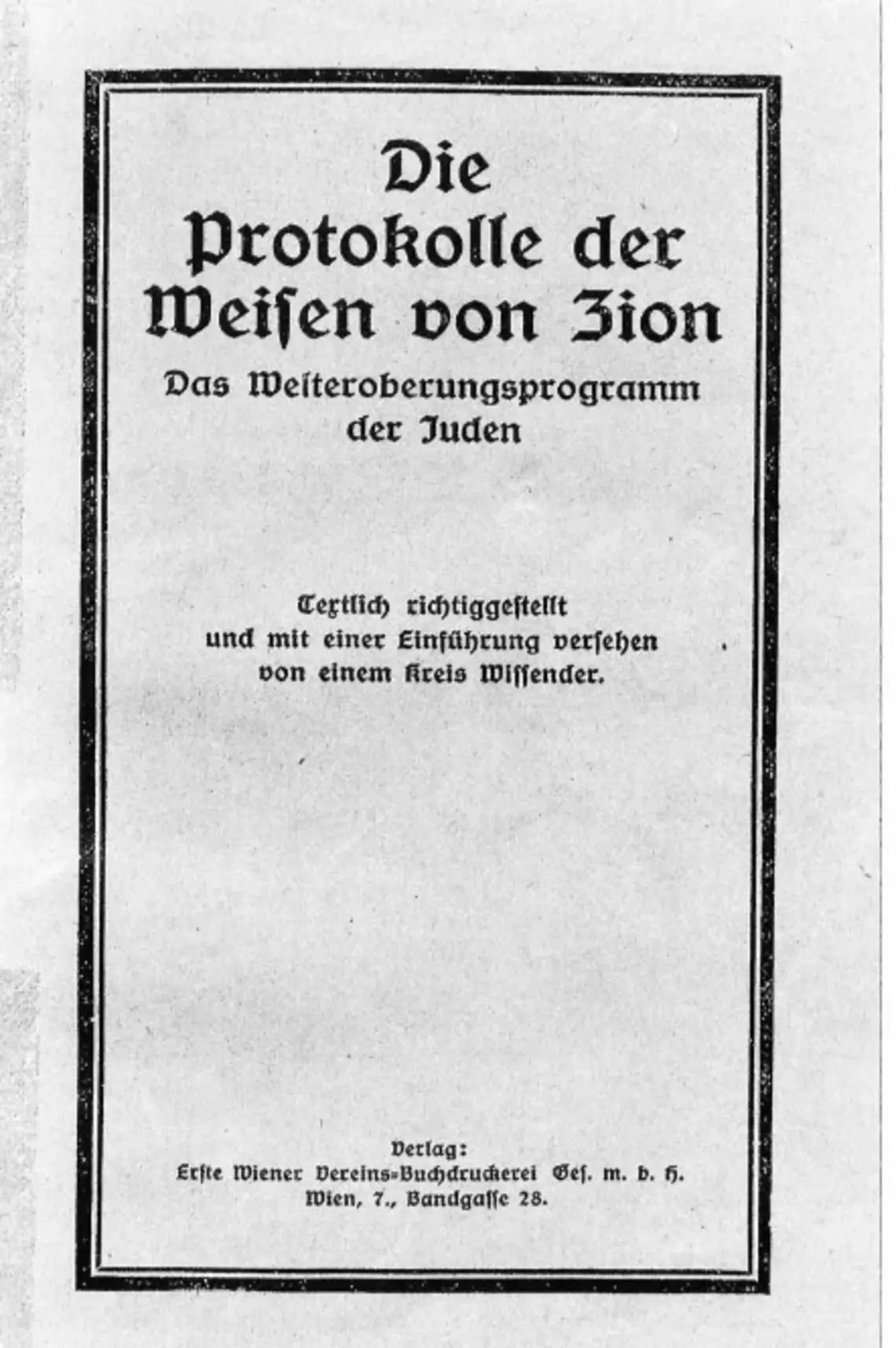 Die Protokolle der Weisen von Zion (auch Geheimnisse der Weisen von Zion, Zionistische Protokolle, Protokolle Zions) geben vor, eine weltumspannende Verschwörung jüdisch-freimaurerischer Mächte zu belegen. 2 Das fiktive „Dokument“ – ein Text von etwa 60 bis 80 Seiten, der in 24 Abschnitte („Protokolle“) gegliedert ist – gibt anscheinend eine Rede wörtlich wieder, die ein anonymer jüdischer Sprecher vor einer nicht näher gekennzeichneten Zuhörerschaft an einem ungenannten Ort zu einem ungenannten Zeitpunkt gehalten hat. In dieser Rede werden – gleichsam als ungeschütztes Selbstbekenntnis – die geheimen Methoden und Ziele einer angeblich jahrhundertealten jüdisch-freimaurerischen Verschwörung gegen die gesamte nichtjüdische Welt dargelegt. Mit zynischer Offenheit beschreibt der Redner Strategie und Taktik, mit der die angeblichen Verschwörer sämtliche Bereiche des öffentlichen Lebens unterwandern und ihren Zielen unterwerfen wollen, wobei sie sich der internationalen Gemeinschaft der Freimaurer bedienen. So sollen die Völker durch Parteienhader und Klassenkämpfe, Kriege und Revolutionen, Hungersnöte und Seuchen zermürbt, durch die „Macht des Goldes“ und durch Spekulationsgeschäfte wirtschaftlich ruiniert, mit dem „tödlichen Gift“ des Liberalismus infiziert sowie durch Rationalismus, Materialismus und Atheismus – genannt werden die Lehren von Darwin, Marx und Nietzsche – moralisch zersetzt werden. Auf diese Weise in Anarchie und Elend getrieben, würden die Nichtjuden aus Sehnsucht nach Sicherheit und Frieden „den Juden“ schließlich die gesamte Macht anbieten.