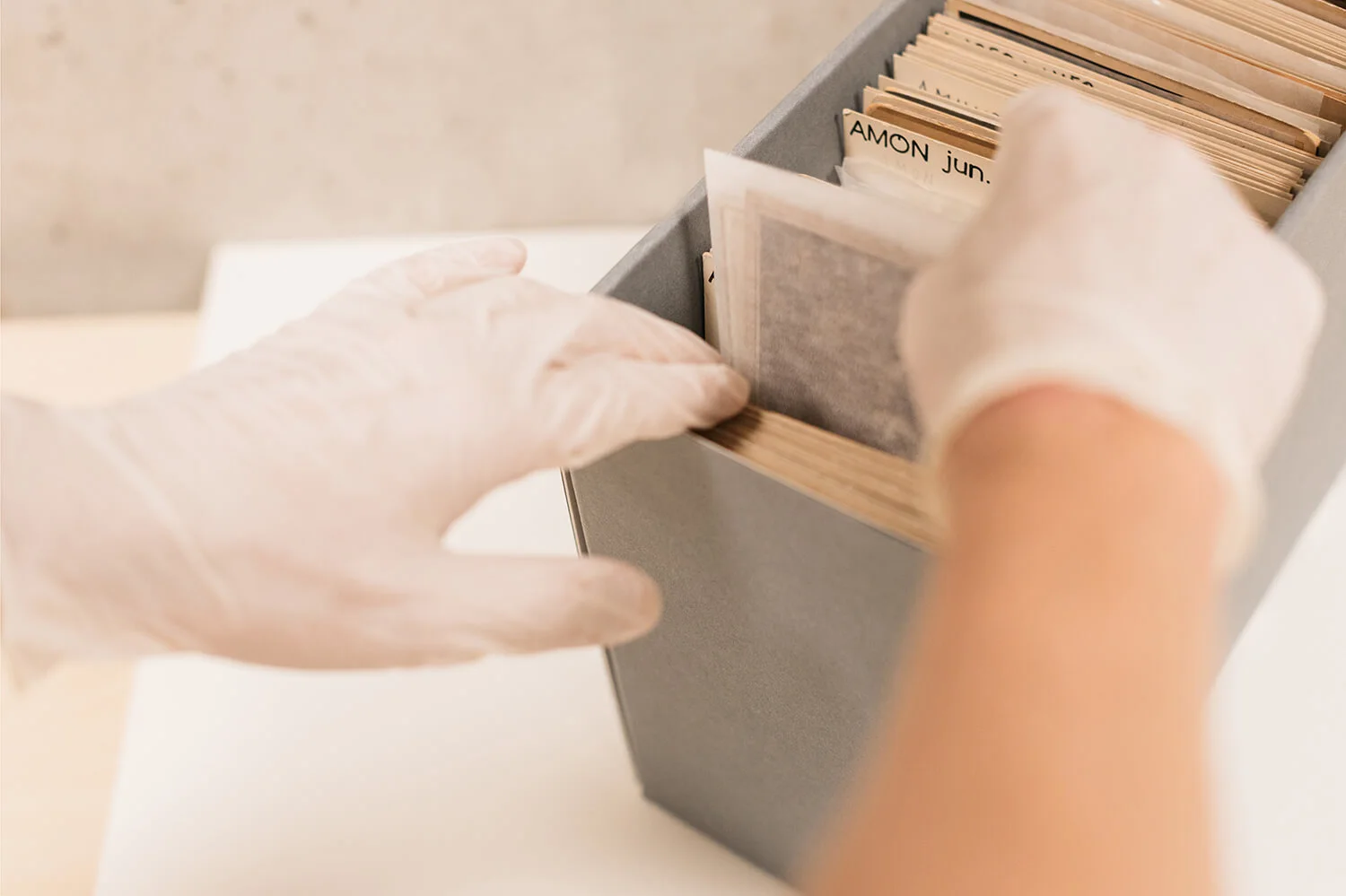Über die unterschiedlichen Charakteristika von Original und (digitaler) Reproduktion kann man ganze Bände schreiben, Andreas Winkel hebt ein paar zentrale Aspekte hervor: „Wer täglich mit Objekten umgeht weiß, dass viele Erfahrungen, die vor dem Original gemacht werden können, anhand einer Reproduktion nicht nachvollziehbar sind. Wir reden da etwa von nicht in die Reproduktion übersetzbaren realen Größenverhältnissen, in denen die Betrachter:innen zum Objekt stehen, aber natürlich auch von Oberflächenbeschaffenheiten, die für die Wahrnehmung eines Objektes wichtig sind. Manche Feinheiten auf einer historischen Fotografie zum Beispiel lassen sich nur im Schräglicht erkennen, Prägestempel nur so lesen, Retuschen nur so nachvollziehen. Da hilft dann auch die digitale Vergrößerung nicht. Am Original führt somit kein Weg vorbei.“
