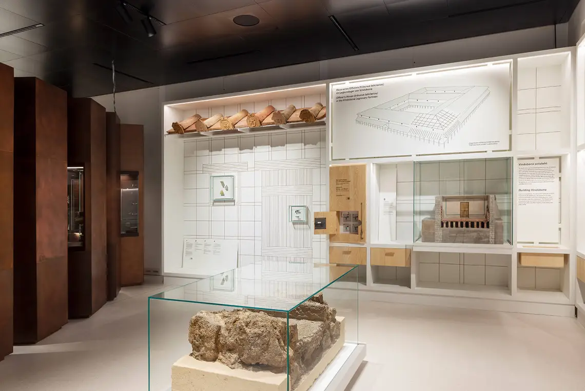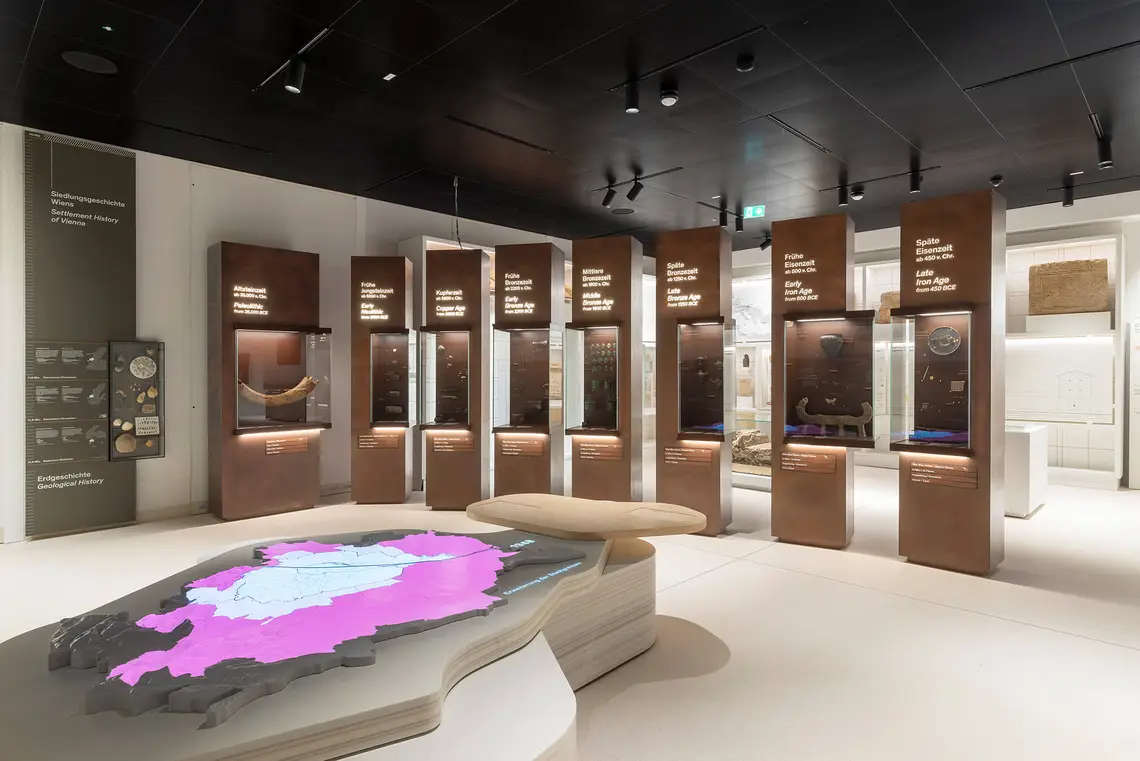 Dann schließen sich mehrere Vitrinen an, die die frühen Gesellschaften repräsentieren sollen. Jede Vitrine spiegelt eine Epoche wider. Das Kapitel ist zweigeteilt, weil man zunächst den Bereich hat, der vom Naturraum bis zur keltischen Zeit, bis zur späten Eisenzeit reicht. Dann geht man ins zweite Kapitel, das die römische Zeit und die Völkerwanderung behandelt. Wir wollen darin zeigen, dass das Gesellschaften sind, die auf unterschiedliche Weise mit ihrer Umgebung umgehen. Dabei stechen die Römer heraus, weil sie die erste urbane Gesellschaft im Wiener Raum waren.