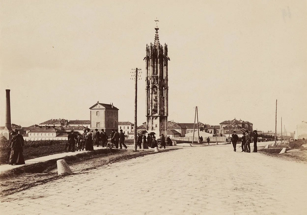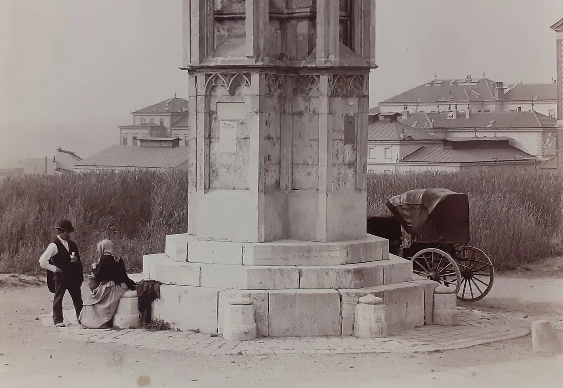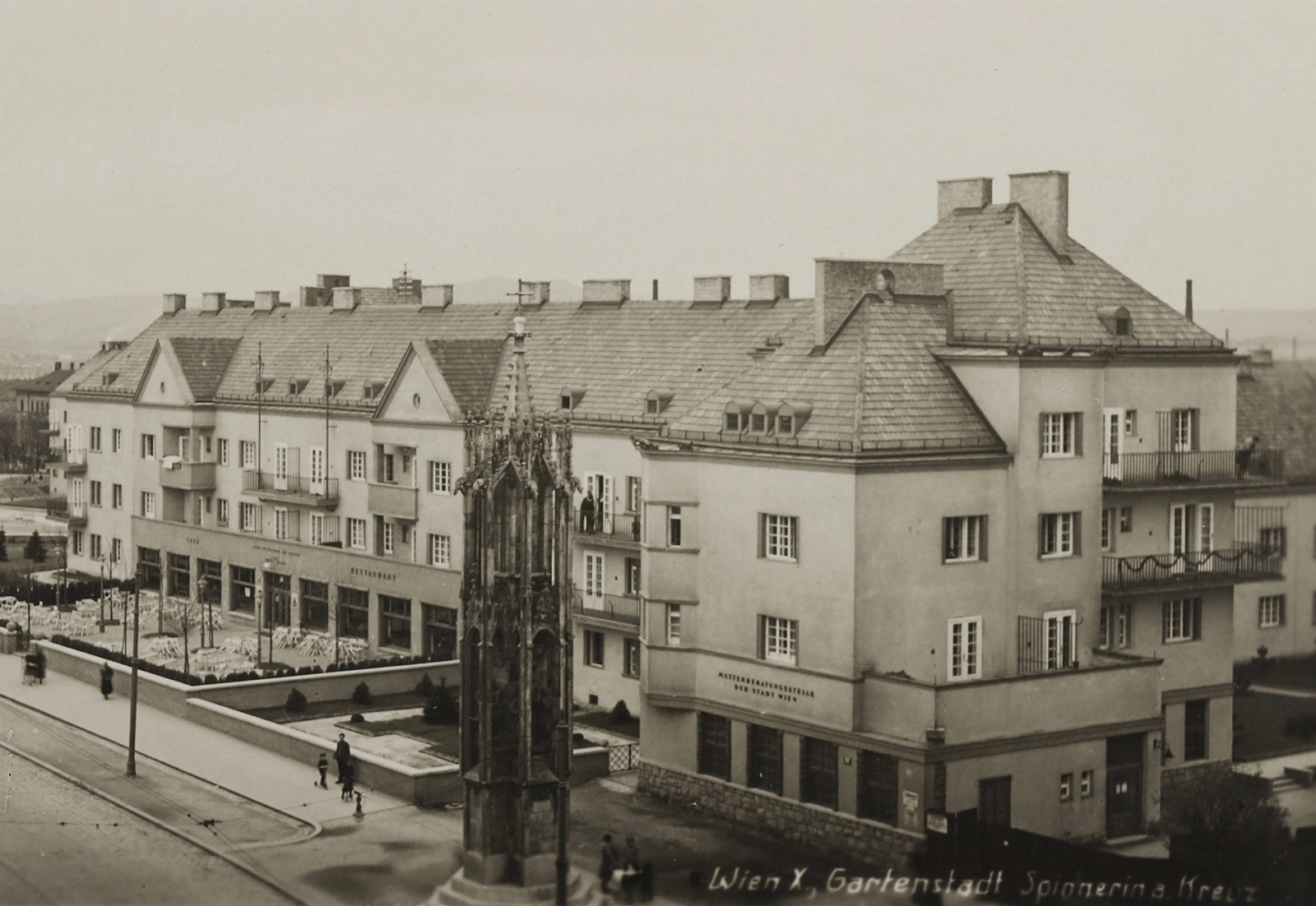 Noch 1880, nun im Medium der Fotografie, wird die „Spinnerin am Kreuz“ in dieser Form mit einer auf dem Stufenpodest sitzenden Figur vor dem Hintergrund der Stadt aufgenommen. Wer allerdings nur wenige Jahre später vor hier aus die Stadt betrachten wollte, wurde enttäuscht. Ab etwa 1892 belegen Fotografien, dass schon damals der Blick auf die Stadt durch die Verbauung entlang der Triester Straße (Kaiser-Franz-Josef-Spital, 1887–1892 errichtet) verunmöglicht worden war. Hatte man schon 1891 davon gesprochen, dass das Denkmal „eine seinem historischen Werthe entsprechende Umrahmung finden“ solle (Wiener Geschichtsblätter, 1891), konnte Hugo Hassinger im „Kunsthistorischen Atlas der Stadt Wien“ von 1916 nur mehr feststellen, dass der „ehemals berühmte Blick von dieser Höhe auf Wien“ längst verbaut sei, und musste wiederum fordern, dass für eine „würdigere Gestaltung der Umgebung“ dieses Denkmals zu sorgen sei. Tatsächlich wurde die „Spinnerin“ in den folgenden Jahren nur noch mehr eingeschnürt. Bei der Errichtung des „George-Washington-Hofes“ (1927–1930, damals noch „Spinnerin am Kreuz“ genannt) wurde, wie Zeitgenossen kritisch bemerkten, keine besondere Rücksicht auf das Denkmal genommen.