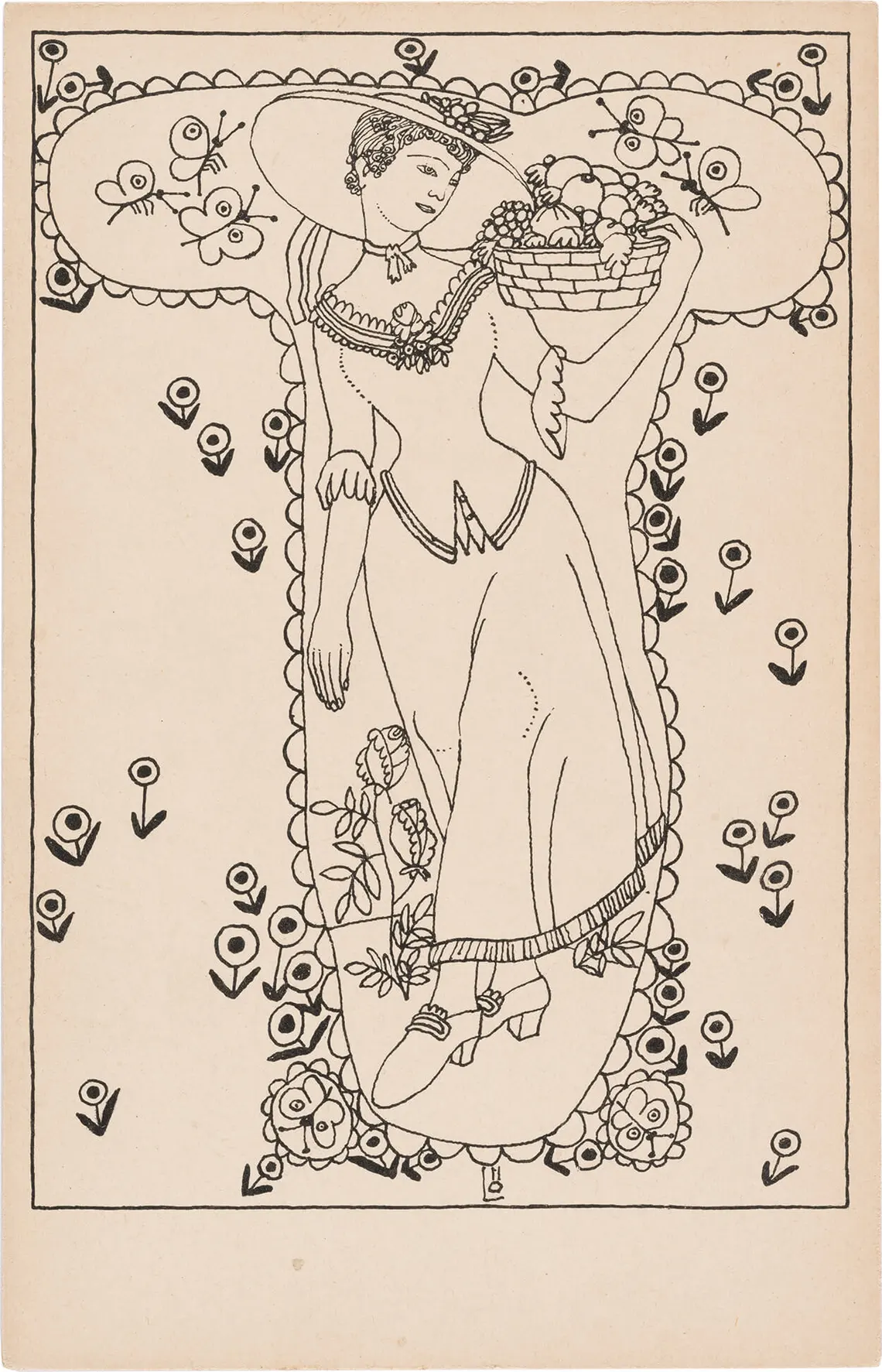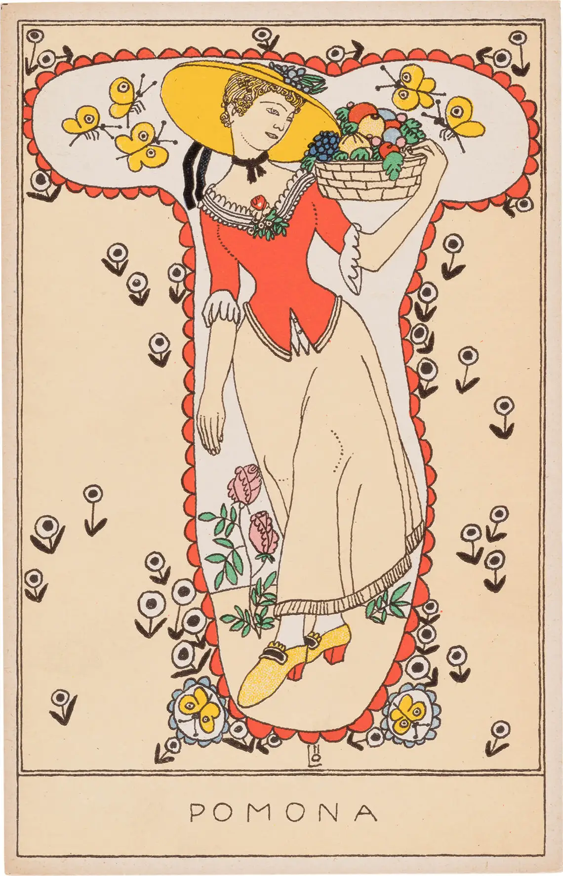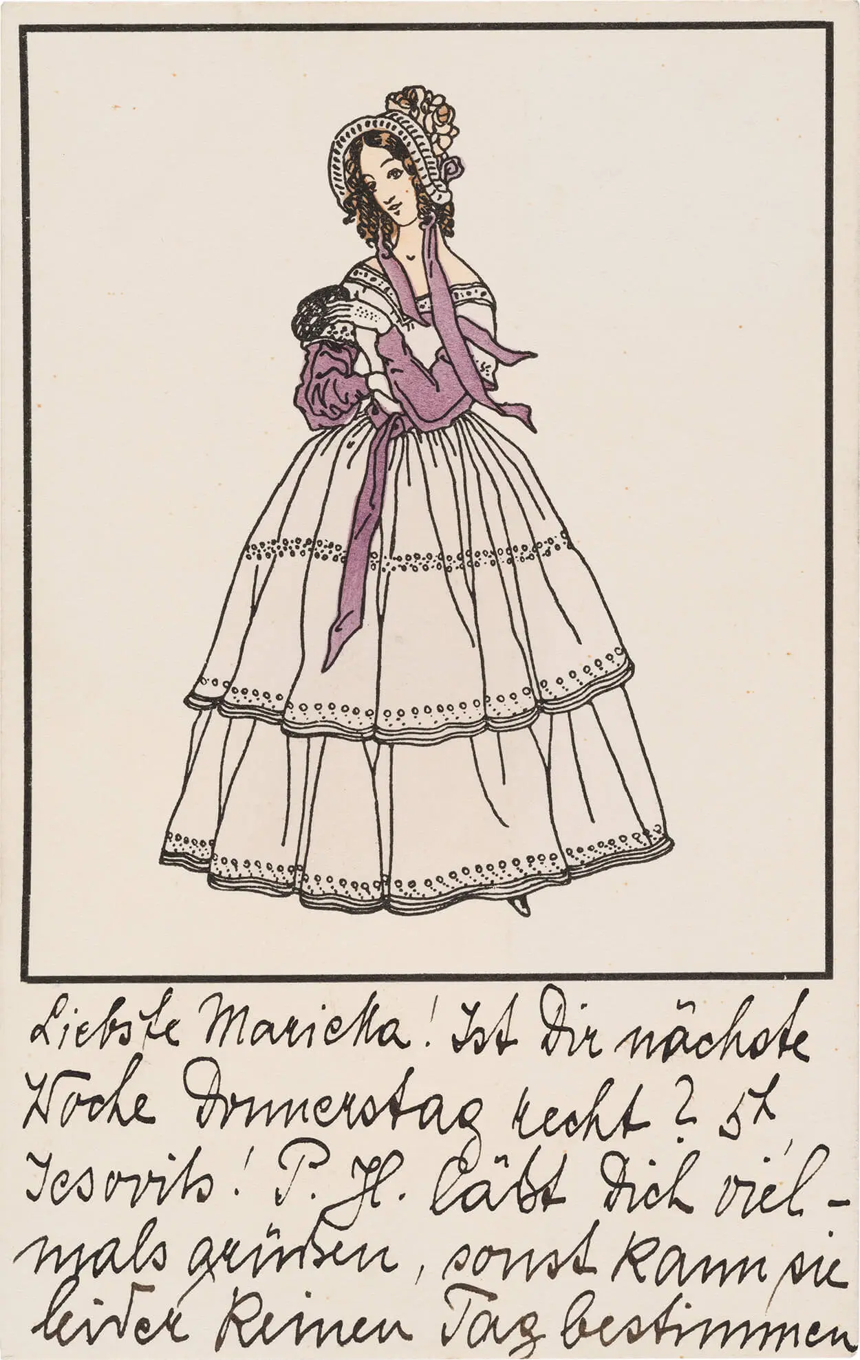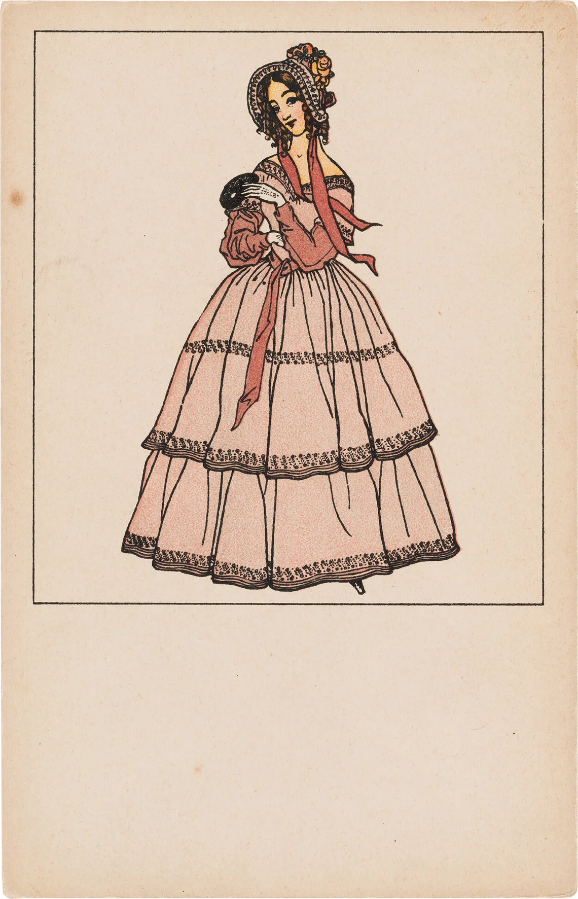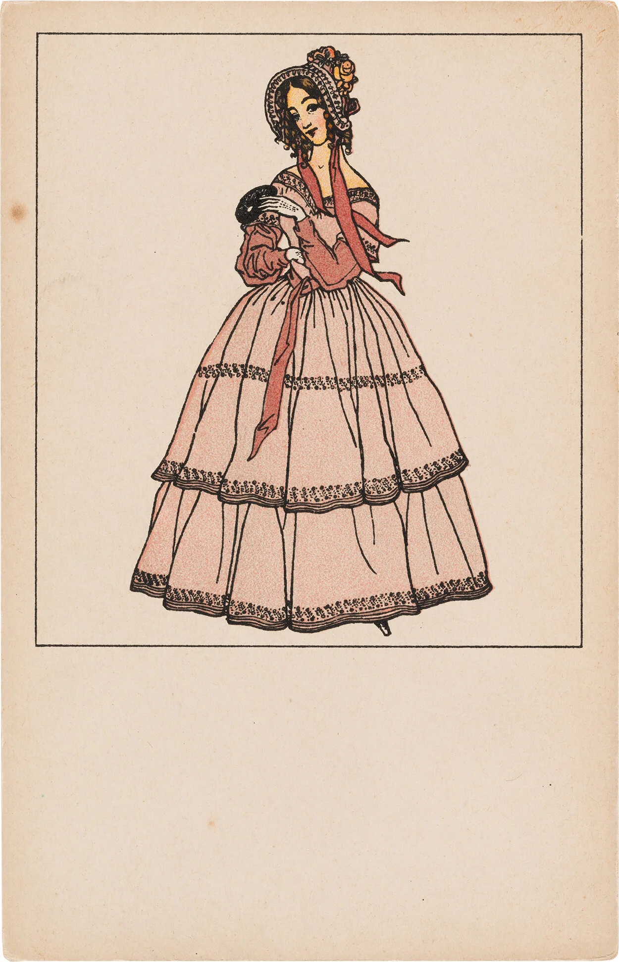 Ein herausragendes Beispiel für den bewusst aufwendig produzierten Mehrfarbendruck stellt Postkarte Nr. 307 „Mädchen mit Blumenstrauß“ von Mela Köhler dar, die basierend auf ihren Modeentwürfen Postkartensujets entwarf. Bemerkenswert ist bei dieser Karte das enorme Farbenspektrum, das die Postkarte im gesamten Motiv und speziell im Bereich des Blumenstraußes aufweist. Diese Karte verdeutlicht auch, dass die Postkarten der Wiener Werkstätte aus den verschiedenen Werkstätten heraus entstanden und daher auch unterschiedlichste Motive umfassen. In der Regel waren die Künstler:innen der WW nie „nur“ für das Entwerfen von Postkarten zuständig, sondern leiteten ihre Kartenmotive von anderen Bereichen und Tätigkeiten ab, wie beispielsweise Mela Köhler von ihren Modeentwürfen. Herangezogen wurden aber auch bestehende Lithographien, Bilderbögen oder Plakate für Postkartensujets.