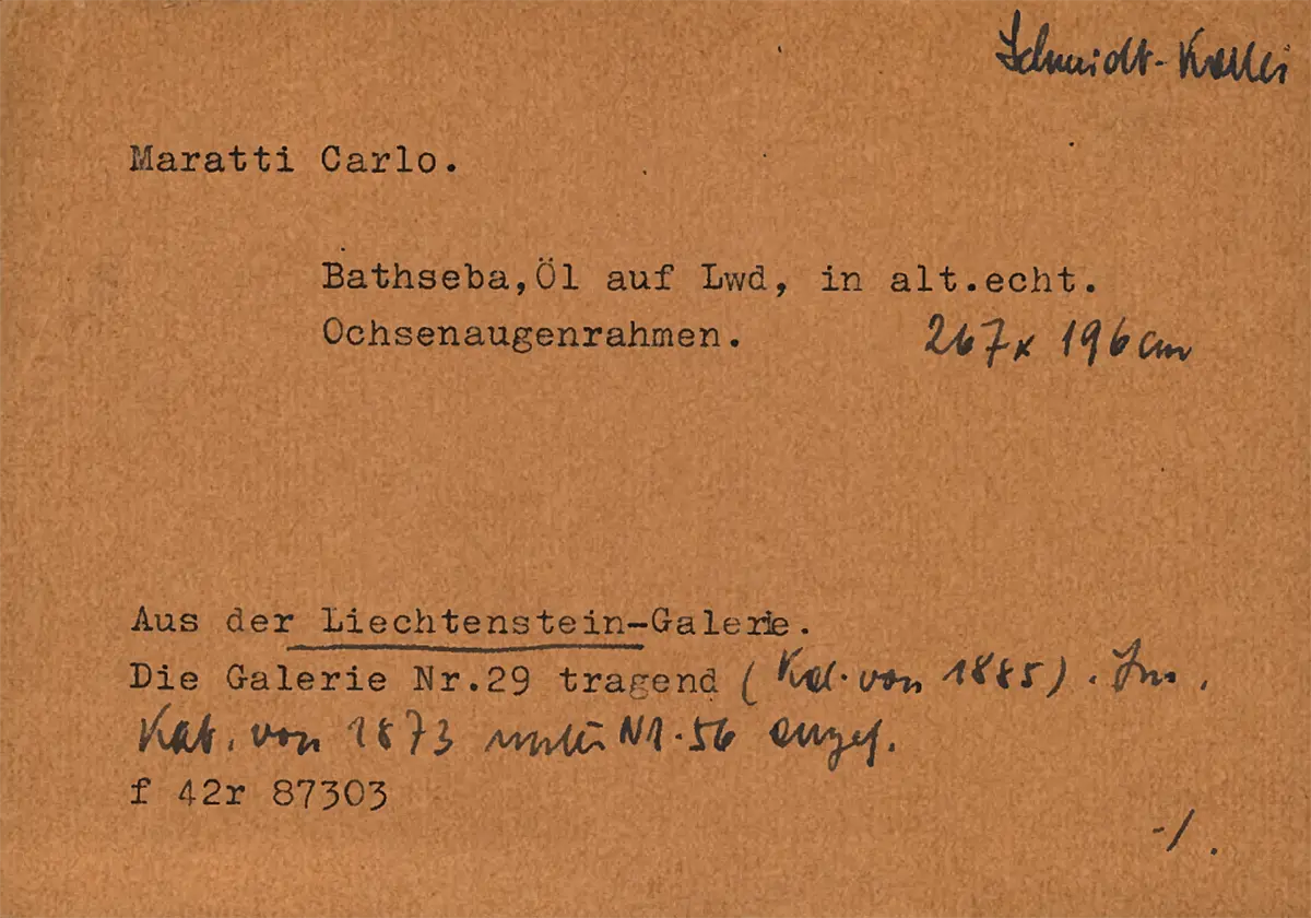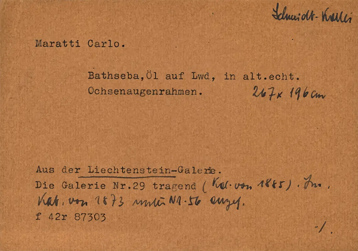Karte aus der historischen Gemäldekartei von Pötschner (Vorder- und Rückseite). „Maratti Carlo. Bathseba, Öl auf Lwd, in alt.echt. Ochsenaugenrahmen. 267 x 196 cm / Aus der Liechtenstein-Galerie. Die Galerie Nr. 29 tragend (Kat. von 1885). Im Kat. von 1873 unter Nr. 56 angef. f 42r 87303; Schmidt-Kartei“. Rückseite der Kartei: „Seit 1733 im Besitz der Liechtenstein-Smlg. 1920 an Glückselig verkauft.“