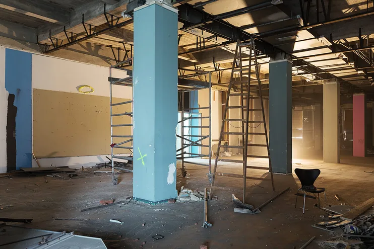 Es staubt gewaltig im Wien Museum Karlsplatz. Das Gebäude wird derzeit bis auf seine tragenden Strukturen „entkernt“: Zwischenwände werden entfernt, abhängende Decken demontiert, Haustechnik rausgerissen , unbrauchbares Restmobiliar entsorgt. Die Ausnahme bilden die denkmalgeschützten Bereiche: Die alte Direktion aus dem Jahr 1959 bleibt unangetastet, deren Möbel lagern einstweilen im Depot. Das Hauptstiegenhaus wurde komplett eingehaust, Boden und Wandverkleidung des Foyers sind mit Holzplatten geschützt.