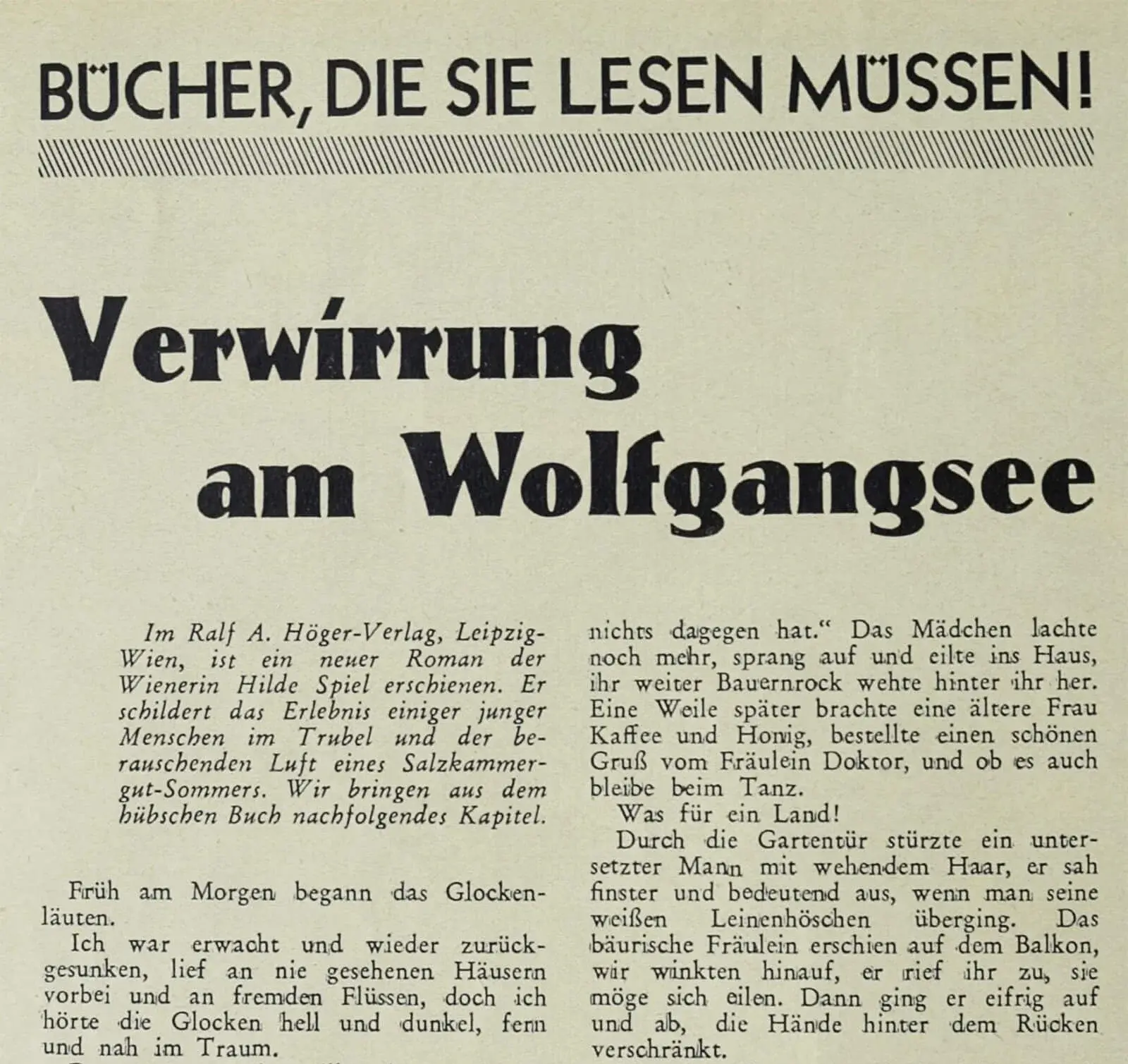Es folgten der Roman „Der Sonderzug“ (1934), in dem es um die Pariser Unruhen vom 6. Februar 1934 ging. Aufgrund der politischen Verhältnisse in Deutschland fand sich allerdings keine Möglichkeit, das Buch zu publizieren (Wiesinger-Stock 1996, S. 115). 1935 veröffentlichte der Verlag Ralph A. Höger dann Hildes Spiels dritten Roman „Verwirrung am Wolfgangsee“ (1935).
