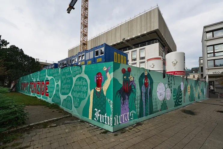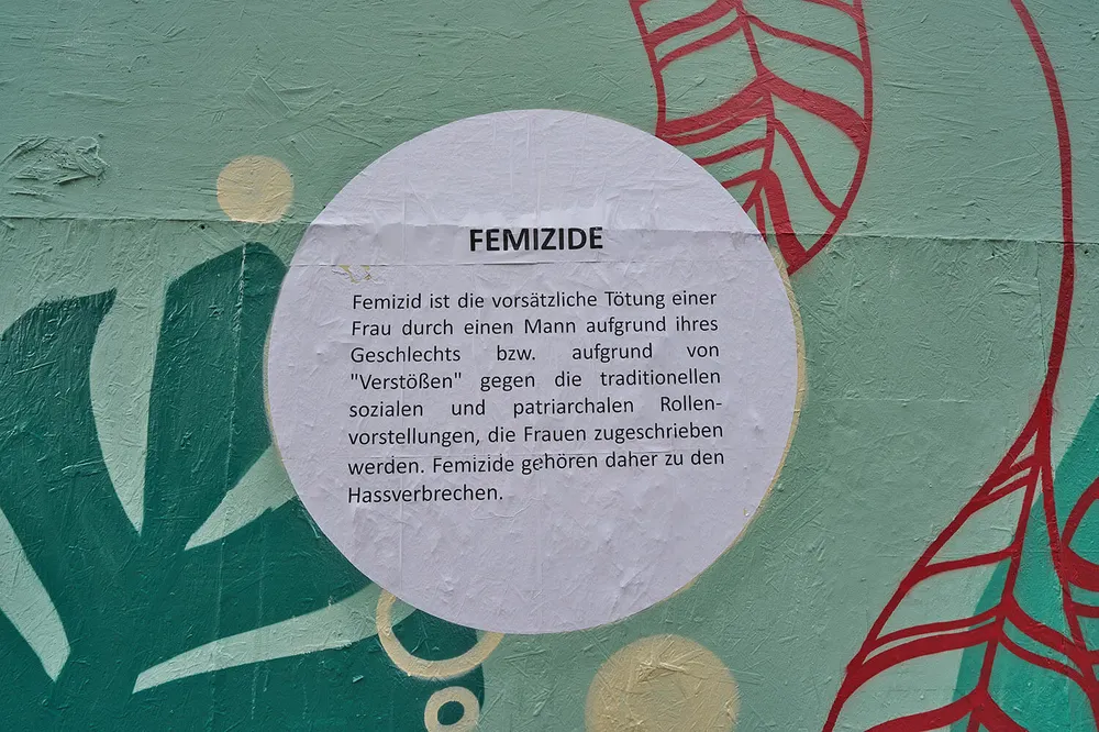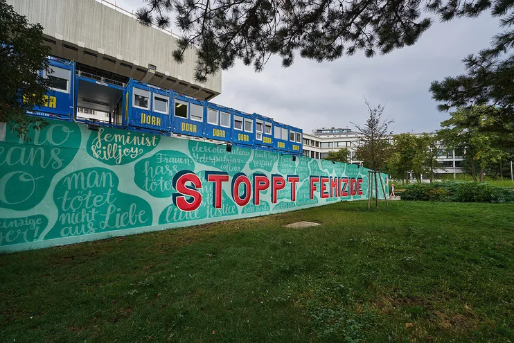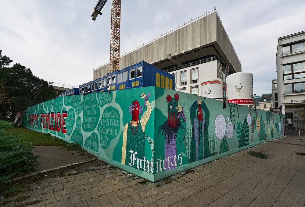 Auch bei „Urban Cultures. Street Art am Bauzaun“ ist am Karlsplatz noch bis 2. Oktober 2022 eine Wand zum Thema Femizide zu sehen. Diese wurde von Feminist Killjoy gemeinsam mit dem feministischen Bündnis Claim the Space, das nach jedem Femizid zu einer Demonstration auf dem Karlsplatz aufruft, sowie mit Künstler:innen des Vereins Futuneras erarbeitet, um auch bereits präsenten Diskursen im öffentlichen Raum Platz zu geben. Und um zu zeigen, dass sich vielfältige Stimmen gemeinsam für ein wichtiges Thema einsetzen, das keine Privatsache, sondern ein gesellschaftliches Problem ist.