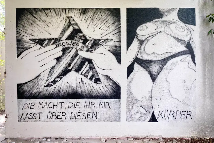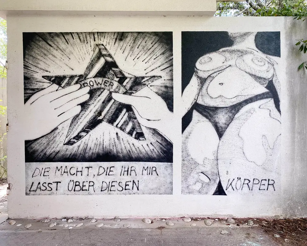 Die Ripoff Crew, die 2018 von Käthe Löffelmann, Linda Steiner und Mariella Lehner gegründet wurde, ist eines der Kollektive, das sich regelmäßig feministischen Themen widmet. Gemeinsam sind vielen Arbeiten der Künstler:innen starke, raumnehmende Frauenfiguren, die sich nicht verstecken wollen. Auch gemeinsame Crew-Arbeiten finden sich im öffentlichen Raum. Immer noch am Donaukanal zu sehen ist „My Body My Choice“ von 2021, das für das Musikvideo zu Held:innenplatz von Philiam Shakesbeat, NENDA & XING gemalt wurde.