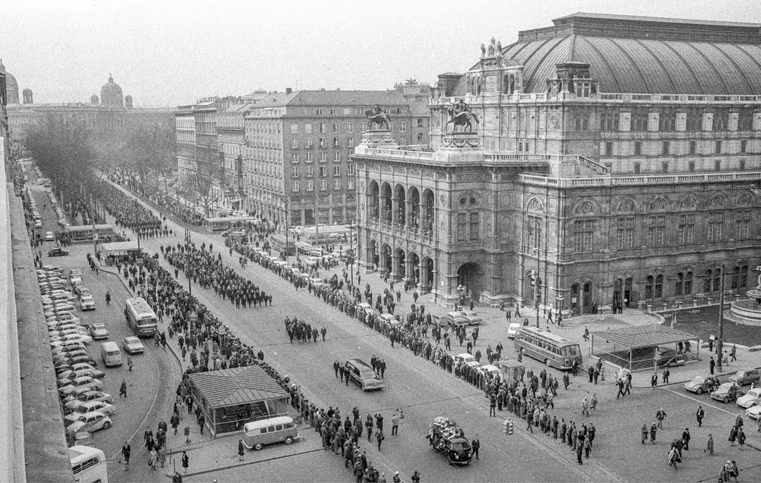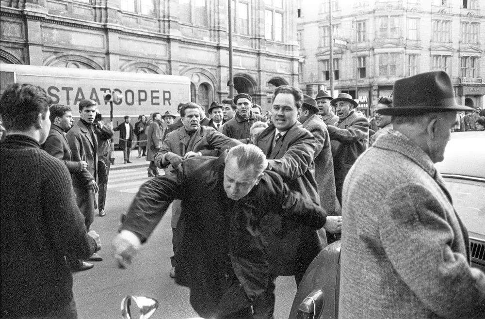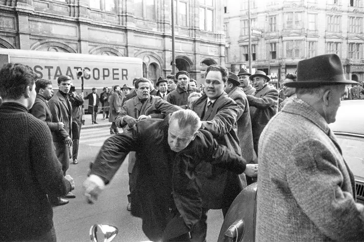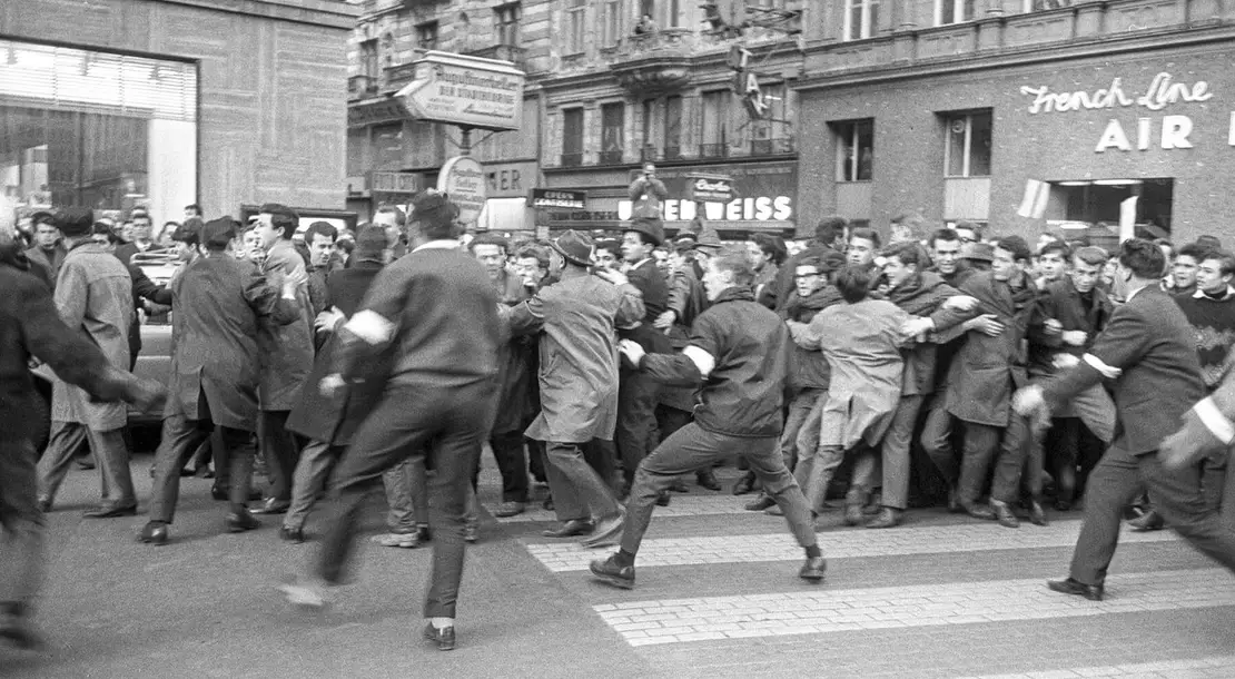 Zusammenstöße zwischen Demonstranten und Gegendemonstranten an der Ecke Kärntner Straße / Philharmonikerstraße, 31. März 1965, Votava / brandstaetter images / picturedesk.com