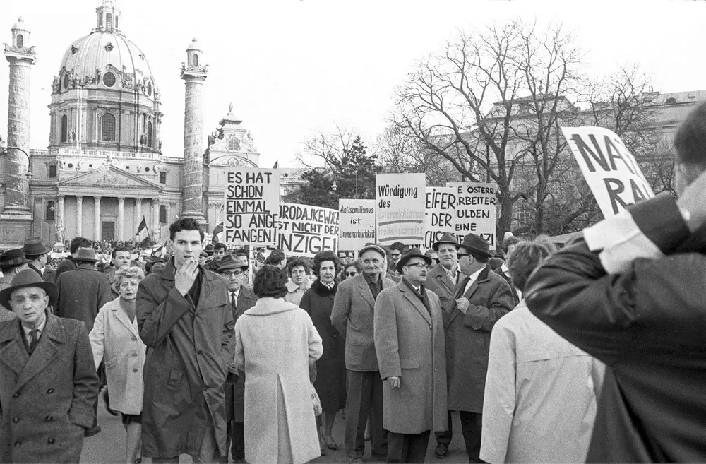 Aufgrund der bisherigen Erfahrungen hatten wir uns organisiert. Ich war einer der Ordner, die dafür sorgen sollten, dass die Emotionen eben nicht zu stark angeheizt werden. Wir hatten dann beim Hotel Sacher, an der Ecke Kärntner Straße/Philharmonikerstraße, eine Kette gebildet. Da kamen von der Albertina her Burschenschafter und begannen hineinzudreschen. Neben mir ist Ernst Kirchweger niedergeschlagen worden. Ich bin dann ins Hotel Sacher, damit die Rettung und die Polizei verständigt wird, habe gewartet, bis die Rettung Kirchweger ins Spital transportiert, und bin danach dem Demonstrationszug nachgelaufen. Am Michaelerplatz haben dann wieder die Burschenschafter und Neonazis auf die Leute eingedroschen. Ich habe einen anwesenden Polizeioffizier ziemlich aggressiv angebrüllt: „Und was machts Ihr?“ Und er meinte: Es tue ihm sehr leid, aber sie hätten nicht genug Verstärkung. Der Polizeipräsident war zu der Zeit in der Oper. Den ich da angebrüllt hatte, war der stellvertretende Stadtkommandant in der Inneren Stadt, ein Kommunist und ehemaliger Spanienkämpfer namens Zalel Schwager, der dann übrigens später mein erster Schwiegervater wurde, aber das war reiner Zufall. In der Bankgasse auf dem Weg zur Herrengasse gab es ziemliche Auseinandersetzungen. Da wurden Teile eines Baugerüsts als Waffen eingesetzt – von beiden Seiten. Und auf der Universitätsrampe verbrannten die Rechten einige Ausgaben des „Kurier“ [dessen Chefredakteur Hugo Portisch gegen Borodajkewycz Stellung bezogen hatte]. Zwei Tage später ist dann Ernst Kirchweger an seinen Verletzungen gestorben. Es gab eine Verabschiedung am Heldenplatz mit Zehntausenden Menschen, der Trauerzug mit Spalier ging bis zum Schwarzenbergplatz, von wo dann der Leichnam ins Krematorium geführt wurde.