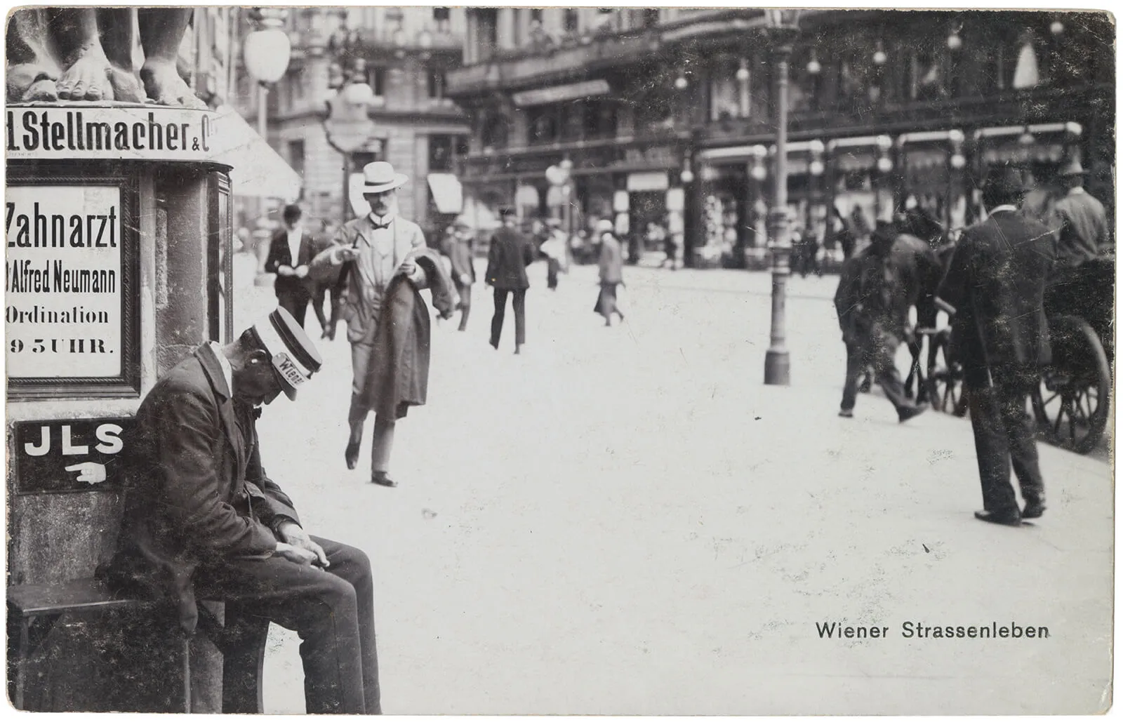 Die Ansichtskartenserie Wiener Straßenleben entstand um 1906/07. Von der Motivik her stellt sie eine Besonderheit vor. Im Gegensatz zu den sonst auf Postkarten gängigen Stadtdarstellungen (Repräsentationsbauten, Veduten, Straßenzüge, Geschäfte, Infrastrukturen) versammelt sie Straßenszenen, die meisten davon als Schnappschüsse realisiert. Die Aufnahmen zeigen Menschen, die auf den Straßen und Plätzen Waren und Dienste anbieten, Fuhrwerke lenken und Karren ziehen, städtische Transportmittel nutzen, Rad fahren, Pferde versorgen, Unrat beseitigen, öffentliche Gartenanlagen pflegen, Laternen putzen, auf Baustellen arbeiten, Straßenbahnschienen warten, flanieren, marschieren, stehen, kauern, sitzen, schlafen, Unfug treiben – und schlussendlich, selbstbezüglich, fotografieren. Es überwiegen Menschen in Berufskleidung, die auf der Straße arbeiteten oder ebenda leben mussten. Darin schwingt noch die Tradition der Wiener-Typen-Darstellungen nach, in der Fotografen wie Otto Schmidt, Emanuel Wähner oder Emil Mayer stehen, ging aber weit über die eingesessenen, ikonisch gewordenen Personagen wie Fiaker, Wasserer, Werkelmann, Wäschermädel oder Hundeverkäufer hinaus. Bürgerliche, die im Gegensatz zu den sogenannten unteren Klassen über einen Zugang zum Produktionsmittel Fotografie verfügten, schufen und bestätigten sich da ein Weltbild jenseits sozialer Verwerfungen, in dem weiterhin ständische Residuen hausten und also die soziale Ordnung noch funktionierte.