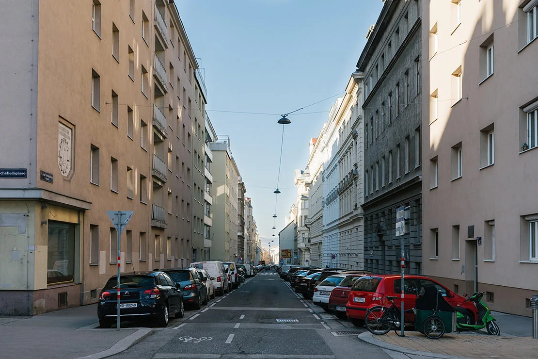 Blick in die Graf-Starhemberg-Gasse stadteinwärts. Gleich auf der linken Seite ist die Nummer 44, wo heute ein Bau aus den 50er Jahren steht. Das Haus, in dem Glauser aufgewachsen ist, wurde im Zweiten Weltkrieg durch Bombentreffer zerstört. Der Name der Gasse geht auf Ernst Rüdiger Graf von Starhemberg zurück, dem legendären Feldherren aus der Zeit der zweiten Belagerung durch die Osmanen 1683. Der Zusatz „Graf“ wurde nach 1945 gewählt, um eine Verwechslung mit dem Heimwehr-Führer gleichen Namens auszuschließen. Foto: Elodie Grethen