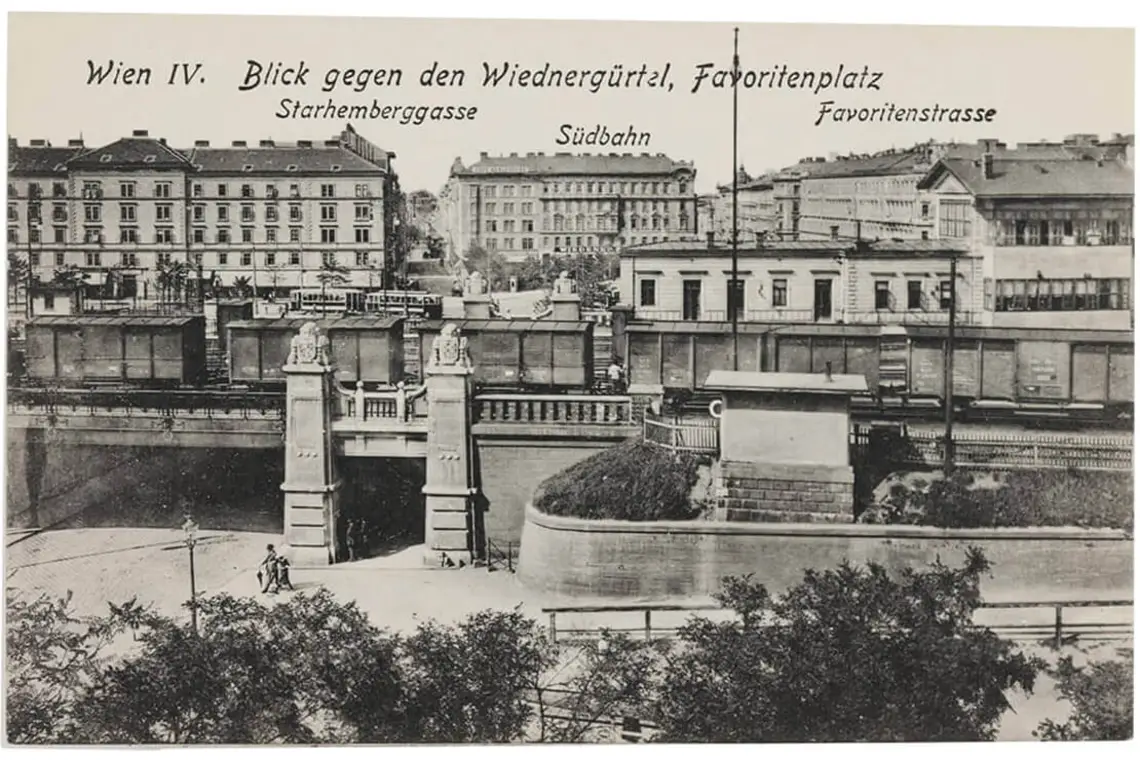Blick auf den Südtiroler Platz mit der Bahnlinie und der Starhemberggasse im Hintergrund, Ansichtskarte, 1917, Wien Museum