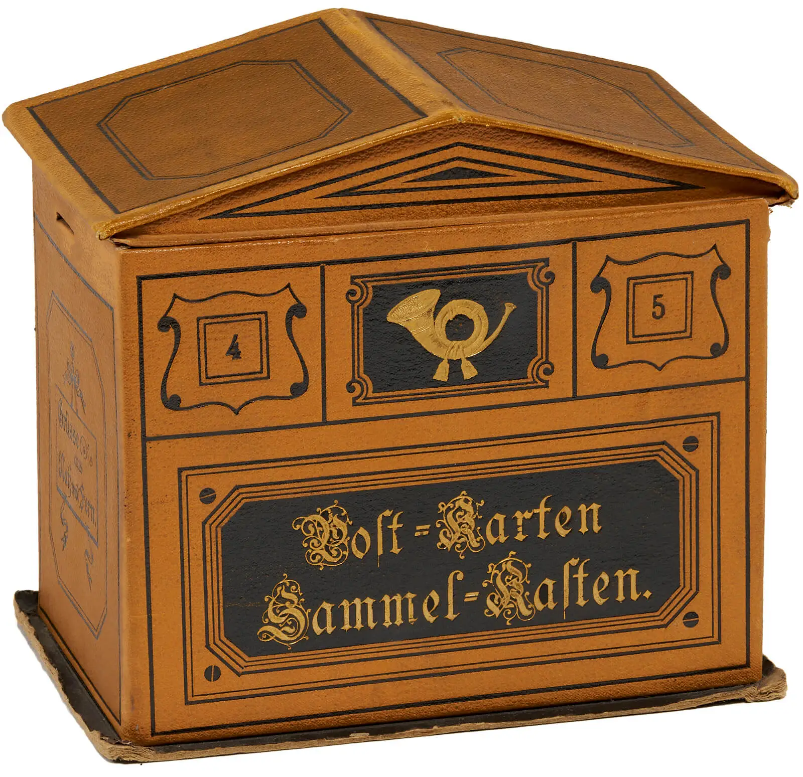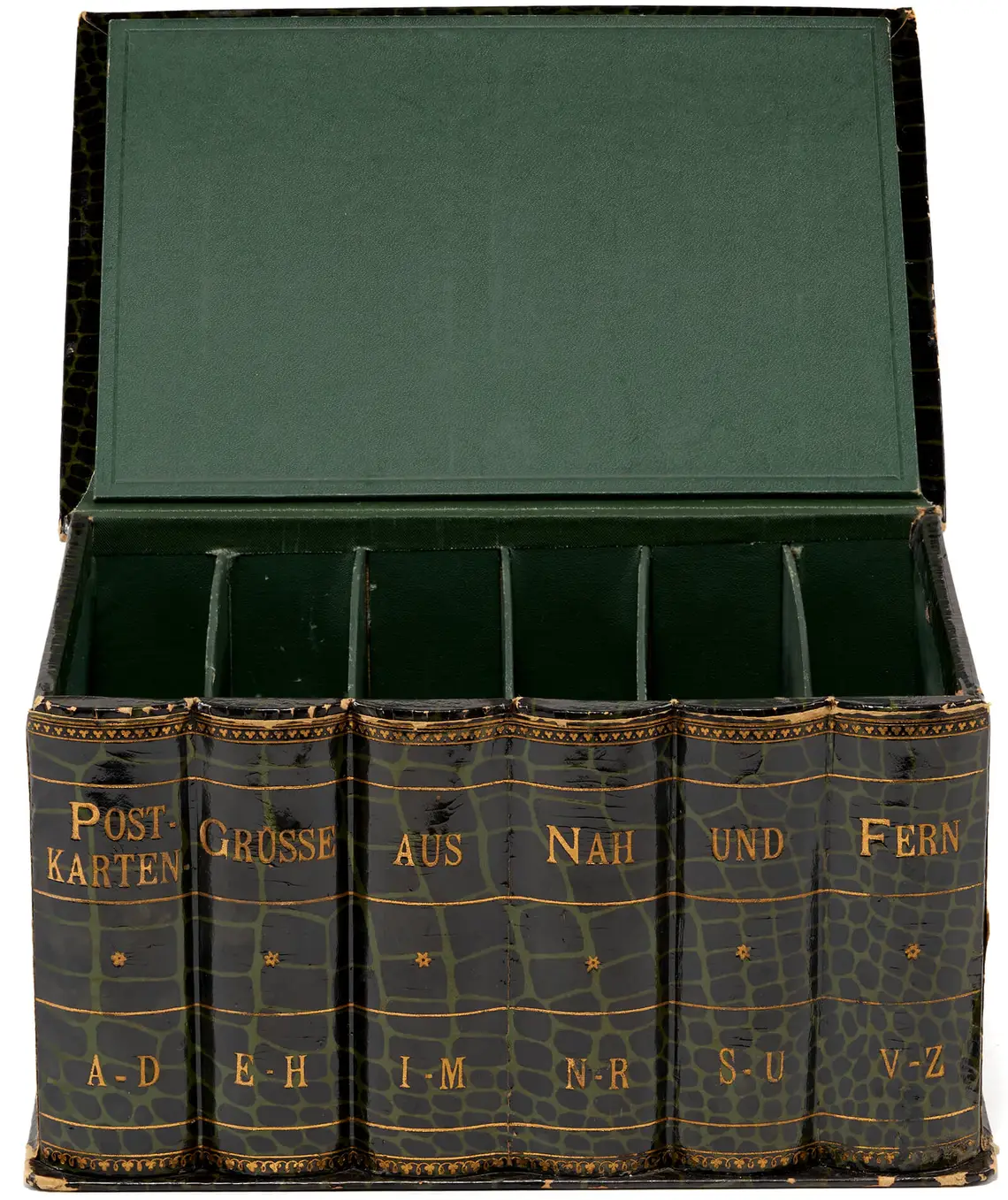 Sammelbox mit Ansichten von Wien, Budapest und Prag für 100 Karten, um 1898, Blech lackiert, Sammlung Lukan, Wien