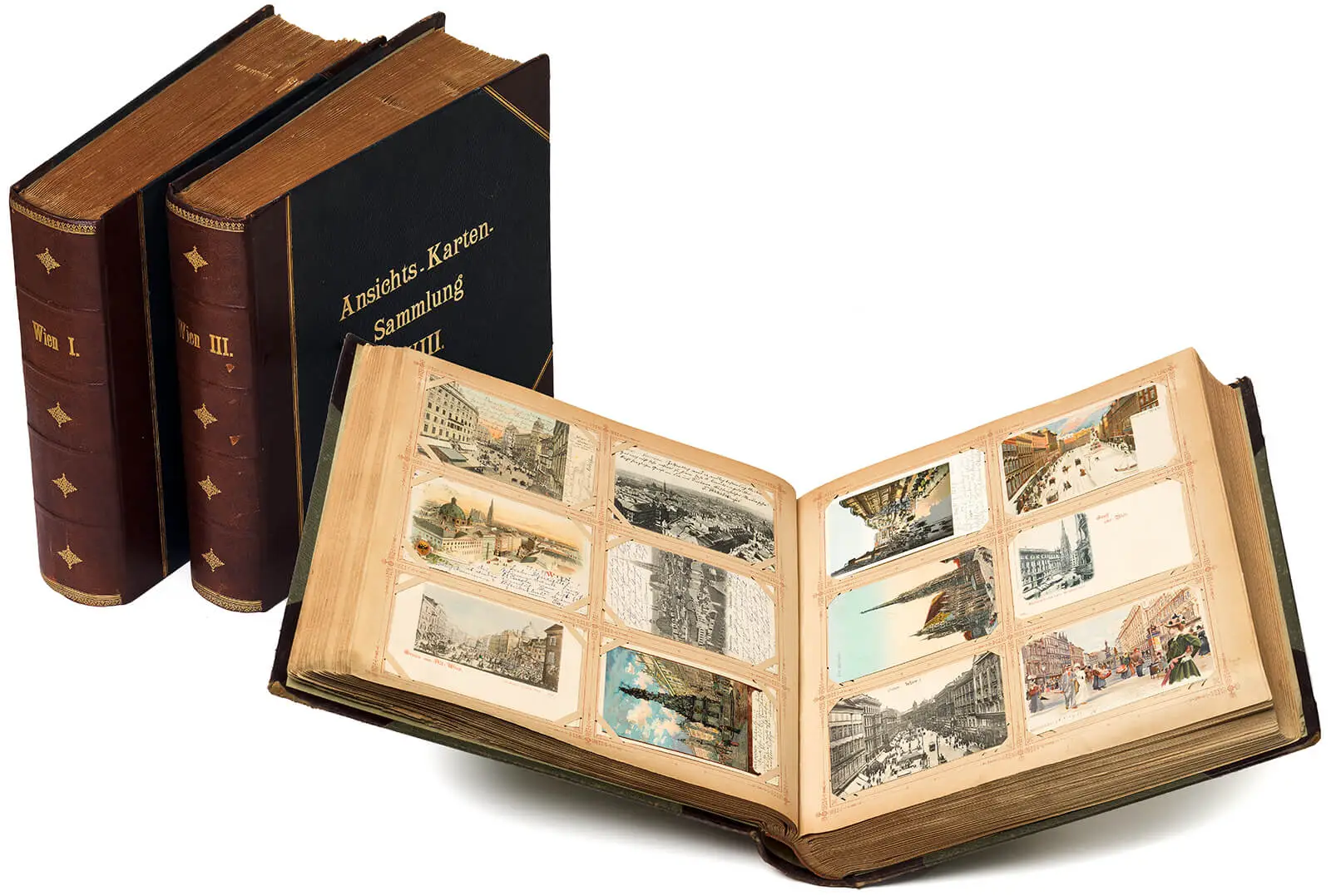 Erhalten sind drei Alben der Sammlerin Helene Reuss, einer wohl im gehobenen Bürgertum situierten, jungen, verheirateten Frau aus Bílina/Bilin im heutigen Tschechien, sowie zehn Alben der Wienerin Else Erxleben, Frau eines höheren Beamten der Reichsbahn, für deren Aufbewahrung die Albumhalterin sogar eigene Sammelschränke verwendete. Beide Sammlungen stellen bereits in ihrem äußeren Erscheinungsbild den Anspruch auf Wissensgenerierung: Die einheitliche Struktur der Bände, die geprägten Titel und die fortlaufenden Nummern imitieren die Rhetorik wissenschaftlicher Systematiken. Dennoch unterscheiden sich die beiden Bestände in zentralen Punkten. So sind die Reuss-Alben mithilfe eines umfassenden sozialen Netzwerkes zustande gekommen: Helene Reuss unterhielt zwischen 1897 und 1915 intensive Beziehungen zu anderen Sammelnden, die ihr Karten zuschickten, sowie zu Freunden und Familie. Es deutet einiges darauf hin, dass sie auch Mitglied in einem Sammelverein gewesen sein könnte. Dahingegen hat Else Erxleben zur Gänze unbeschriebenes Material kompiliert, das sie auf eigene Faust auf umfangreichen Reisen zusammengetragen hat.