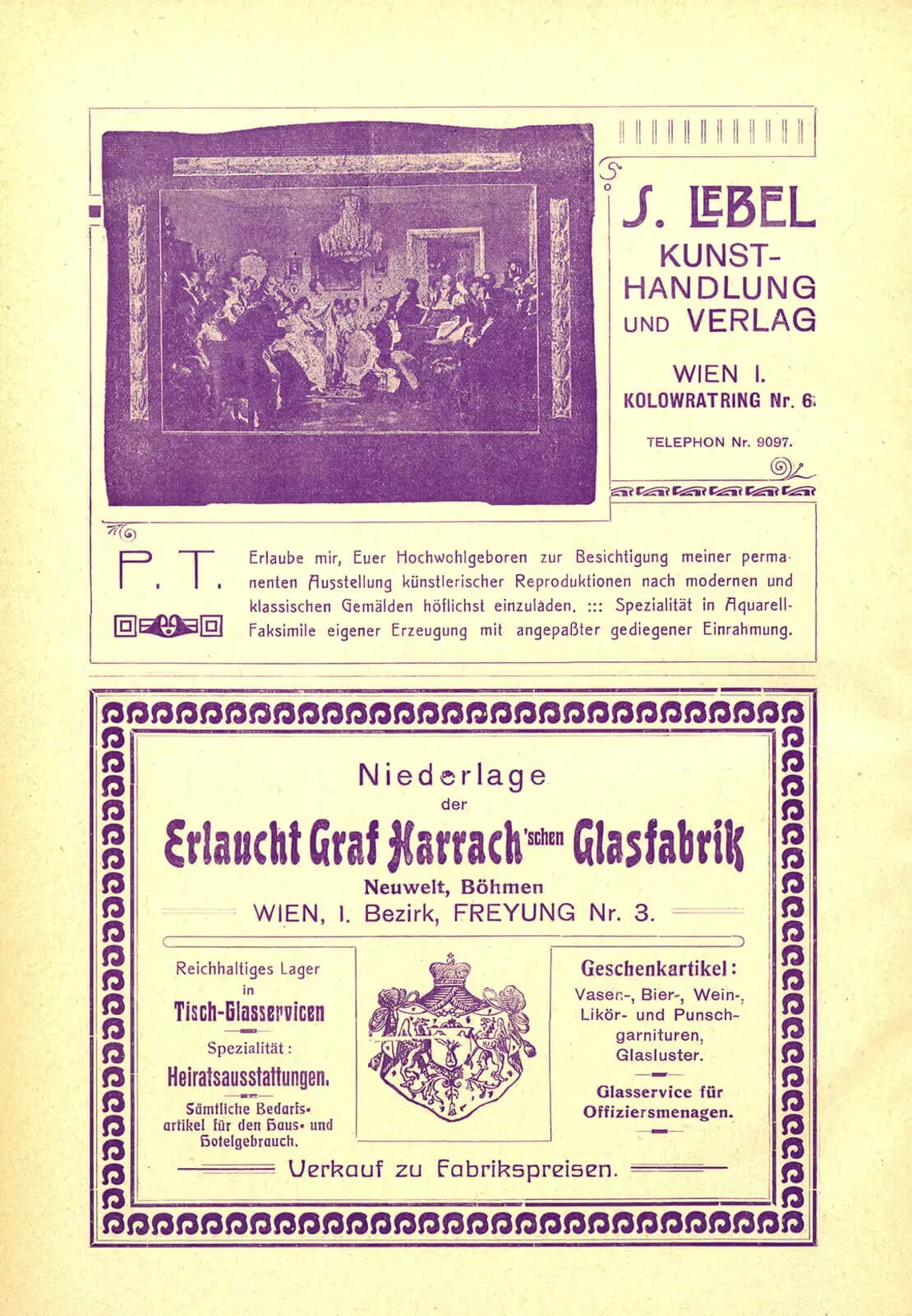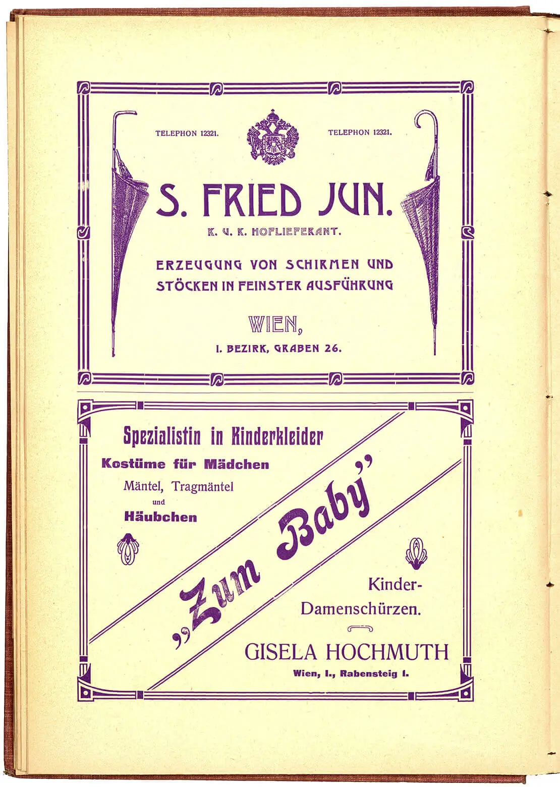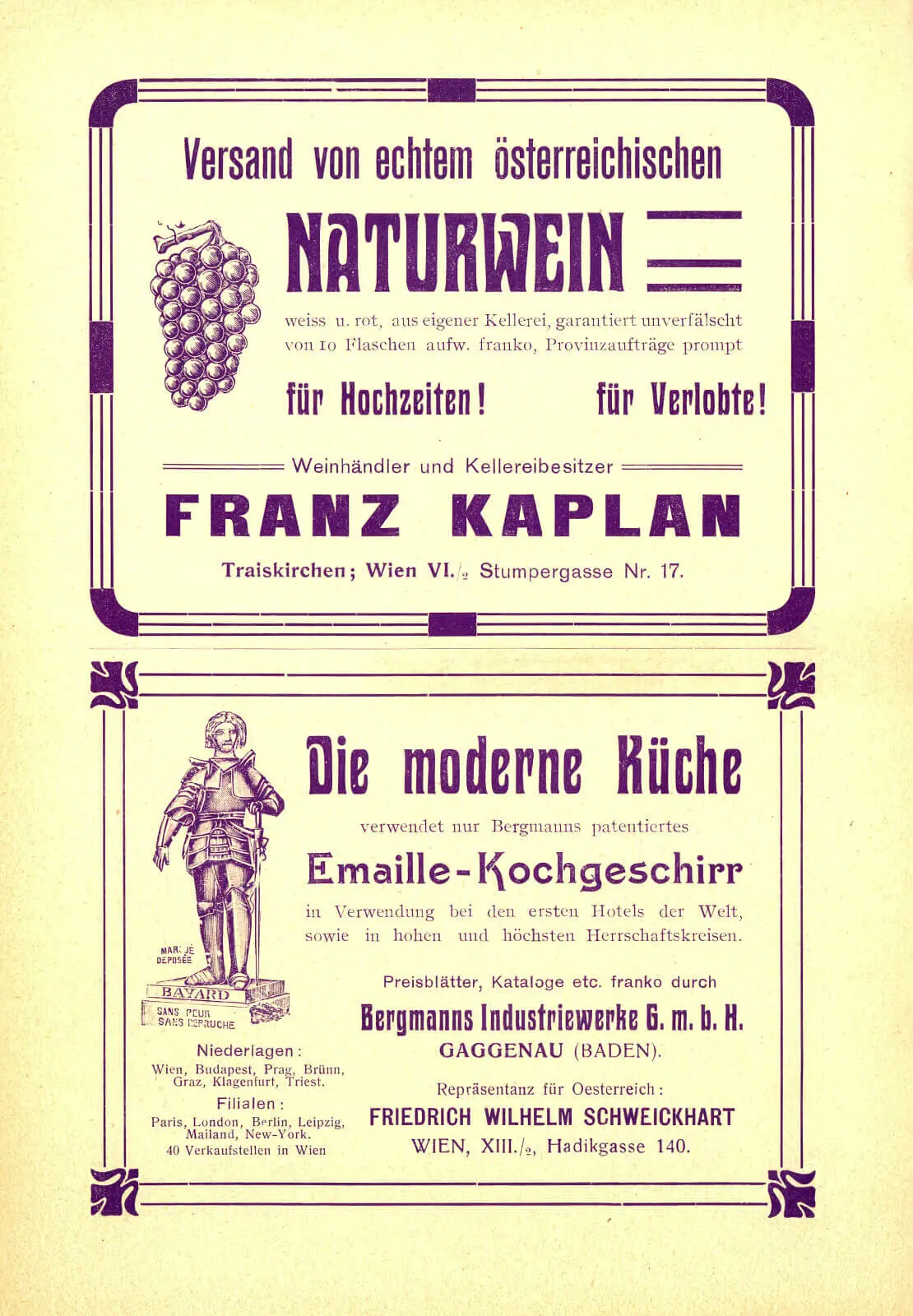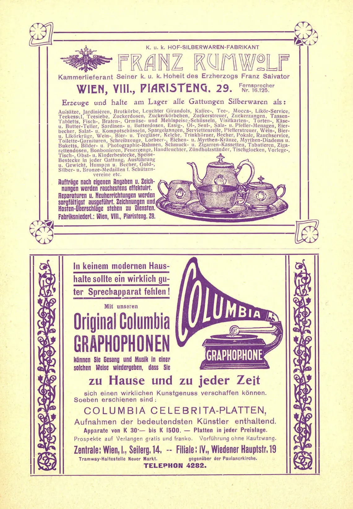 Ebenso boten etliche Firmen Hochzeitsgeschenke und Hochzeitstische in verschiedenen Preisklassen und teilweise auf Abzahlung an. So empfahl sich das Modewarenhaus Gerngross auf der Mariahilferstraße als „modernstes, weltstädtisches Etablissement“ und „angenehmste und billigste Einkaufsquelle für Geschenke und Mode-Artikel im Wiener Geschmack“. Die Werkstätte für Silber- und Metallarbeiten von Otto Wertheimer, ebenfalls in der Mariahilferstraße, bot „Samovare, Mocca-, Tee-, Likör- und Rauchservice, Champagnerkübel, Luxusbestecke, Serviertassen. Palmen- und Blumentöpfe u. moderne Tischdekorationen. Aschenschalen und Feuerzeuge, Schreibtischgarnituren. Elektrische Lampen“ an und betonte: „Sehr geeignet für Geschenke aller Art, speziell für Hochzeitsgeschenke“. Was unser Brautpaar an Geschenken erhielt, ist nicht überliefert – die entsprechende Rubrik des Albums blieb leer.