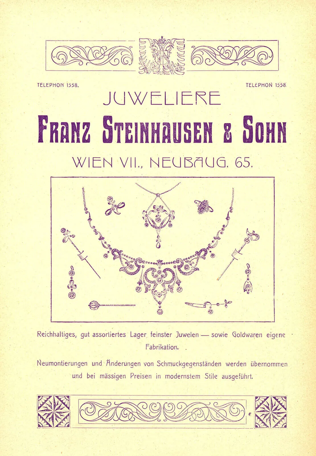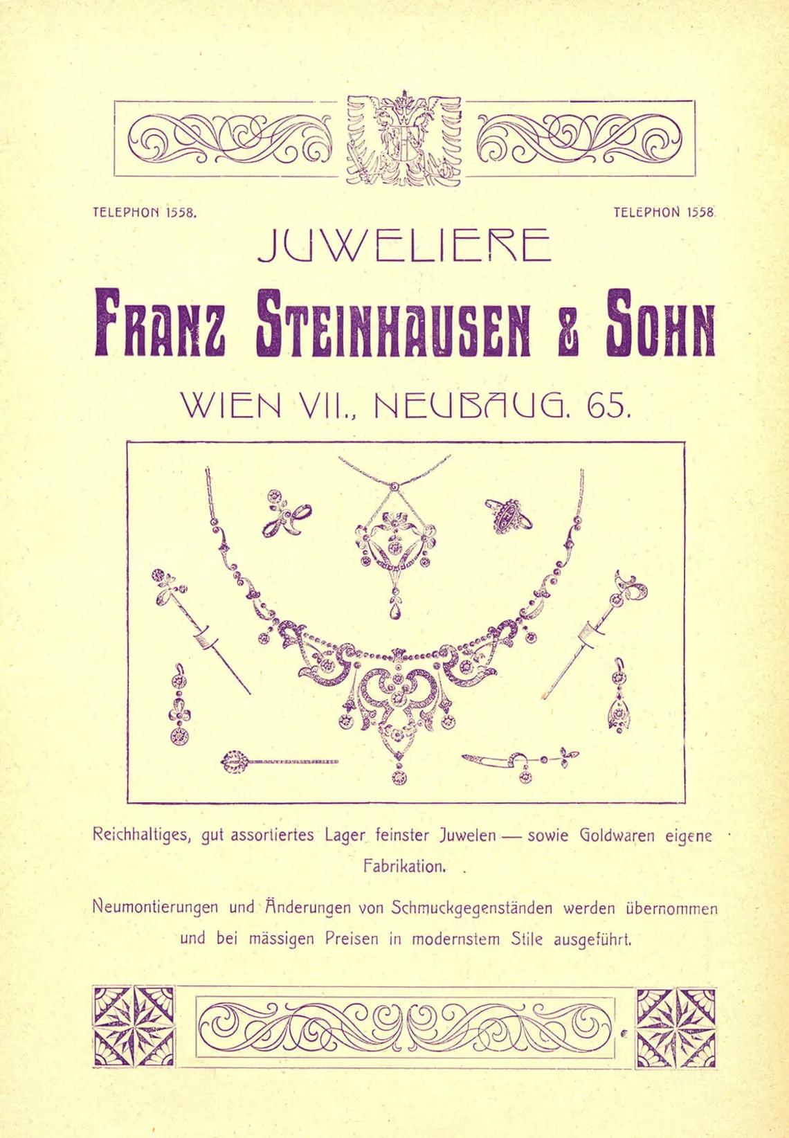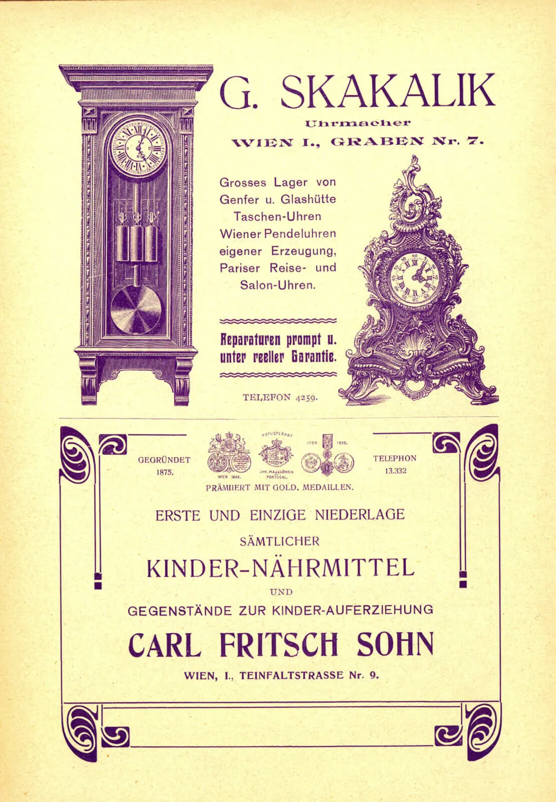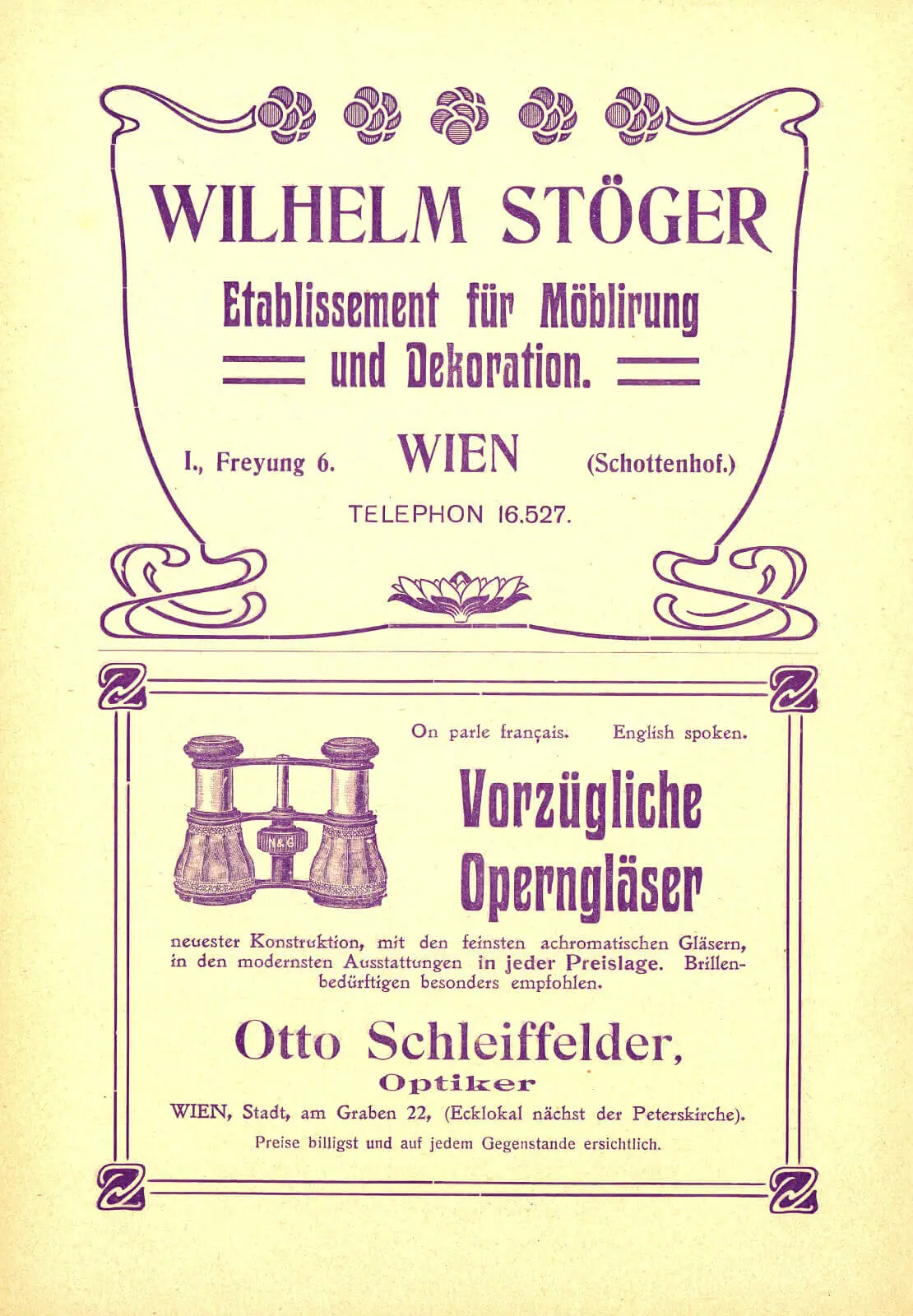 Ebenso boten etliche Firmen Hochzeitsgeschenke und Hochzeitstische in verschiedenen Preisklassen und teilweise auf Abzahlung an. So empfahl sich das Modewarenhaus Gerngross auf der Mariahilferstraße als „modernstes, weltstädtisches Etablissement“ und „angenehmste und billigste Einkaufsquelle für Geschenke und Mode-Artikel im Wiener Geschmack“. Die Werkstätte für Silber- und Metallarbeiten von Otto Wertheimer, ebenfalls in der Mariahilferstraße, bot „Samovare, Mocca-, Tee-, Likör- und Rauchservice, Champagnerkübel, Luxusbestecke, Serviertassen. Palmen- und Blumentöpfe u. moderne Tischdekorationen. Aschenschalen und Feuerzeuge, Schreibtischgarnituren. Elektrische Lampen“ an und betonte: „Sehr geeignet für Geschenke aller Art, speziell für Hochzeitsgeschenke“. Was unser Brautpaar an Geschenken erhielt, ist nicht überliefert – die entsprechende Rubrik des Albums blieb leer.