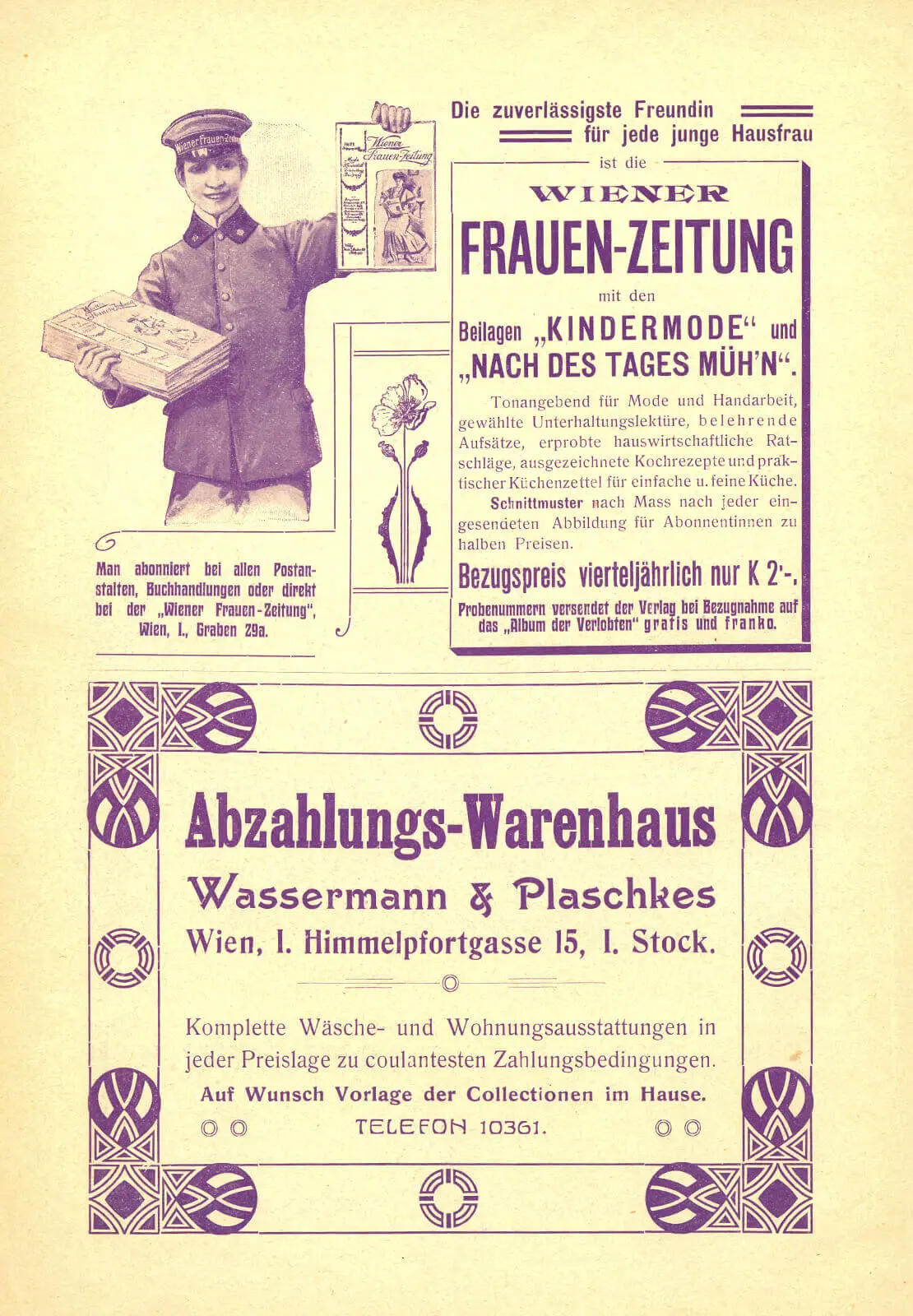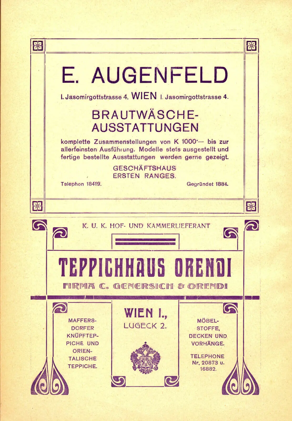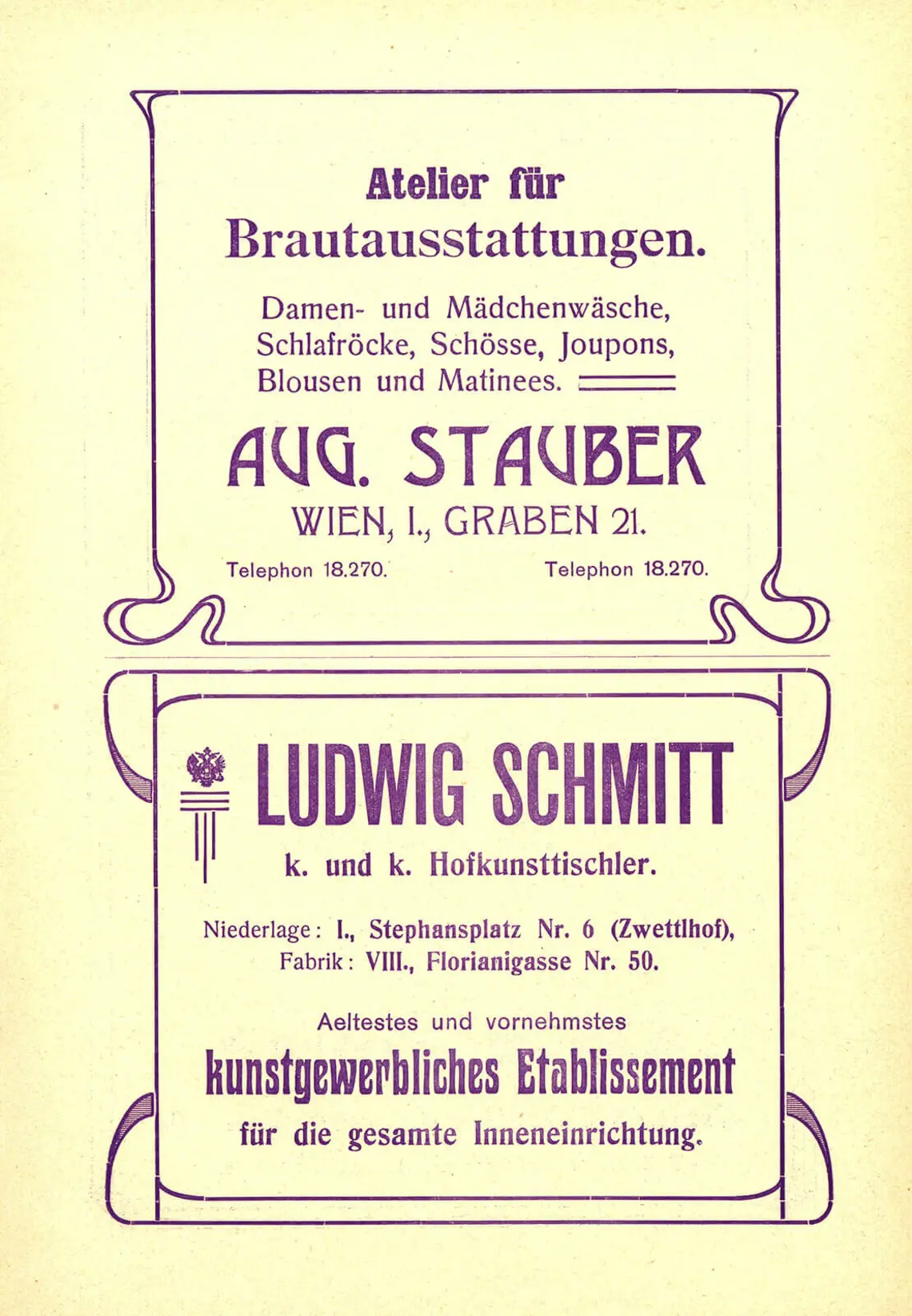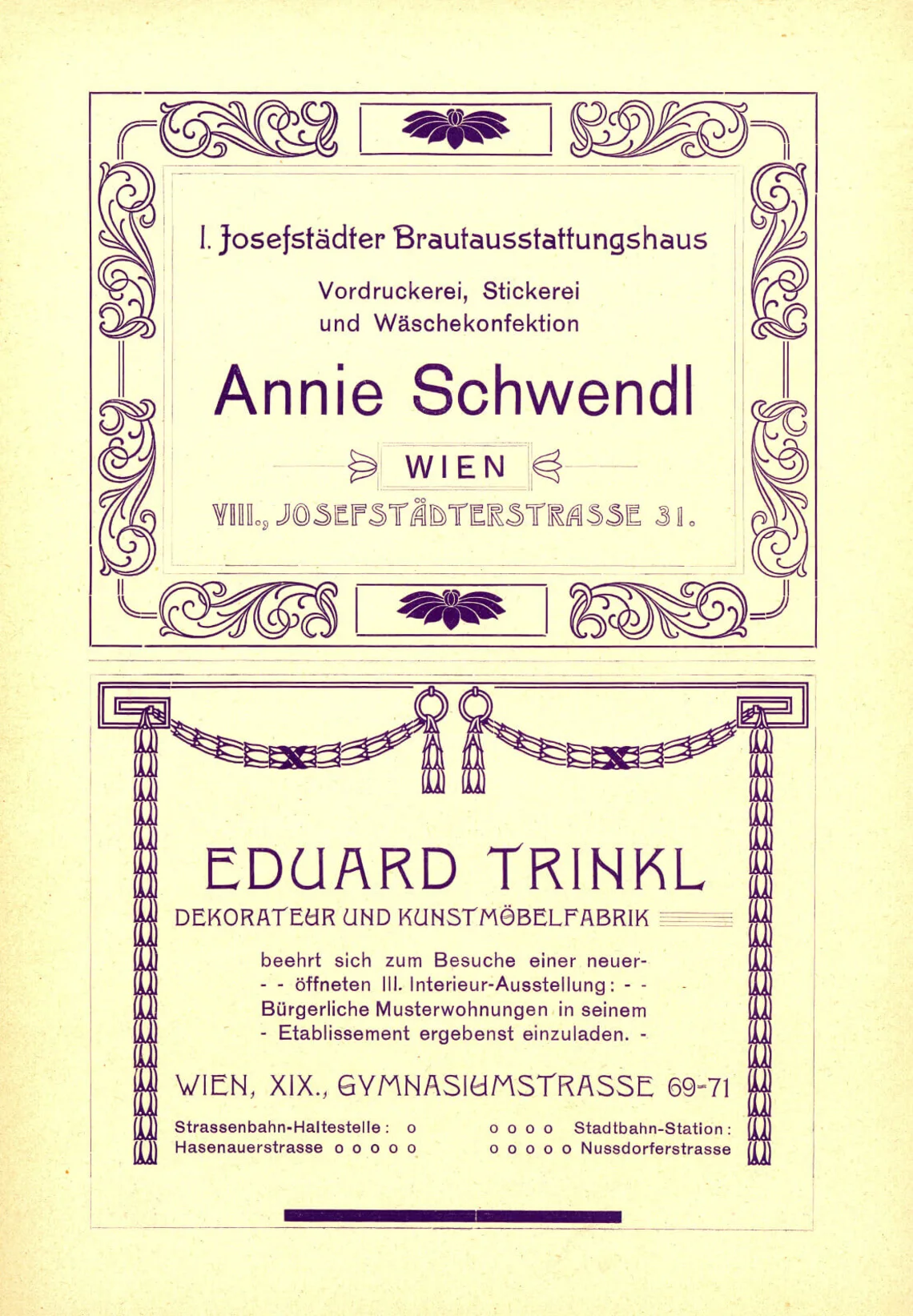 Da die Einrichtung der ehelichen Wohnung und der dafür notwendige Hausrat einen ganz wesentlichen Aspekt der Hausstandsgründung ausmachten, bezieht sich ein großer Teil der im Album abgedruckten Annoncen auf diese Bereiche. Damals zogen Brautpaare grundsätzlich erst nach der Hochzeit in einen gemeinsamen Haushalt. Insofern ist nachvollziehbar, dass es ein starkes Interesse gab, ganze Garnituren zu erwerben und die Möbelhersteller zur Besichtigung häufig „vollständig eingerichtete Interieurs“ anboten – wie das Möbelhaus Gustav Wallis, das eindrucksvolle „300 Zimmer“ von 280 bis 3.000 Kronen vorrätig hielt und komplette Wohnungs- und Villeneinrichtungen anbot. Zudem entsprach der einheitliche Stil dem Geschmack der Zeit. Auch andere zeitgenössische Moden werden in den Werbeanzeigen sichtbar, etwa die Vorliebe für historisierende Möblierung. So verweist der Tischler und Tapezierer Josef Koblitz in der Siebensterngasse auf sein „Grosses Lager in altdeutschen Speise- und Schlaf-Zimmern, sowie Salon-Garnituren“. Beliebt war außerdem Exotisches, wie zum Beispiel „orientalische“ Herrenzimmer, Chinoiserien oder Perserteppiche. An Modernem gab es das, was heute als Jugendstil bekannt ist.