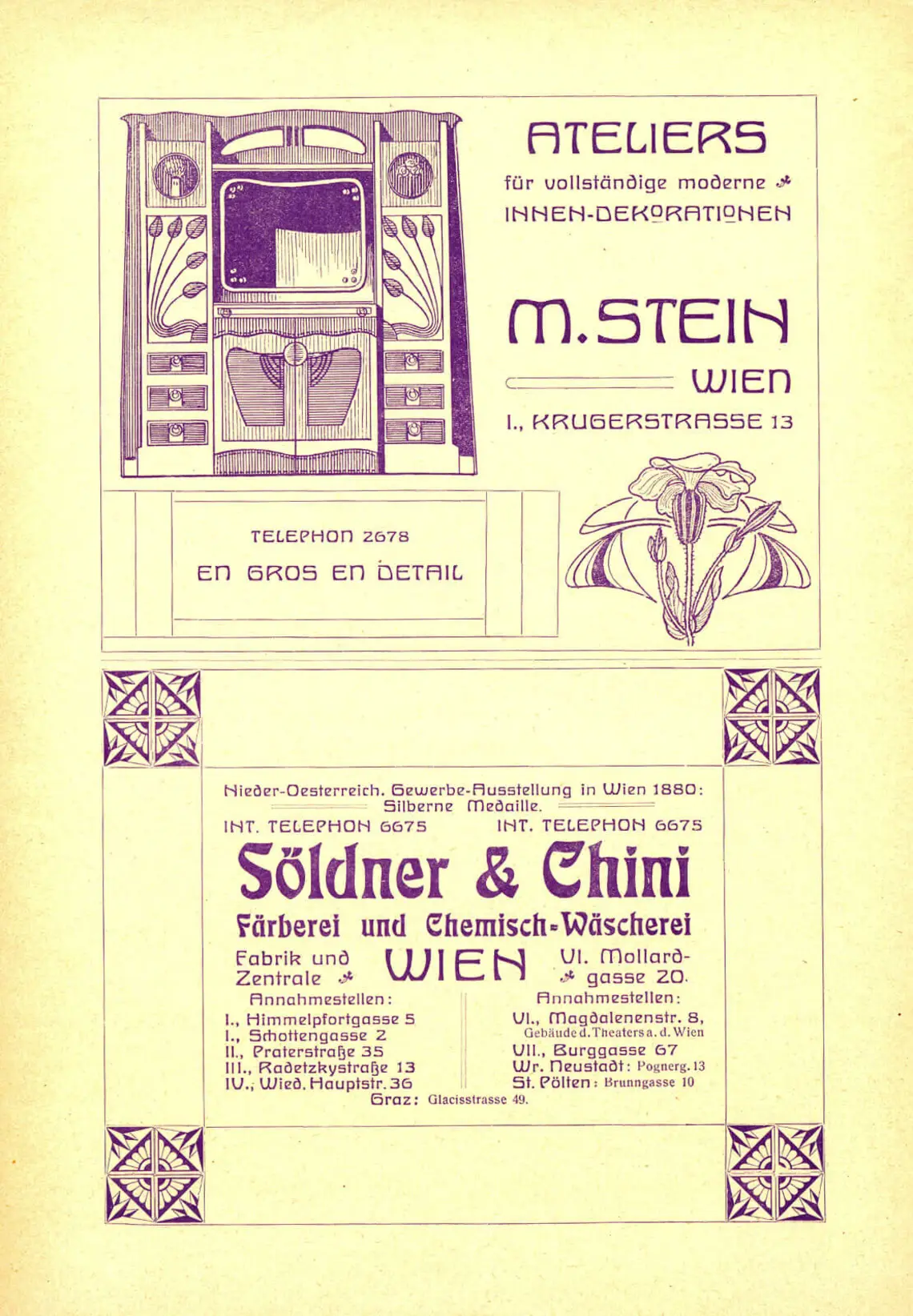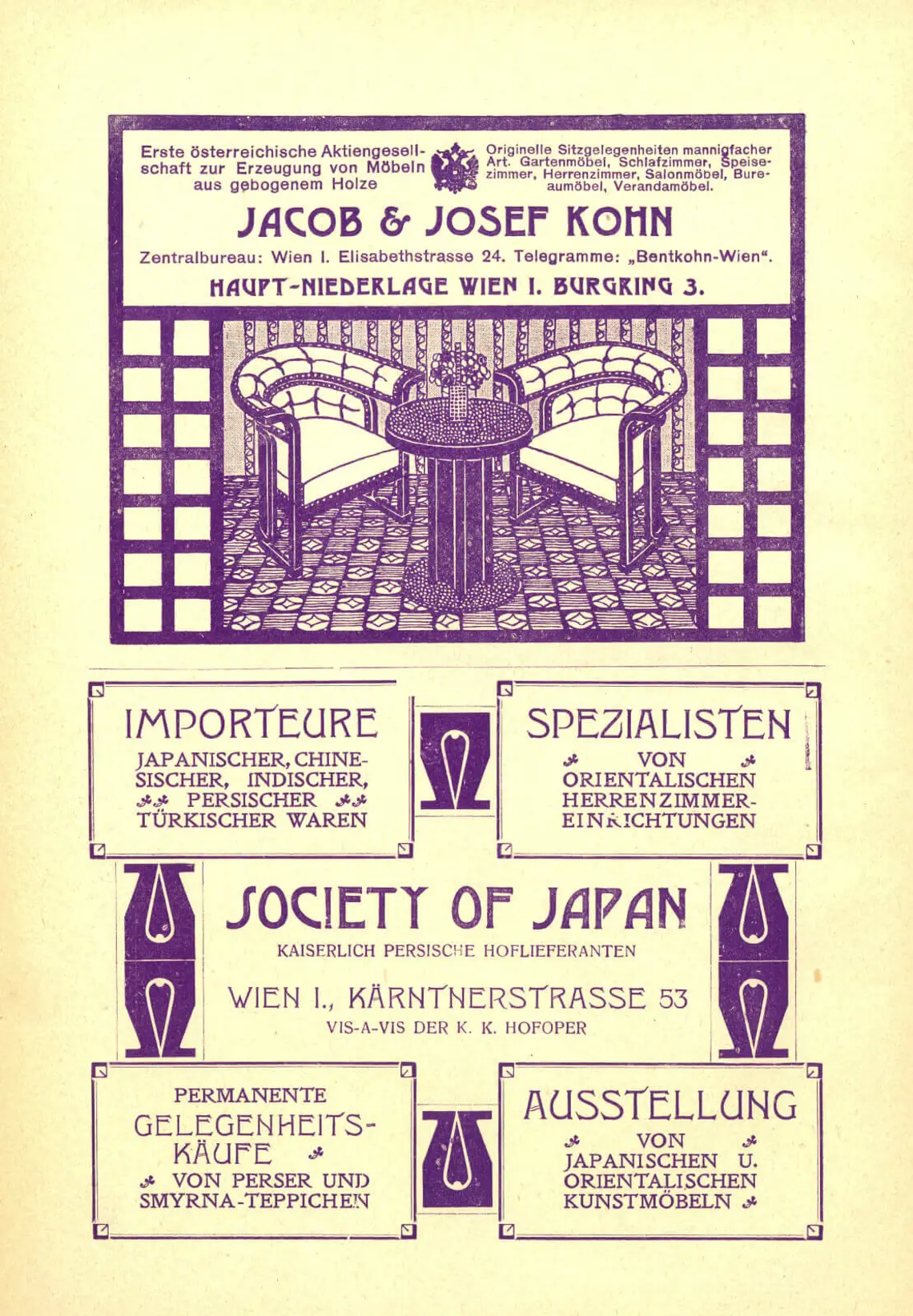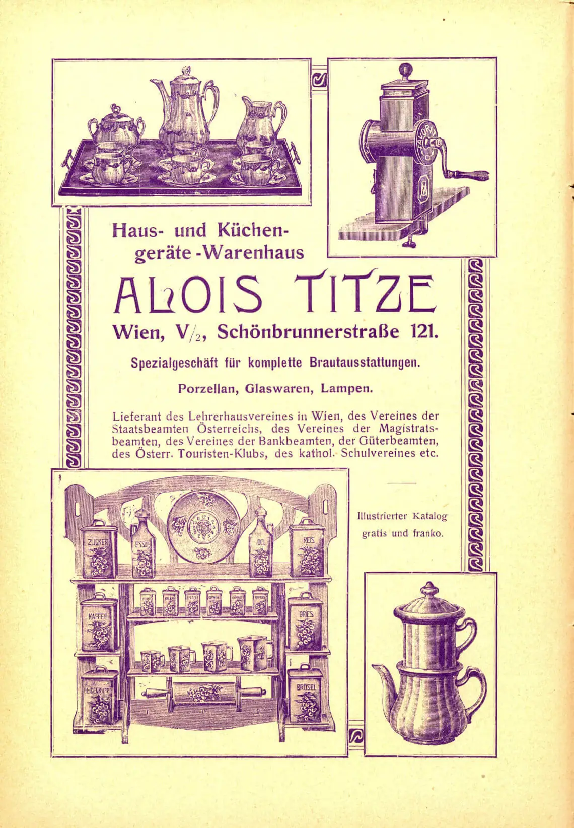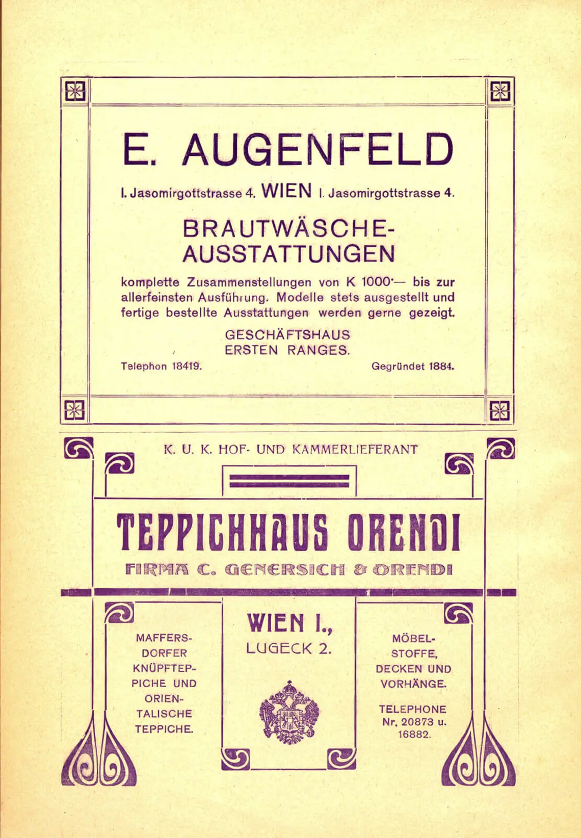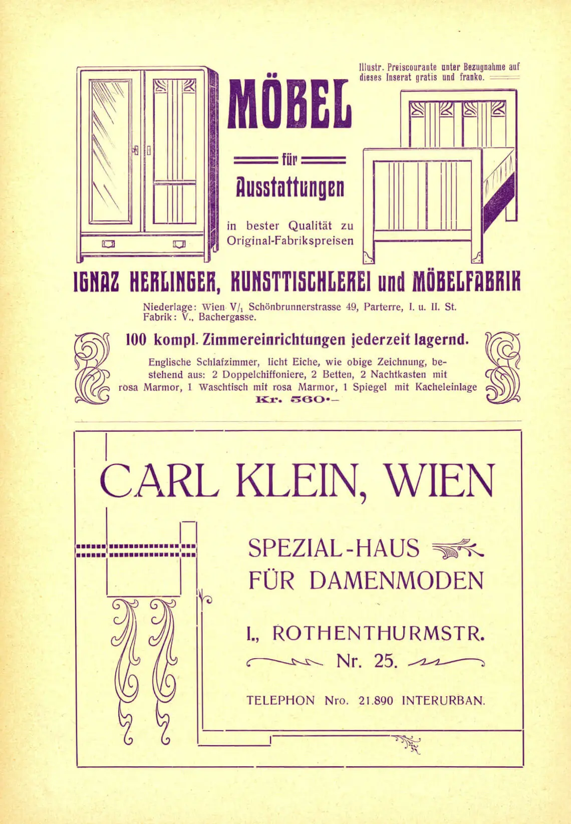 Da die Einrichtung der ehelichen Wohnung und der dafür notwendige Hausrat einen ganz wesentlichen Aspekt der Hausstandsgründung ausmachten, bezieht sich ein großer Teil der im Album abgedruckten Annoncen auf diese Bereiche. Damals zogen Brautpaare grundsätzlich erst nach der Hochzeit in einen gemeinsamen Haushalt. Insofern ist nachvollziehbar, dass es ein starkes Interesse gab, ganze Garnituren zu erwerben und die Möbelhersteller zur Besichtigung häufig „vollständig eingerichtete Interieurs“ anboten – wie das Möbelhaus Gustav Wallis, das eindrucksvolle „300 Zimmer“ von 280 bis 3.000 Kronen vorrätig hielt und komplette Wohnungs- und Villeneinrichtungen anbot. Zudem entsprach der einheitliche Stil dem Geschmack der Zeit. Auch andere zeitgenössische Moden werden in den Werbeanzeigen sichtbar, etwa die Vorliebe für historisierende Möblierung. So verweist der Tischler und Tapezierer Josef Koblitz in der Siebensterngasse auf sein „Grosses Lager in altdeutschen Speise- und Schlaf-Zimmern, sowie Salon-Garnituren“. Beliebt war außerdem Exotisches, wie zum Beispiel „orientalische“ Herrenzimmer, Chinoiserien oder Perserteppiche. An Modernem gab es das, was heute als Jugendstil bekannt ist.