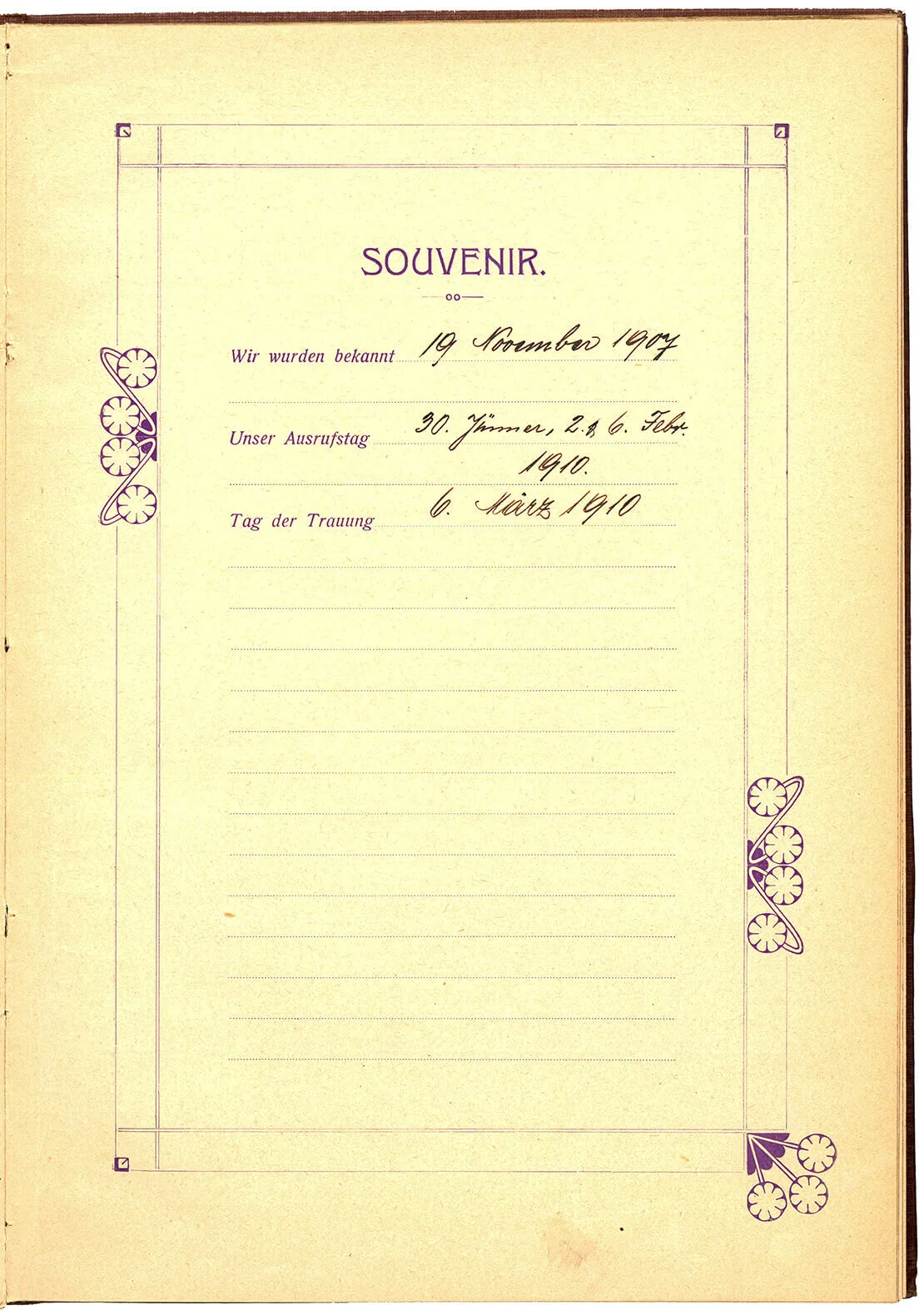 Ein Teil des Albums ist mit handschriftlichen Einträgen der Braut- und späteren Eheleute versehen. Das erste dieser Blätter trägt die Überschrift „Souvenir“ und vermerkt den Tag des Kennenlernens (19. November 1907), die Ausrufstage (30. Jänner, 2. und 6. Februar 1910) und den Tag der Trauung (6. März 1910, ein Sonntag). Das Paar war eines von 18.713 Paaren, die 1910 in Wien die Ehe schlossen und es zählte damit zu jenen 32 Prozent der Wiener Bevölkerung, die sich in diesem Jahr im verheirateten Familienstand befanden. Nicht zuletzt wegen den sehr beschränkten beruflichen Möglichkeiten bedeutete die Verehelichung für bürgerliche Frauen damals eine der wenigen Versorgungsmöglichkeiten, entsprechend wichtig waren gesellschaftlicher Status, Einkommens- und Vermögensverhältnisse bei der Wahl eines Ehemannes. Bei der Frau galten sittliche und moralische Untadeligkeit sowie Schönheit als wichtige Faktoren.