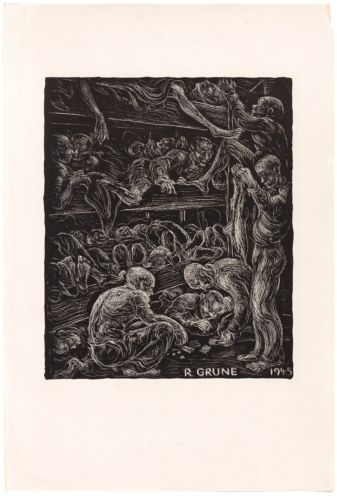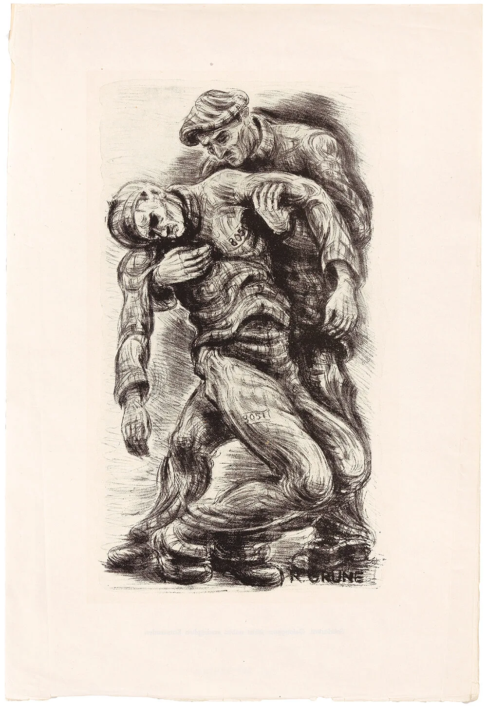 Grunes eindringlichen Darstellungen von ausgemergelten Körpern, die tot in Stacheldrahtzäunen hängen, von Männern, die Körper an Körper in den engen Stockbetten der Baracken fast zu einer amorphen Masse verschmelzen oder von geknechteten Häftlingen, die sich mit letzter Kraft aufeinander stützen, wurden ikonisch: Viele dieser Motive meint man zu kennen, auch wenn die Geschichte dahinter im Verborgenen bleibt.