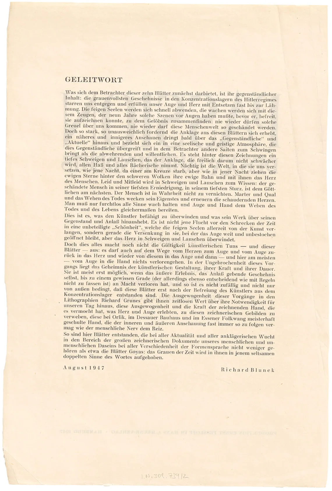 Richard Grune, 1903 in Flensburg geboren, studierte am Bauhaus in Weimar und hatte in den 1920er-Jahren erste künstlerische Erfolge. Als politischer Gegner der Nationalsozialisten engagierte er sich im linken Widerstand und fertigte Zeichnungen und Grafiken für dessen illegale Publikationen an. Anfang Dezember 1934 wurde er in Berlin wegen homosexueller Handlungen nach § 175 des reichsdeutschen Strafgesetzes verhaftet und ohne Verfahren mehrere Monate im KZ Lichtenburg inhaftiert. Erst 1936 wurde er rechtskräftig verurteilt und nach der Verbüßung der Gefängnishaft als „Schutzhäftling“ ins KZ Sachsenhausen eingeliefert.