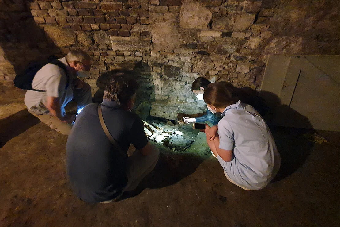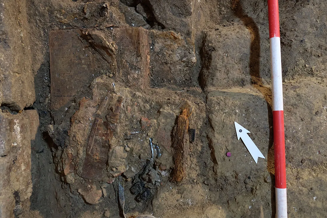 Eine nicht minder historisch relevante und tragische Geschichte präsentierte die erweiterte Grabungsfläche. Die Druckschriften fanden sich nicht wie für eine geplante Deponierung anzunehmen gestapelt, sondern ungeordnet oder verstreut unter dem Lehmboden in einer Art „Baugrube“ einplaniert. Was hier vor uns lag, war damit etwas bereits Entdecktes, dessen man sich wieder entledigte – und ein neues Rätsel für uns: Was war geschehen und wer steckte dahinter?