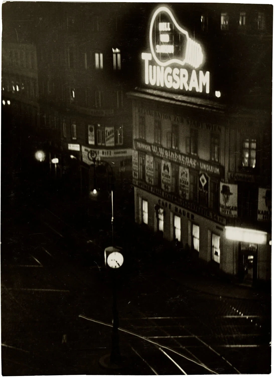 Auch an den Abenden und schon an späten Winternachmittagen geschieht eine Verwandlung mit der Stadt. Wenn einer mit der Straßenbahn jetzt stadtwärts fährt – mit „Stadt“ bezeichnete der gelernte Wiener immer die Innenstadt – ist das was er sonst schon aus Gewohnheit gar nicht mehr beachtete: die Häuserfronten mit den vielen Fenstern, hinter denen die Menschen wohnen, essen und schlafen und unten die kleinen Läden mit ihren bescheidenen Auslagen, sie sind alle verschwunden. Die gewohnten Straßen und Plätze sind jetzt nur mehr der Tageserinnerung bekannt. Denn wo einmal Häuser standen ist jetzt nur ein Lichterspiel. Lichtsäulen in grellen Farben steigen hoch in den Himmel, rote, blendend weiße und blaue Lichtbalken legen sich quer. Wenn sie nur alle feststünden und so ein starres Gerüst für etwas Unbekanntes bilden würden wäre es schon recht. Jedoch in zitternden Bewegungen kriechen da und dort Lichtfunken hoch, erlöschen plötzlich wieder und klettern schon wieder hoch, sodass da überall ein bebendes Flirren ist.