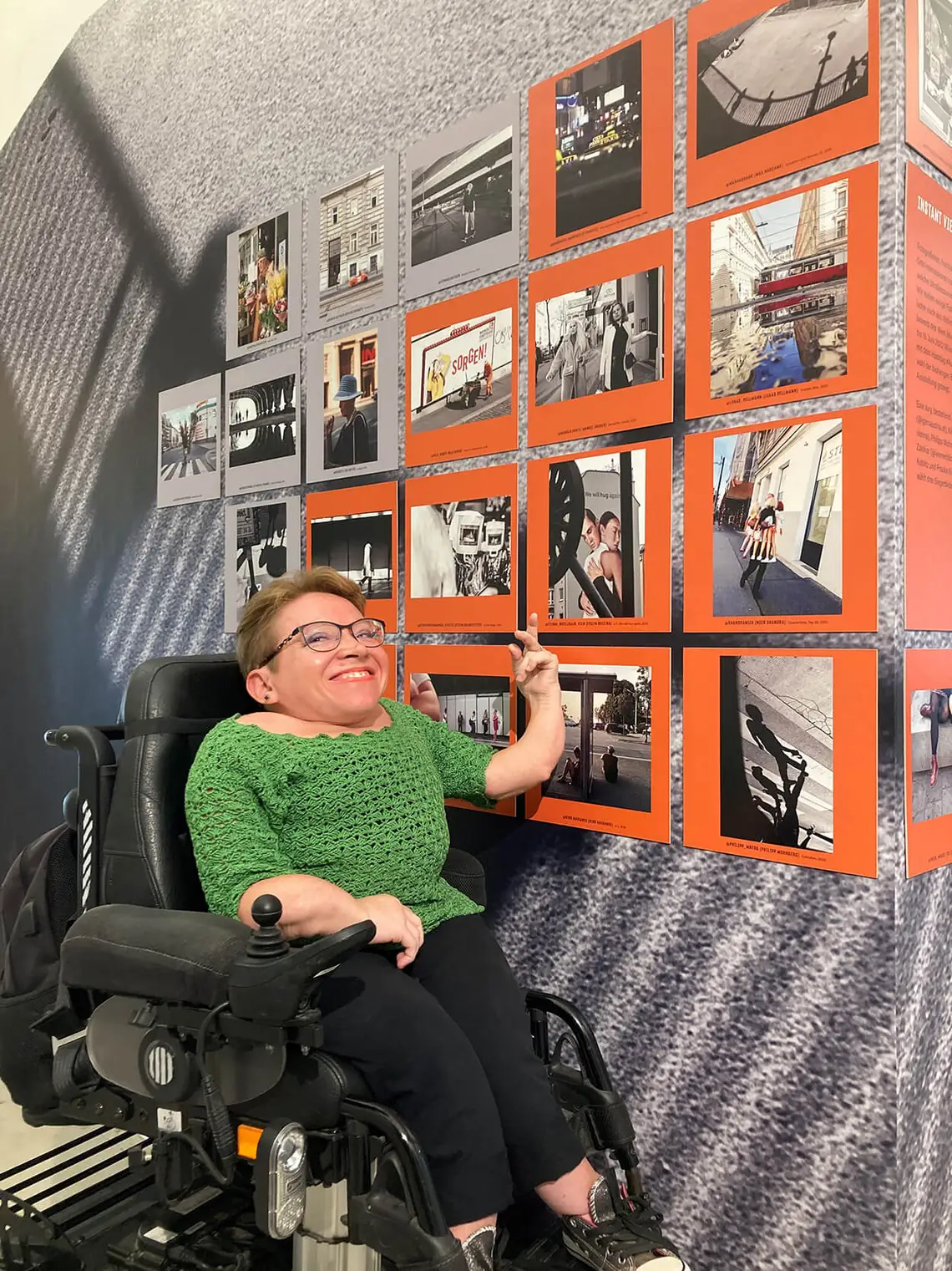 Längeres Sitzen war für Evelyn eine körperliche Anstrengung, daher beschränkten sich ihre Ausflüge auf zwei Stunden. Was sich innerhalb dieser Zeit gut erreichen ließ, wurde stets fotografisch dokumentiert: die Wiener Innenstadt, der Karlsplatz und ihr eigenes Grätzl Margareten. Das Außergewöhnliche im Alltäglichen zu entdecken, war ihr Motto und andere Menschen damit zu begeistern und vielleicht auch anzustecken, ihr erklärtes Ziel.
