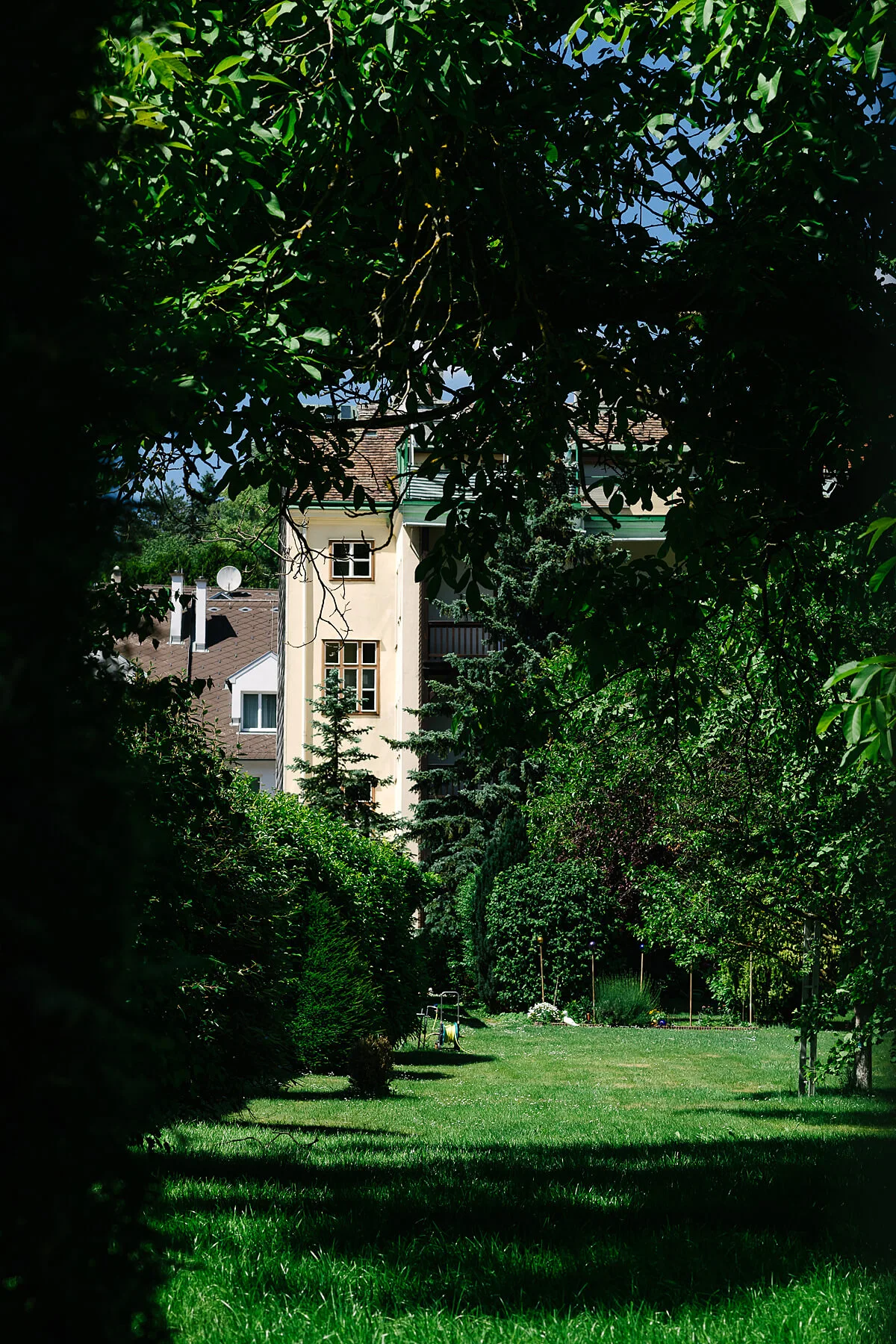 Der Blick Richtung Garten und Wald ist nahezu derselbe, auch die Nachbarschaft hat sich kaum verändert (statt einer Lagerhalle rechts ist nun zum Beispiel eine „Hofer“-Filiale, aber immerhin nur in etwa gleicher Größenordnung). „Hinten im Garten gibt´s ein Tor mit einer Beschriftung Sanatorium. Durch dieses Tor sind Dora Diamant und Robert Klopstock mehrmals täglich gegangen, über die Brücke über den Bach und dann runter ins Dorf, etwa zur Post oder um Besucher abholen", so Müller. Welches Zimmer Kafka bewohnt hat, ist heute nicht mehr zu eruieren – die historischen Quellen geben hier widersprüchliche Hinweise. Sicher ist, dass er im 2. Stock wohnte, wo sich auch die Gedenkräume befinden; der Rest ist nach wie vor Wohnhaus.