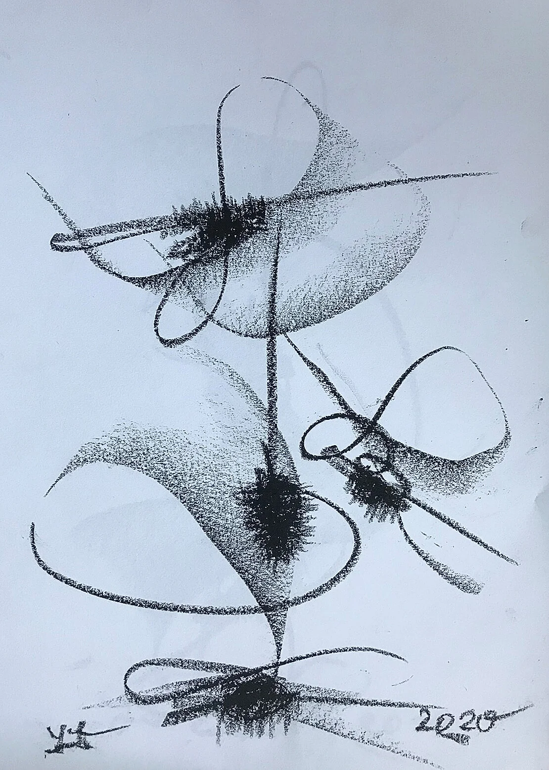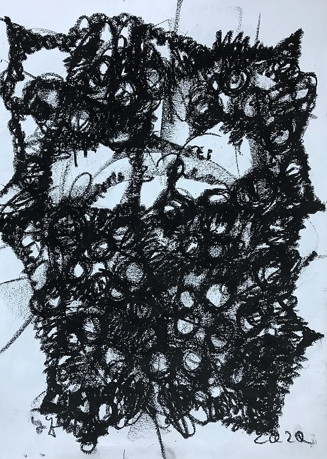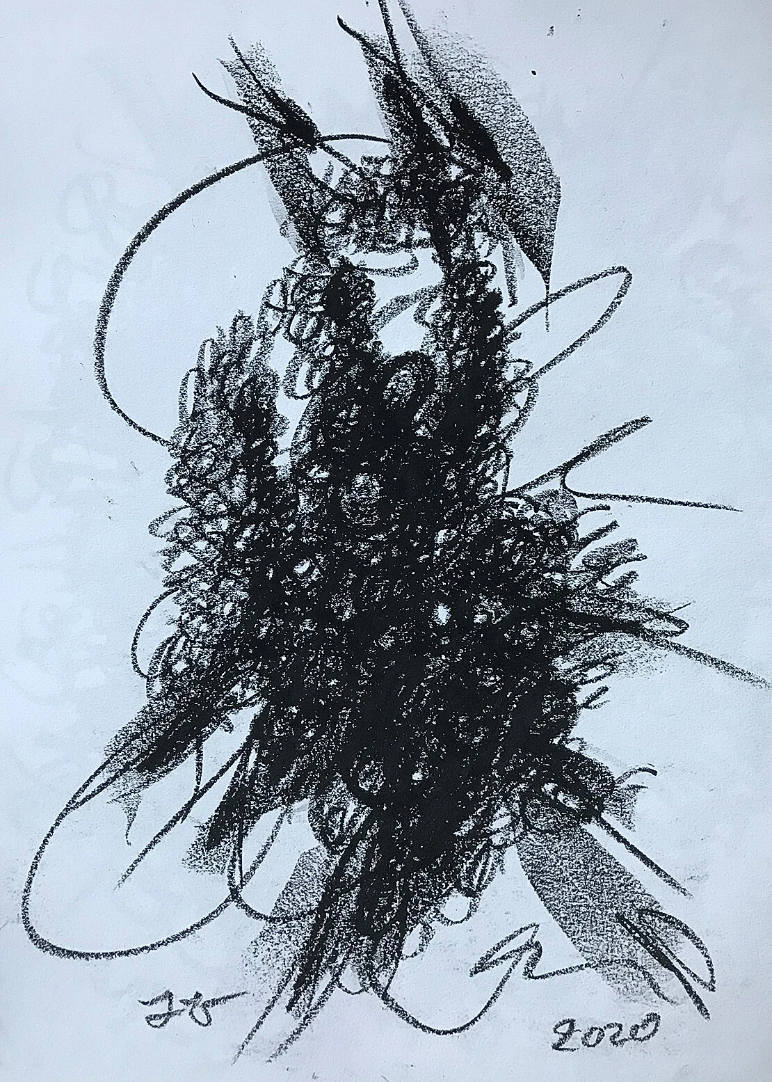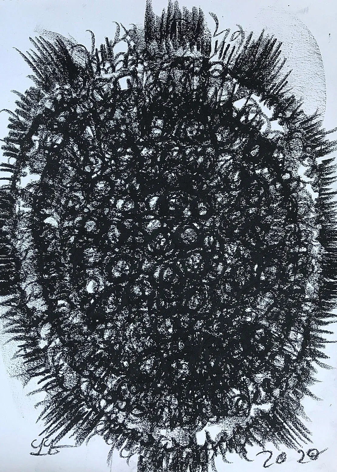 Lieselott Beschorner, eine Doyenne der Wiener Kunstszene, hat im 93. Lebensjahr eine neue Serie von Zeichnungen begonnen. Dieser Zyklus, der sich dem Virus widmet, vergrößert sich angesichts ihrer fast manischen Arbeitsschübe sehr schnell und vermittelt eine gute Vorstellung vom psychischen Druck, den diese Situation bei ihr auslöst. Leslie De Melo, gleichfalls ein Zeichner von hohen Graden, arbeitet bedachtsam und in ruhiger Konzentration am selben Thema. Er konfrontiert den menschlichen Körper direkt mit dem Virus, das sich allmählich seiner bemächtigt und ihn im wörtlichen Sinn einnimmt. Beide arbeiten mit einer Übersetzung der Krise von außen nach innen.