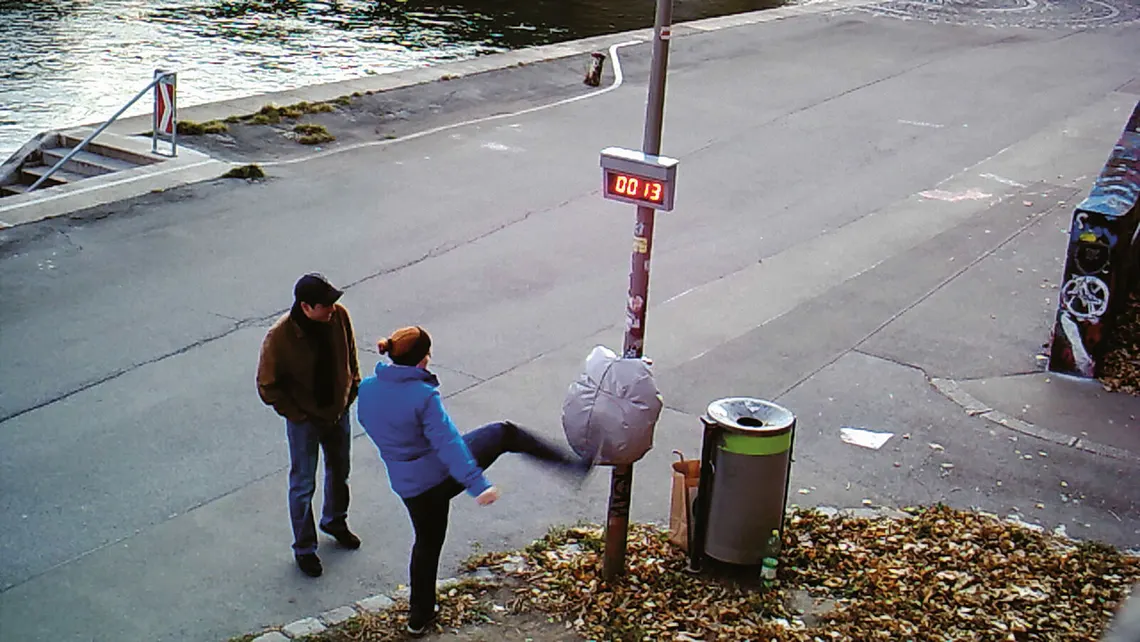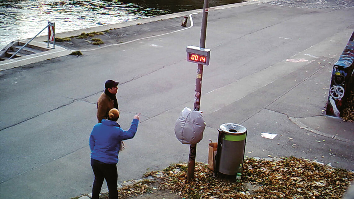 Ich glaube, Wut ist nicht unbedingt die Hauptmotivation. Es ist eher die Möglichkeit, überhaupt etwas physisch, aktiv zu tun – und etwas reagiert darauf. Der „Antagometer“ bezieht sich formal auf diese Boxmaschinen im Prater – bei denen wird aber die Stärke gemessen, mit der man da reinhaut oder reintritt. Mein Objekt ist bauchartiger und auch in Bauchhöhe installiert. Ein weiterer Unterschied ist, dass einfach jeder Impact gleich zählt, das kann auch ein Kind auslösen. Egal wie stark du reintrittst oder schlägst, es wird immer eins weiterzählen. Das heißt, es ist keine individuelle Zahl, sondern du wirst einfach Teil einer Statistik – das könnte jemanden tatsächlich wütend machen, dachte ich. Ich habe ihn beim Donaukanal installiert, sozusagen in einer Alltagssituation. Der Zähler stand nach vier Tagen auf 125. Die Arbeit wurde von Passant:innen gerne genutzt, von Männern, Frauen, Jung und Alt. Nach einer Demonstration gegen die Corona-Maßnahmen auf der Ringstraße hatte ich innerhalb von einer Stunde 600 Hits. Einmal wurde so fest reingetreten, dass der Boxsack sich gelöst hat. Als ich mit meinen Schraubenschlüsseln ankam, waren schon Leute mit dem Leatherman dabei, ihn selbst wieder anzuschrauben. Die sagten dann zu mir: „Ah, ist das von dir? Super!“ Das Kompliment hat mich schon sehr gefreut, muss ich zugeben. Mir wird ja oft unterstellt, dass ich irgendwelche anarchistischen Antriebe hätte. Aber es ist tatsächlich umgekehrt. Für mich ist es eine albtraumhafte Vorstellung, wenn die Institutionen, die ich auf die Probe stelle, nicht mehr funktionieren würden. Was wäre, wenn es sie nicht gäbe, wenn tatsächlich das Recht des:der Stärkeren herrscht? Zumindest hierzulande ist das noch nicht ganz der Fall.