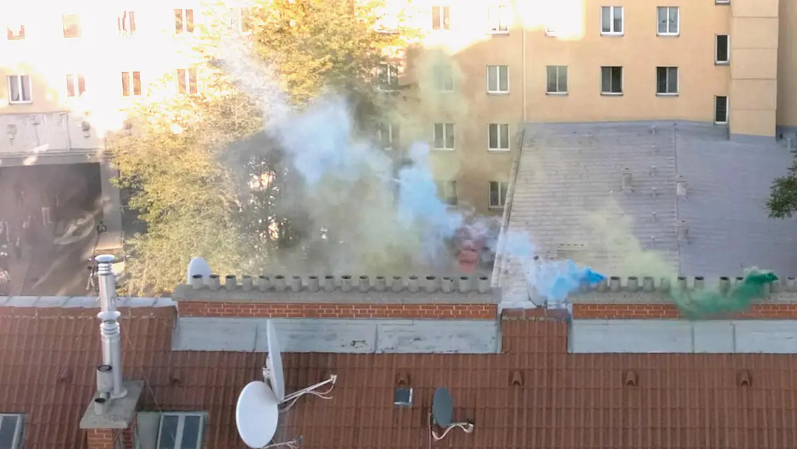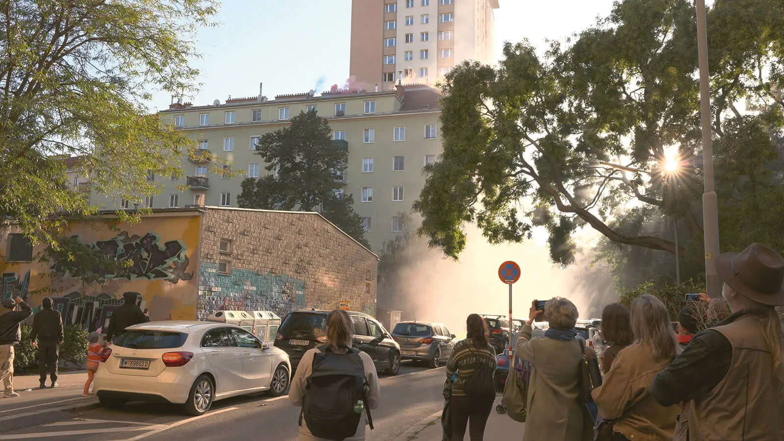 Das stimmt. Bei meinen Rauch-Arbeiten („Alternative Smoke“, Belfast, 2024, und „Rauch- Show“ Theodor-Körner-Hof, Wien, 2024) individualisiere ich sozusagen die Emissionen. Zunächst in Reihenhäusern in Belfast und dann in Wien im Gemeindebau. Das ist in gewisser Weise die Komplementärarbeit zu RAL 9006, insofern Individuen hier die Chance bekommen, sich durch eine Farbe zu unterscheiden. Mich haben in Belfast, wo ich gemeinsam mit Shiro Masuyama ein Ausstellungsprojekt realisierte, sofort diese Straßen mit den fast identischen zusammengeklebten Häuschen fasziniert. Jedes hat auf dem Dach so viele Schornsteine, wie es Zimmer hat. Diese immer kleineren Einheiten der Gesellschaft: Straße, Haus, Schornstein. Gemeinschaft, Familie, Individuum. Ich hatte dann die Idee, den Rauch einzufärben, um ein Bild von einer Unterschiedlichkeit in dieser Gleichheit zu erzeugen. In Nordirland kommt noch dazu, dass dort alle Farben politisch besetzt sind. Der Bürgerkrieg hat dazu geführt, dass die Wohnviertel alle strikt aufgeteilt sind. Der Rauch überwindet diese Grenzen mühelos, aber er löst sich natürlich auch auf, wird weniger intensiv und vermischt sich mit anderem Rauch. In Wien im Theodor-Körner-Hof bin ich ähnlich vorgegangen, das sind zwar keine Reihenhäuser, sondern ein Block. Aber oben auf dem Dach ist eine Vielzahl von Schornsteinen aufgereiht, die ich auch mit den einzelnen Bewohner:innen assoziiere. Dort habe ich eine Art Show veranstaltet, in der jede Primär- und Sekundärfarbe einem einzigen Rauchfang zugeordnet war, Schwarz und Weiß dagegen tauchten bei verschiedenen Rauchfängen auf. Die Show folgte unbewusst einer gewissen Hollywood-Dramaturgie, fürchte ich.