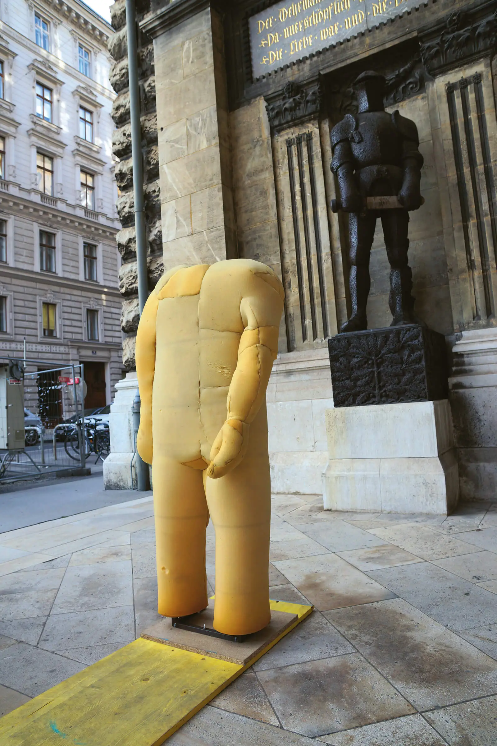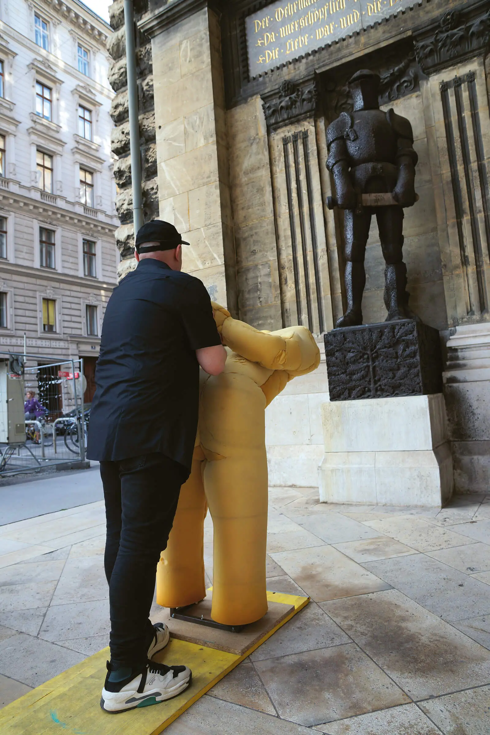 Ich habe ihn mal temporär in Praternähe getestet. Das war ein Trick, weil ich davon ausging, dass die Leute, die aus dem Prater kommen, ein bisschen aufgeputschter sind als normale Passant:innen. Der rechte Arm ist relativ markant ein bisschen nach hinten gelagert. Tatsächlich haben manche Leute angefangen, an diesem Arm herumzuwerkeln. Die Gelenkfunktion ist aber dermaßen eingeschränkt, dass sich der Arm eigentlich nur nach hinten verdrehen lässt. Wenn man das vehement genug macht, beugt sich der Oberkörper nach vorn. Das heißt, man landet dann eben fast automatisch bei diesem Polizeigriff, den jede:r kennt, ohne dass man das vorher vielleicht intendiert hat. Aber man muss auch nicht, manche lehnen sich einfach an, er ist weich – aus Schaumstoff – und gibt nach.