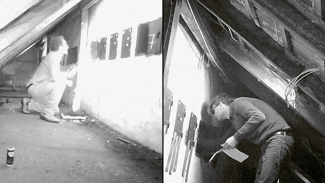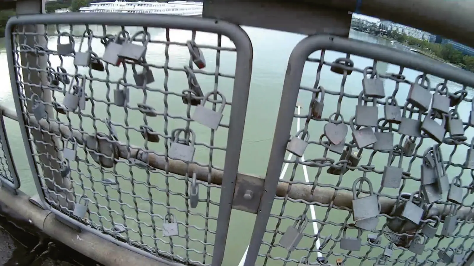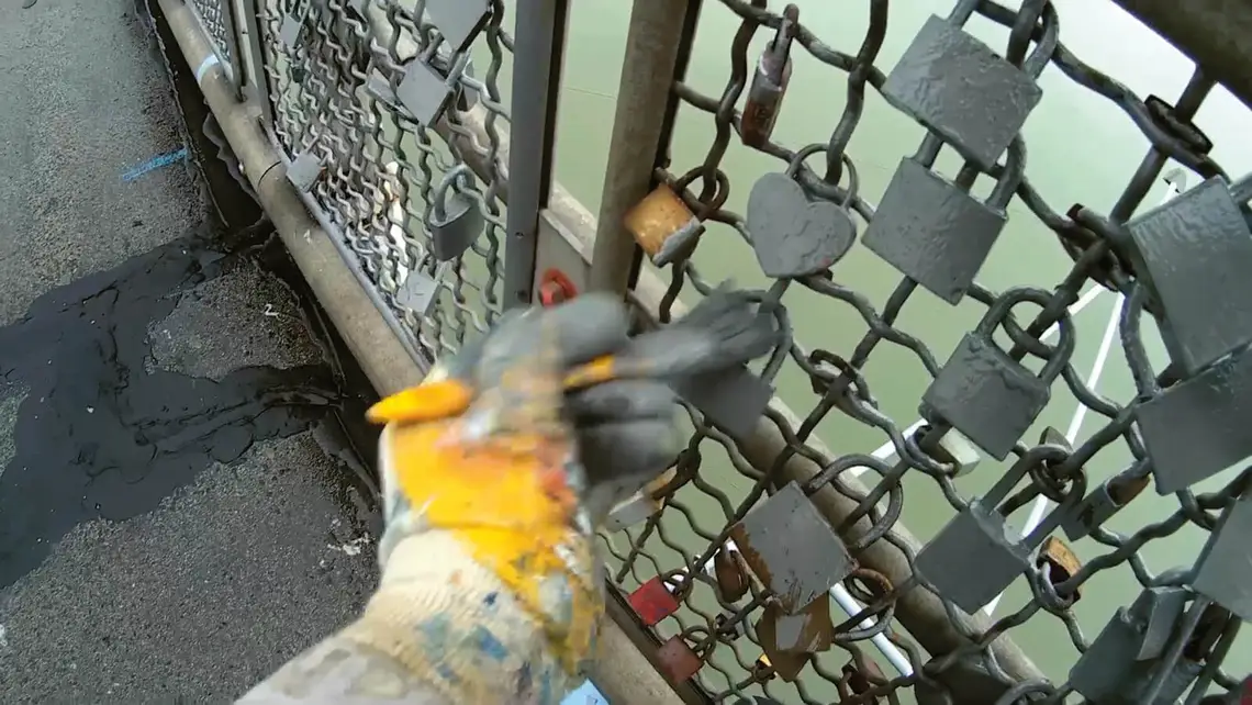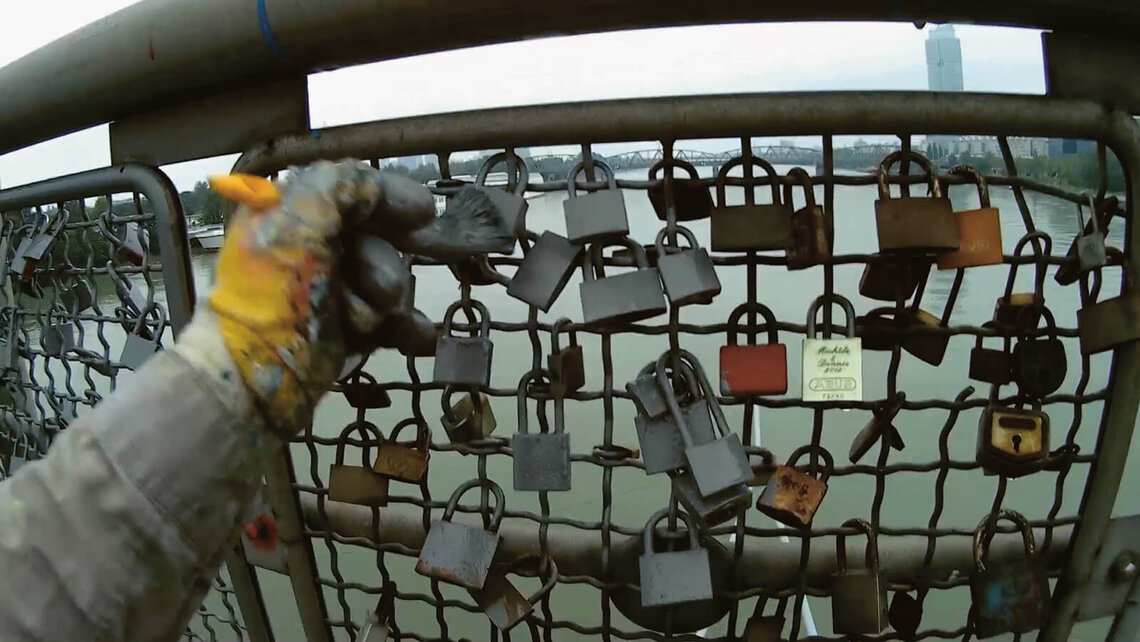 Das Brückengeländer ist einerseits öffentlich, öffentliche Infrastruktur. Nun sind die einzelnen Schlösser aber ohne Genehmigung und auch rein privat motiviert aufgehängt worden. Indem ich sie im Farbton des Brückengeländers streiche, gemeinde ich sie quasi ein. Das Video fängt damit an, dass ich das Brückengeländer streiche. Dann kommt das erste Schloss daher und wird mitgestrichen. Irgendwann werden es mehr Schlösser, es wird immer hektischer, und es geht offensichtlich immer mehr nur um die Schlösser, die alle vereinheitlicht werden. Aber ich finde, es ist ein interessanter Widerstreit zwischen meinem unbefugten Drüberstreichen und dem unbefugten Schlösserhängen.