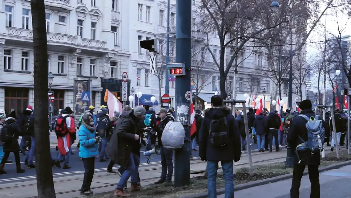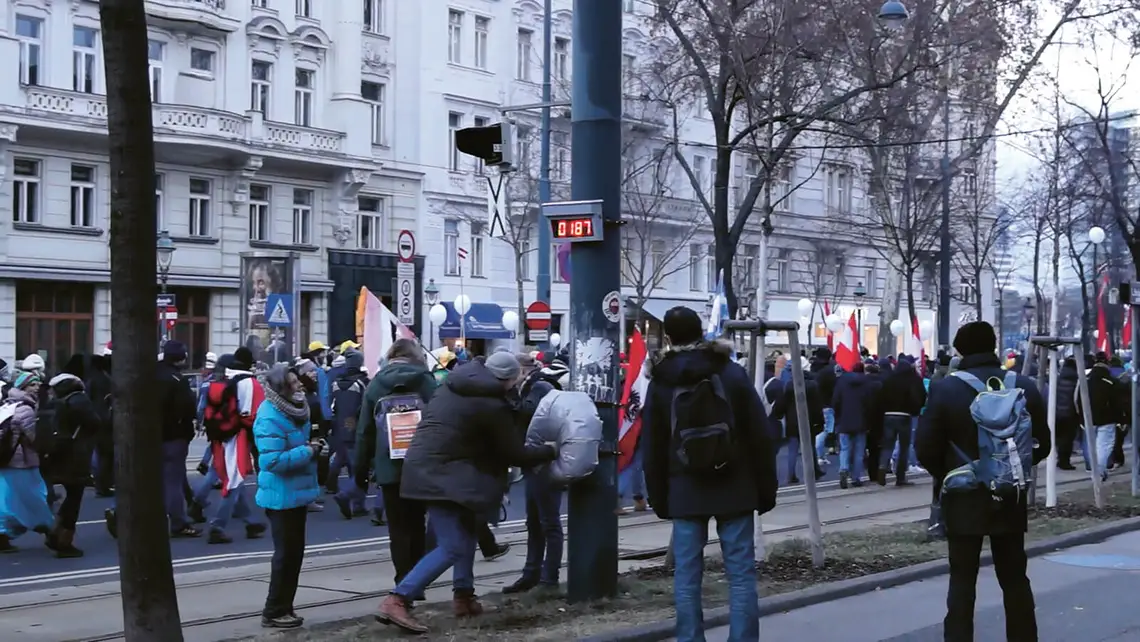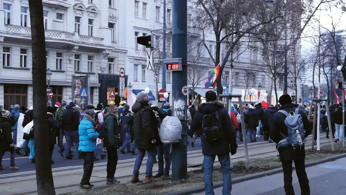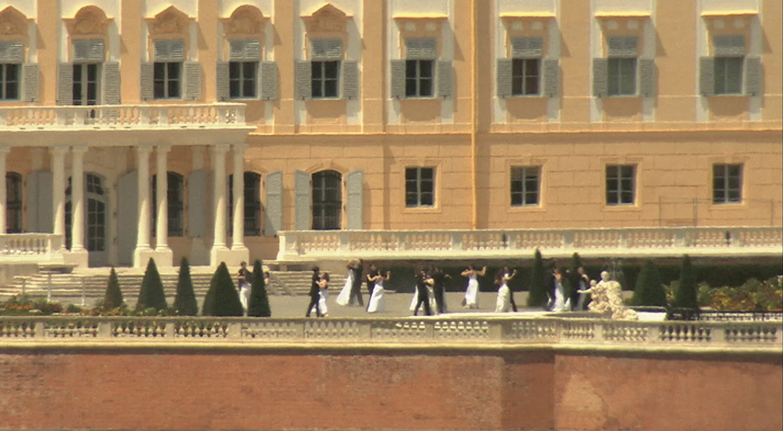 Stimmt. Die Arbeit ist aus dem Jahr 2008. Aber sie ist, finde ich, interessant gealtert. Ausgangspunkt war die TV-Übertragung des Neujahrskonzerts, das wird ja in achtzig Ländern ausgestrahlt. Da wurde eine Walzerszene vor Schloss Hof gezeigt – das typische Österreichklischee. Ich habe die Szene mit Paaren aus einer privaten Tanzschule wieder aufgeführt. Gefilmt habe ich sie allerdings von einem Hügel in der benachbarten Slowakei aus mit einem ziemlich argen Zoom-Objektiv. Die Kamerafahrt beginnt bei sozialistischen Plattenbauten auf der slowakischen Seite, verläuft dann ohne Schnitt über die March, die Grenze zu Österreich, und zoomt auf die Walzertanzenden vor dem Barockschloss. Ich finde, dass dieser Aspekt des Neofeudalen heute noch mehr zutage tritt, wenn man von Milliardär:innen hört, von Leuten mit unglaublichem Reichtum, Unternehmer:innen und Diktator:innen und Politiker:innen, die offenbar die Weltherrschaft unter sich aufteilen. Und wir haben hier die historischen Relikte des Originalfeudalismus, aber die werden nur touristisch verniedlicht und nicht als Drohung verstanden. Weil der Closeup über fast zwei Kilometer gezoomt ist, ergibt sich ein gewisses Luftflimmern, das hat ein bisschen was Fata-Morgana-artig Surreales, was mir sehr gut gefällt. Diese Szene, ca. 15 Sekunden, wird in der Ausstellung übrigens dreimal in der Stunde – sozusagen als Intervention – auf alle Monitore und Projektionen übertragen („Video—Interruption“, 2025).