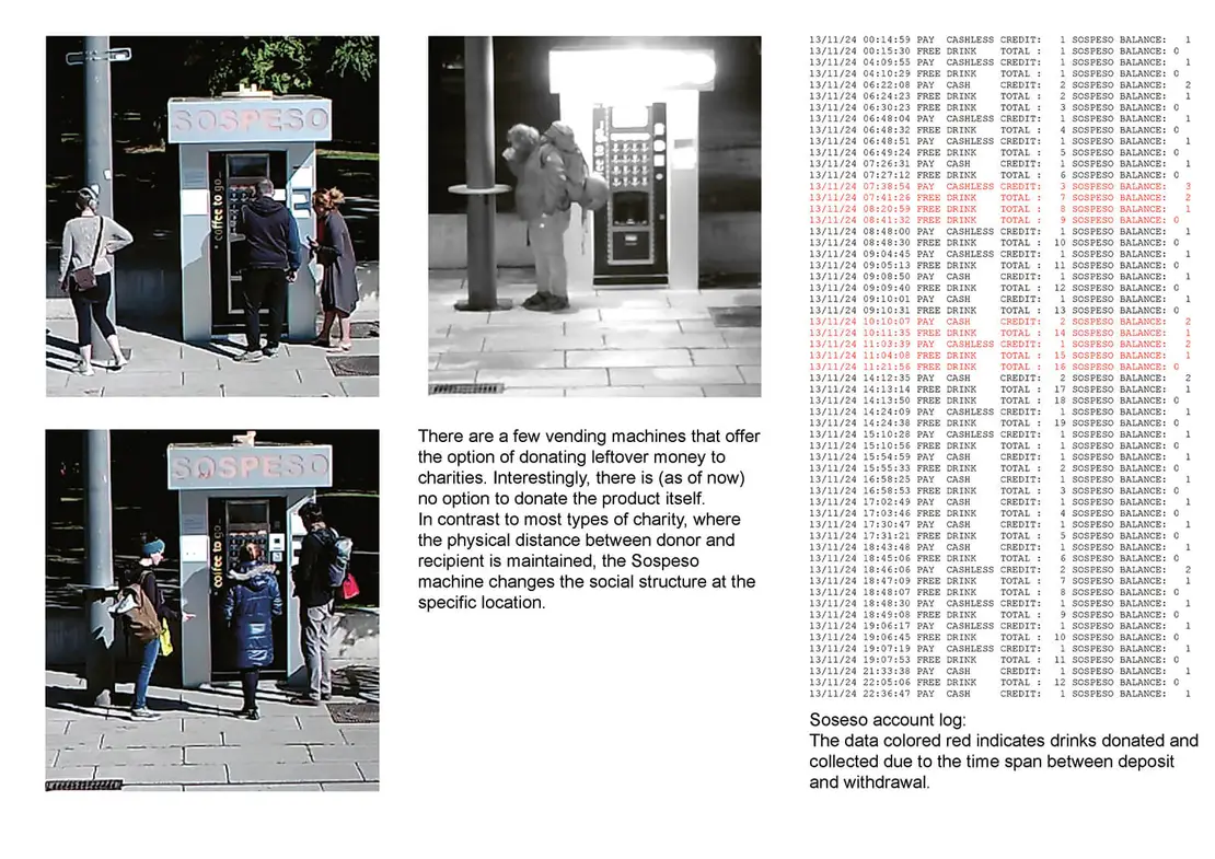 Ja, noch genauer Automatenkaffeeliebhaber:innen. Das schließt schon ein paar Menschen aus, aber im Gegensatz zu Bier- oder Schnapstrinker:innen bieten sie keine Angriffsfläche, weil sie zum Beispiel nicht betrunken werden. Man wird sie nicht so leicht los, ein öffentliches Kaffeetrinkverbot wäre doch ziemlich radikal. Die Idee von Automat „Sospeso“ ist ja unter anderem, dass er unterschiedlich wohlhabende Menschen an einen öffentlichen Ort bringt. Normalerweise findet Charity möglichst distanziert statt. Man kann an der Supermarktkassa aufrunden, aber nicht den Menschen hinter dir in der Schlange etwas Gutes tun. Charity scheint immer einen Abstand zu denen, denen geholfen wird, vorauszusetzen.