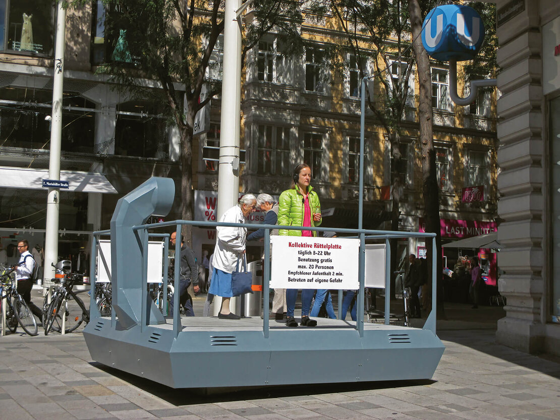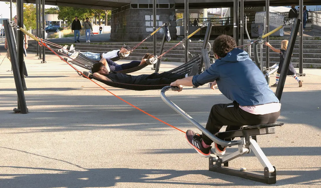 Dieses Verhältnis: drei Hängematten und ein:e Ruder:in, finde ich interessant, weil ja damit oft gesellschaftliche Gruppen gegeneinander ausgespielt werden, à la wie viele Werktätige müssen in zwanzig Jahren so und so viele Pensionist:innen durchfüttern. Die Anordnung von Körpern in einer solchen Synchronisierung interessiert mich, zum Beispiel auch auf der „Kollektiven Rüttelplatte“ (2015), wo alle physisch auf derselben Frequenz gerüttelt werden. Das kann man gewissermaßen als Voraussetzung für Kommunikation verstehen, als Stiften einer Einheit. Aber es kann auch als Disziplinierung gelesen werden, durch eine physische Kraft, die von außen kommt. Die Inspiration kam übrigens von Massagegeräten, die ja auch eine heilsame Wirkung haben sollen. „Hammock Synchronization“ verbindet das körperliche Training – das ja sehr ernst genommen wird, auch für das allgemeine Funktionieren in der Arbeitswelt – mit dem Bild des Ruhens. Manche sehen das Ruhen ja noch als Symbol für subversives Faulenzen, aber zugleich wird es mittlerweile als Fähigkeit erkannt, loszulassen. Das ist wiederum auch Voraussetzung, um nicht auszubrennen und damit erst recht wieder der Öffentlichkeit auf der Tasche zu liegen.