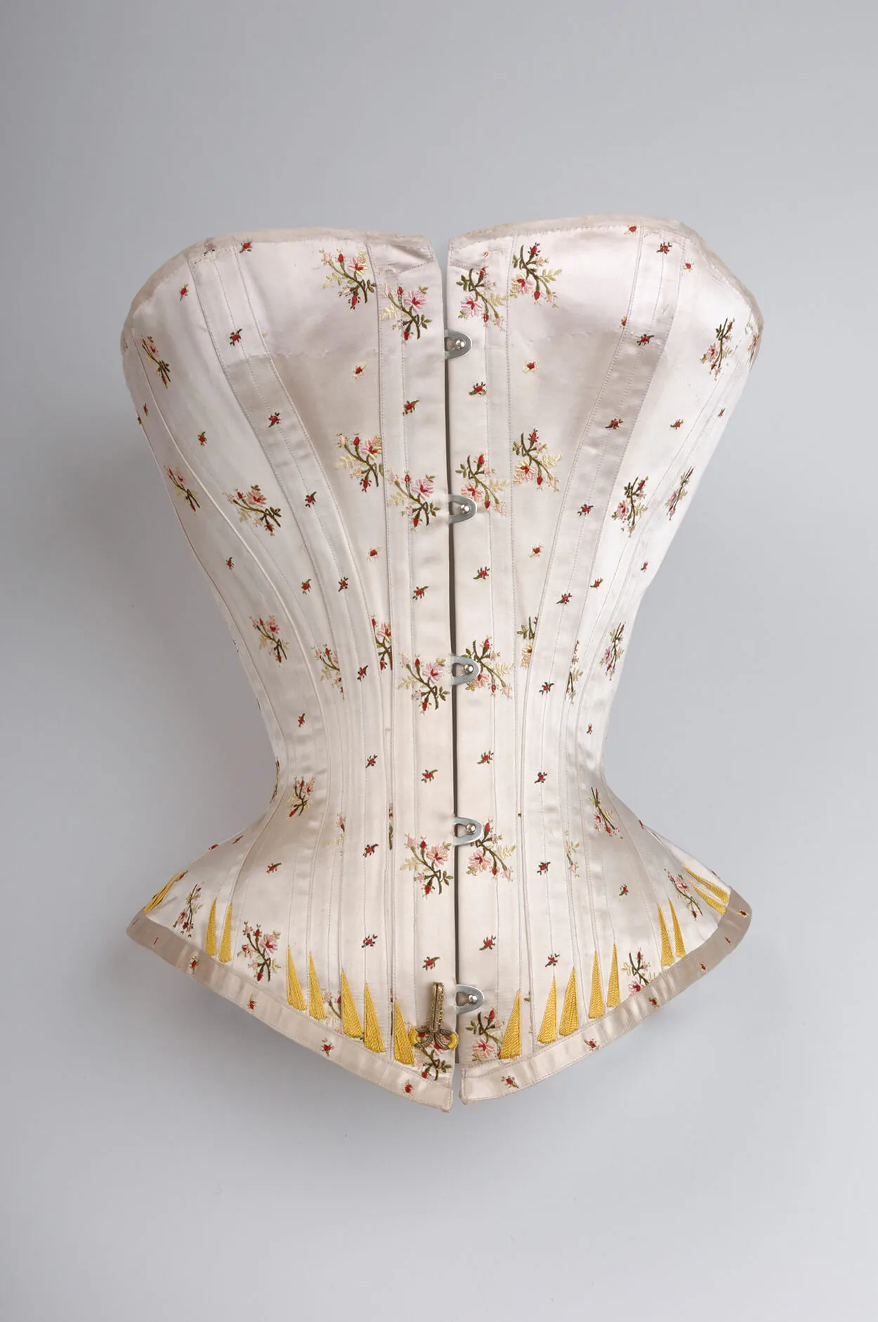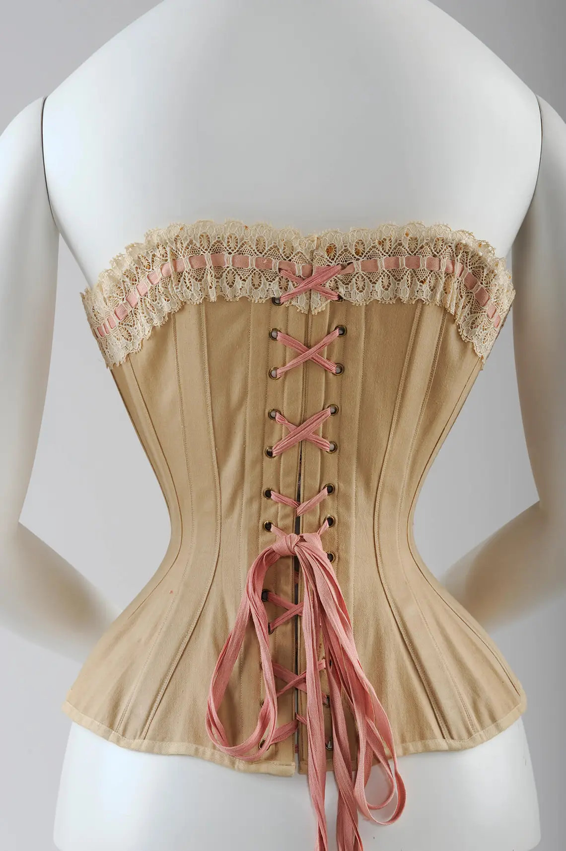 Typisch für das späte 19. Jahrhundert waren relativ langgezogene trägerlose Korsetts, die von oberhalb der Brust bis über die Hüften reichten. Meist aus mehreren Paneelen gefertigt, wurden sie vorwiegend an der Vorderseite mit Haken geschlossen und an der Rückseite geschnürt. Zusätzlicher unpraktischer Nebeneffekt dieses unbequemen und darüber hinaus die Bewegungsfreiheit einschränkenden Kleidungsstücks: Man konnte sich nicht alleine ankleiden, sondern benötigte für die Schnürung Hilfe von einer anderen Person.