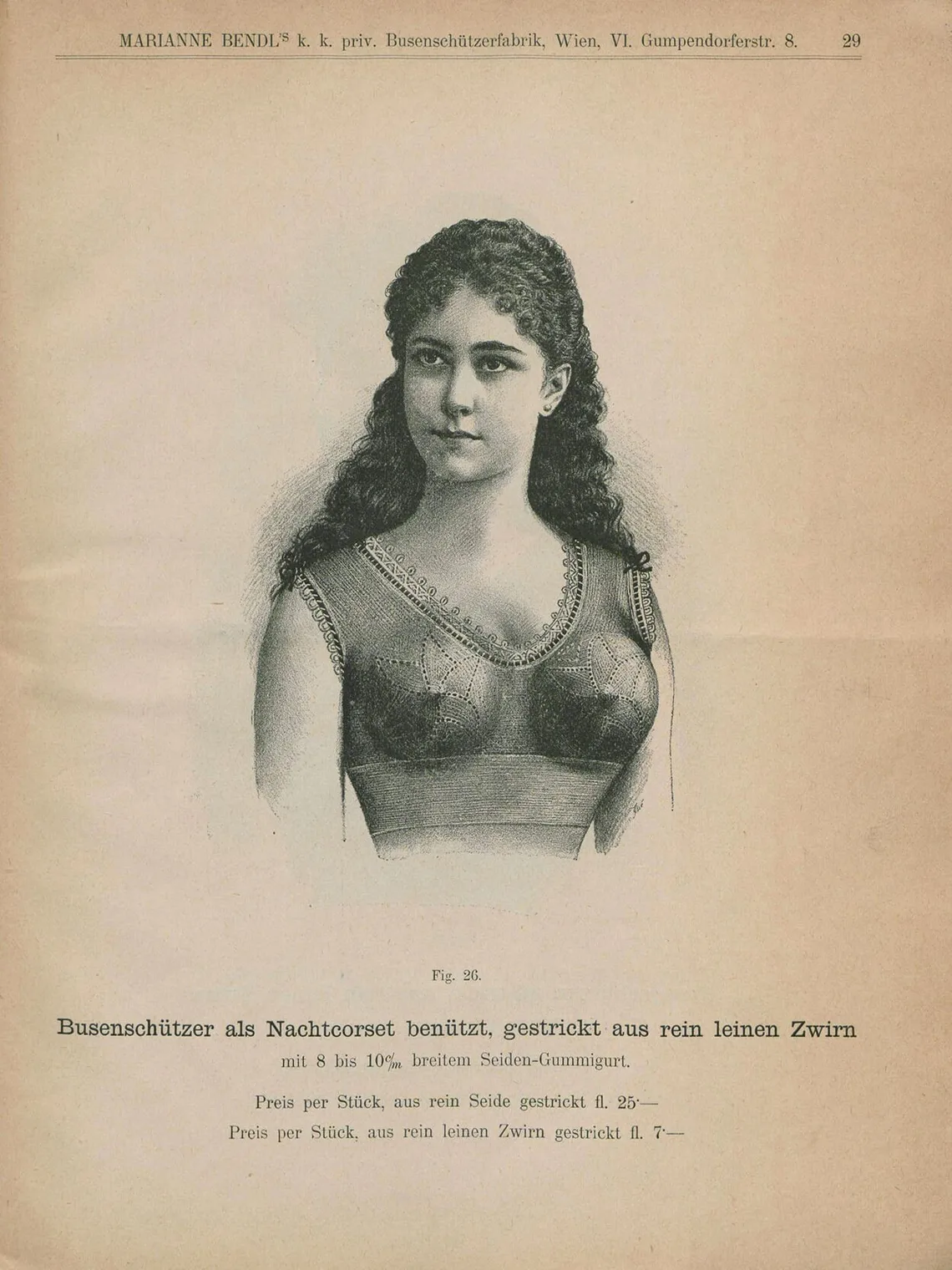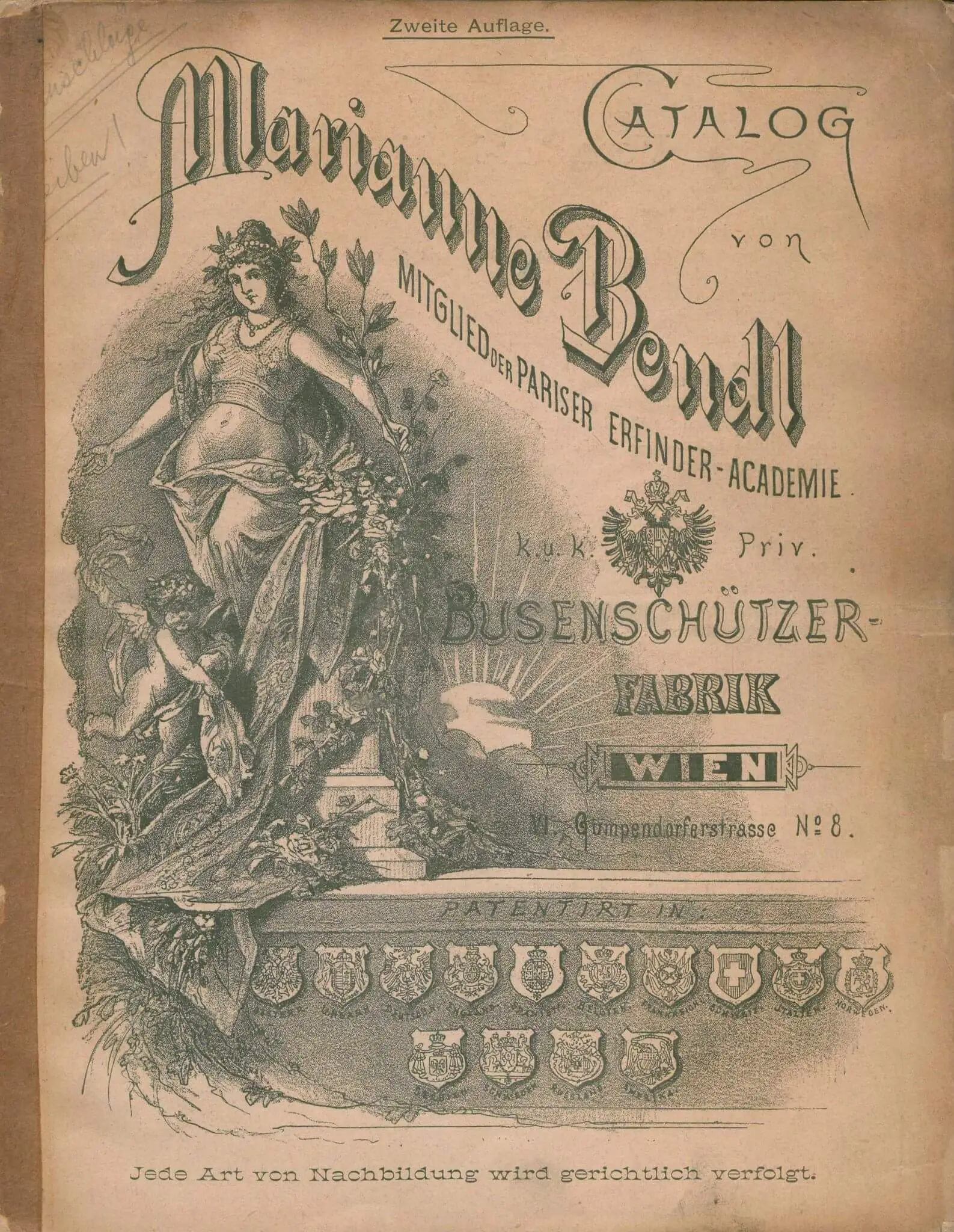 Catalog von Marianne Bendl, K.U.K. Priv. Busenschützer-Fabrik Wien, 1893, Rückseite, Universitätsbibliothek der Universität Wien